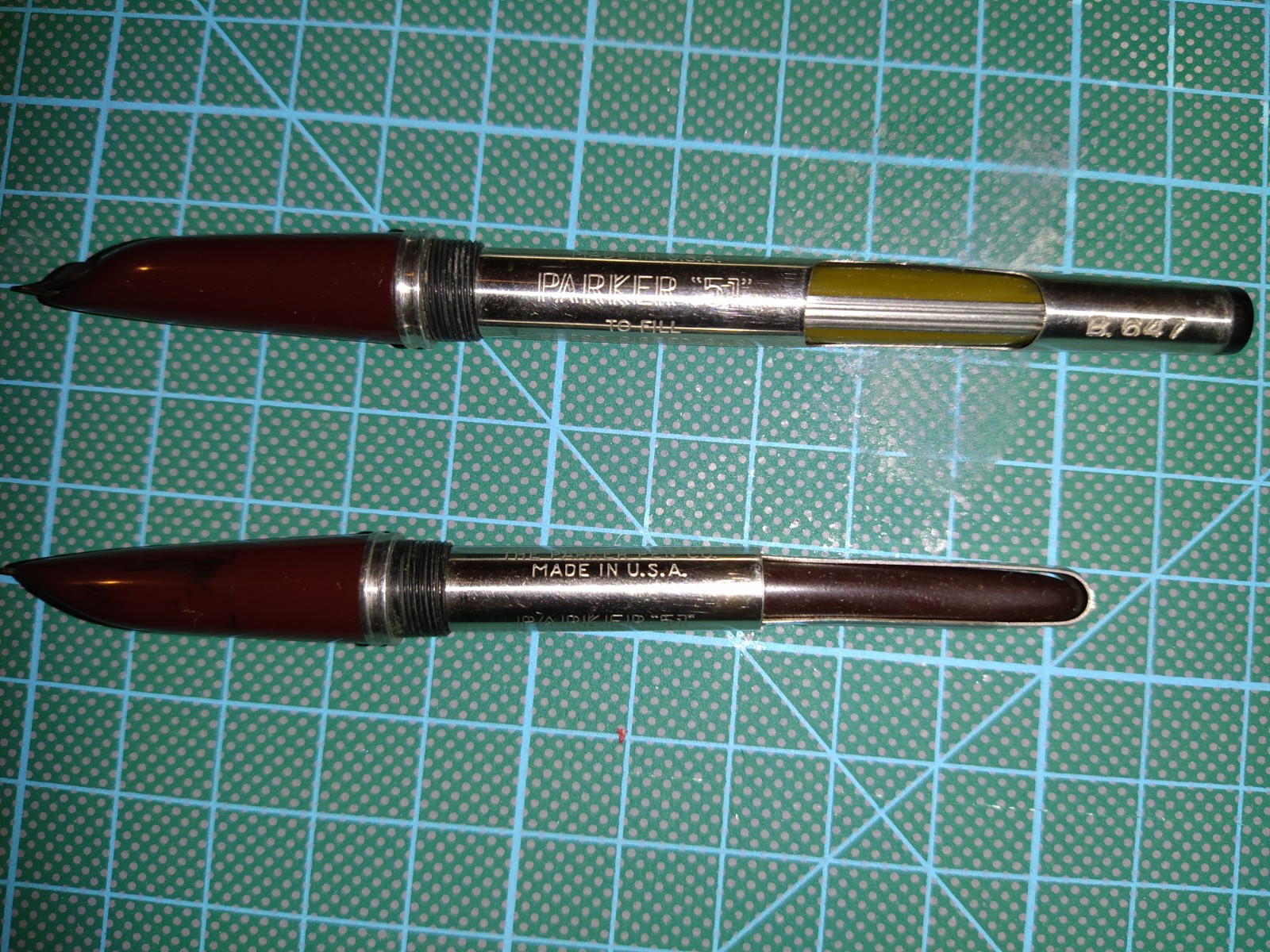 Mi sono capitate fra le mani due Parker 51 . La prima, nelle foto quella in alto e col cappuccio dorato, è corredata da tanto di certificato con relativo numero di serie e anno di produzione ( marzo 1953). Sulla seconda però nutro dei dubbi o comunque delle curiosità. E' più corta della prima e non ha lo stesso metodo di caricamento dell'inchiostro. Qualche volenteroso avrebbe voglia di "scrostarmi l'ignoranza" in merito ?