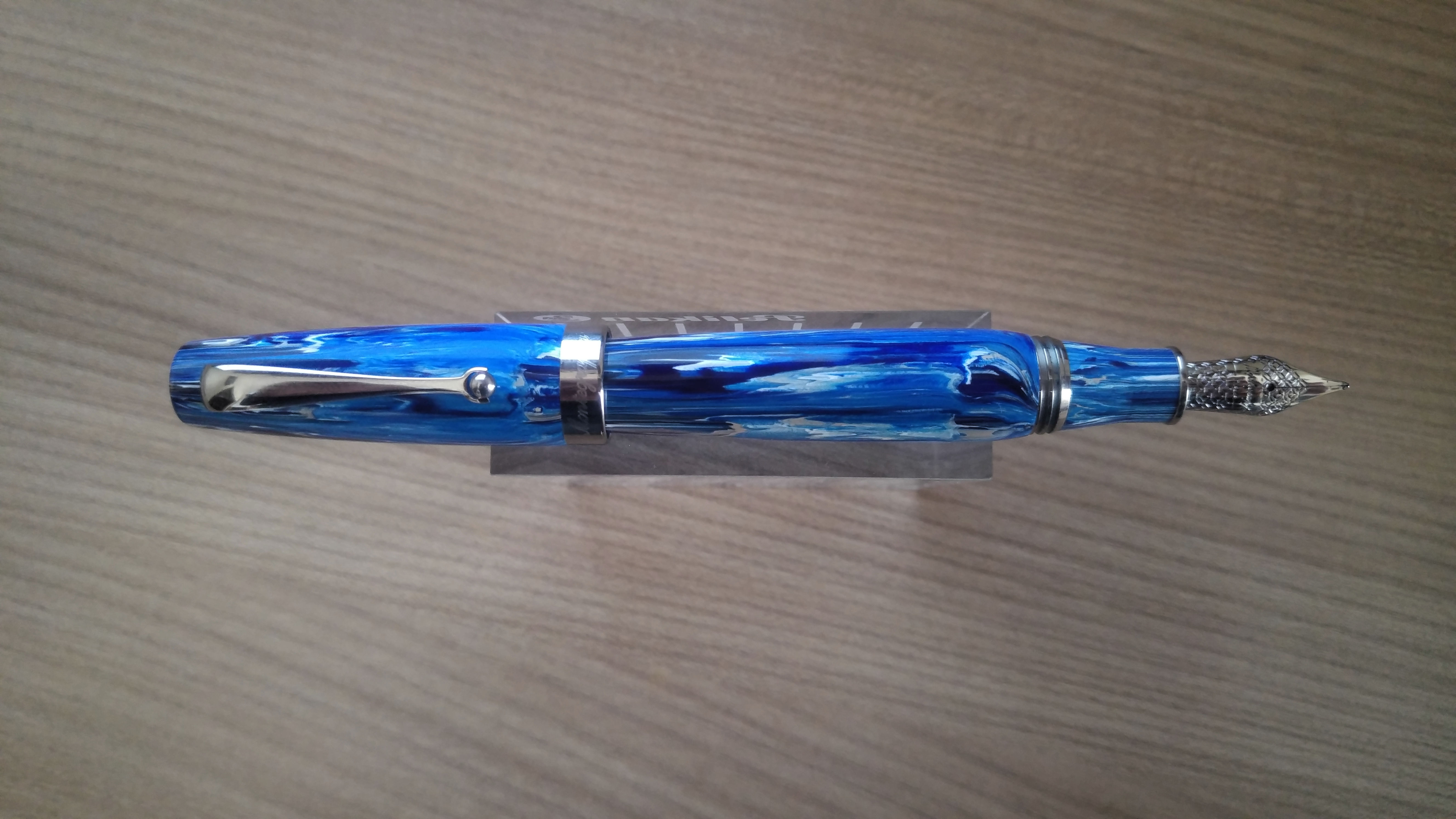 Il pennino in acciaio è un nr. 6 con una bella lavorazione, mentre l'alimentatore è in plastica, ma la cosa davvero piacevole è che la penna scrive davvero bene, e ha scritto appena tirata fuori dalla scatola senza neanche il bisogno di una lavata. Il tratto ha un flusso ben regolato ed è più sul versante orientale che occidentale come larghezza del tratto. Io ho preso un pennino B ma scrive più come un M. Insomma oltre al particolare materiale, che può non piacere a tutti, la penna è secondo me ben realizzata e, sopratutto, scrive bene. Il costo forse è un po' elevato ma lo sappiamo gli oggetti di casa Montegrappa si fanno pagare!