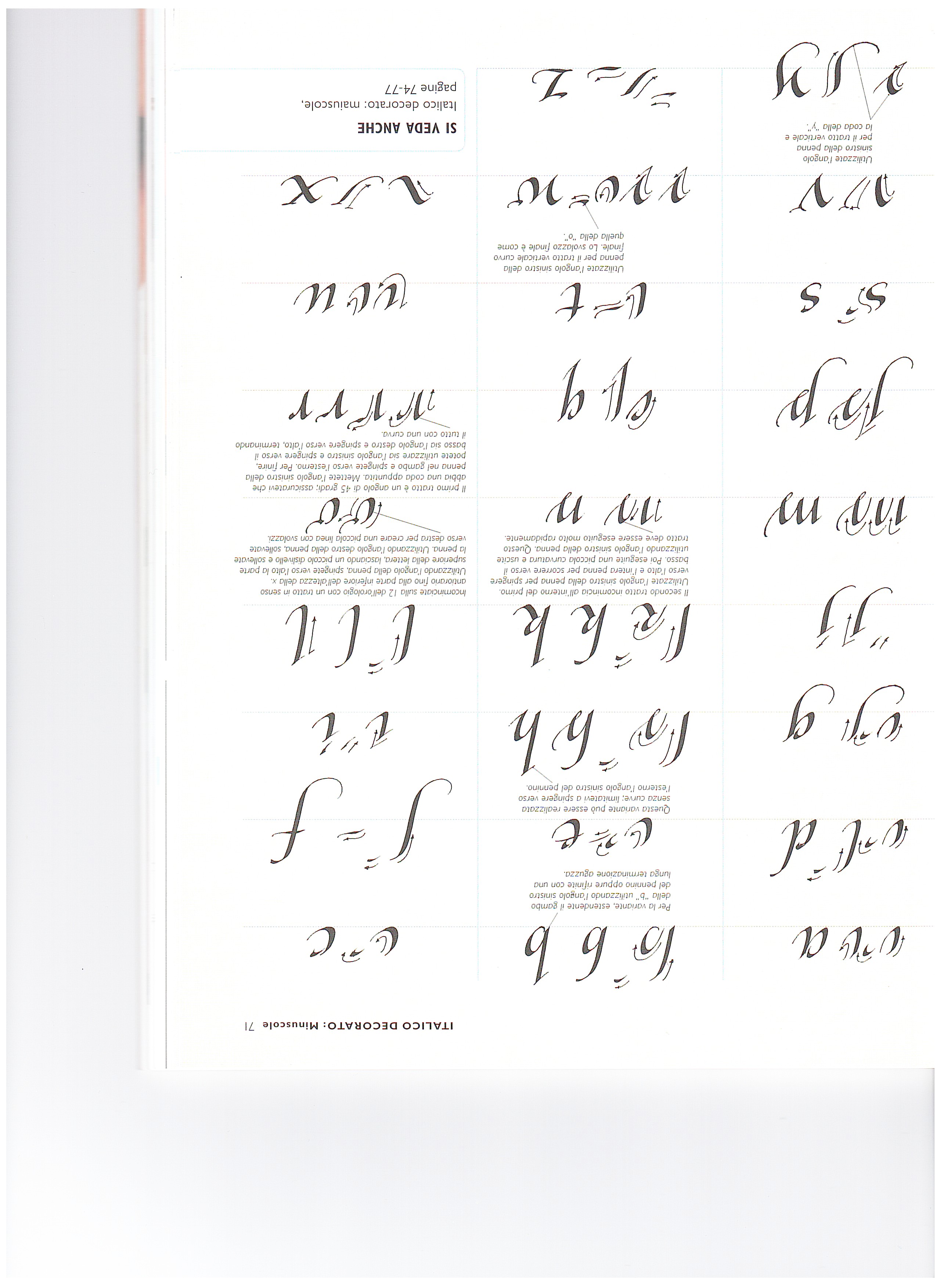 Allego due scansioni di uno stile simile a quello che mi sembra essere di tuo interesse (minuscole e maiuscole). L'autore lo chiama "italico decorato" (ma non è la denominazione ad essere importante).