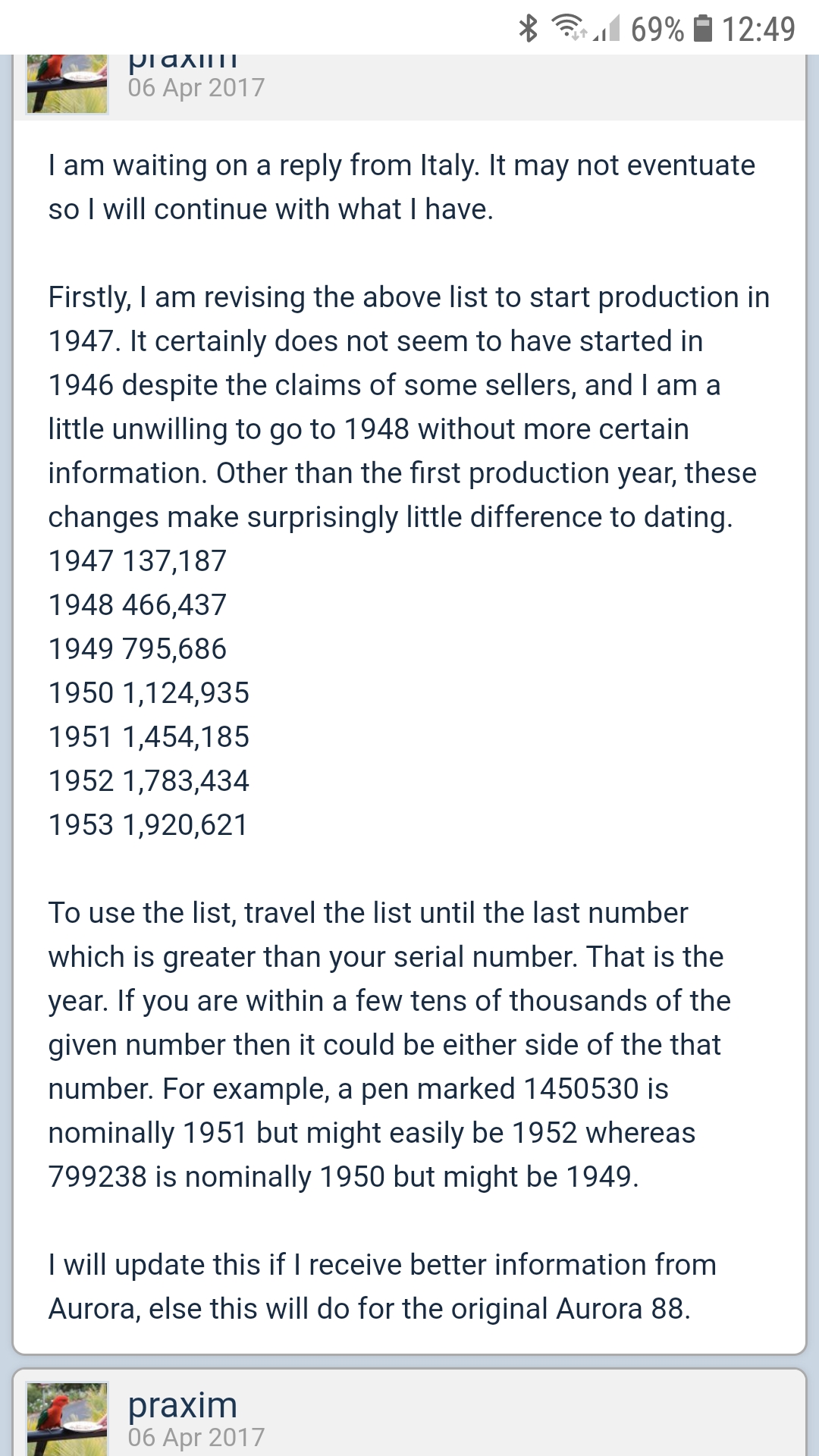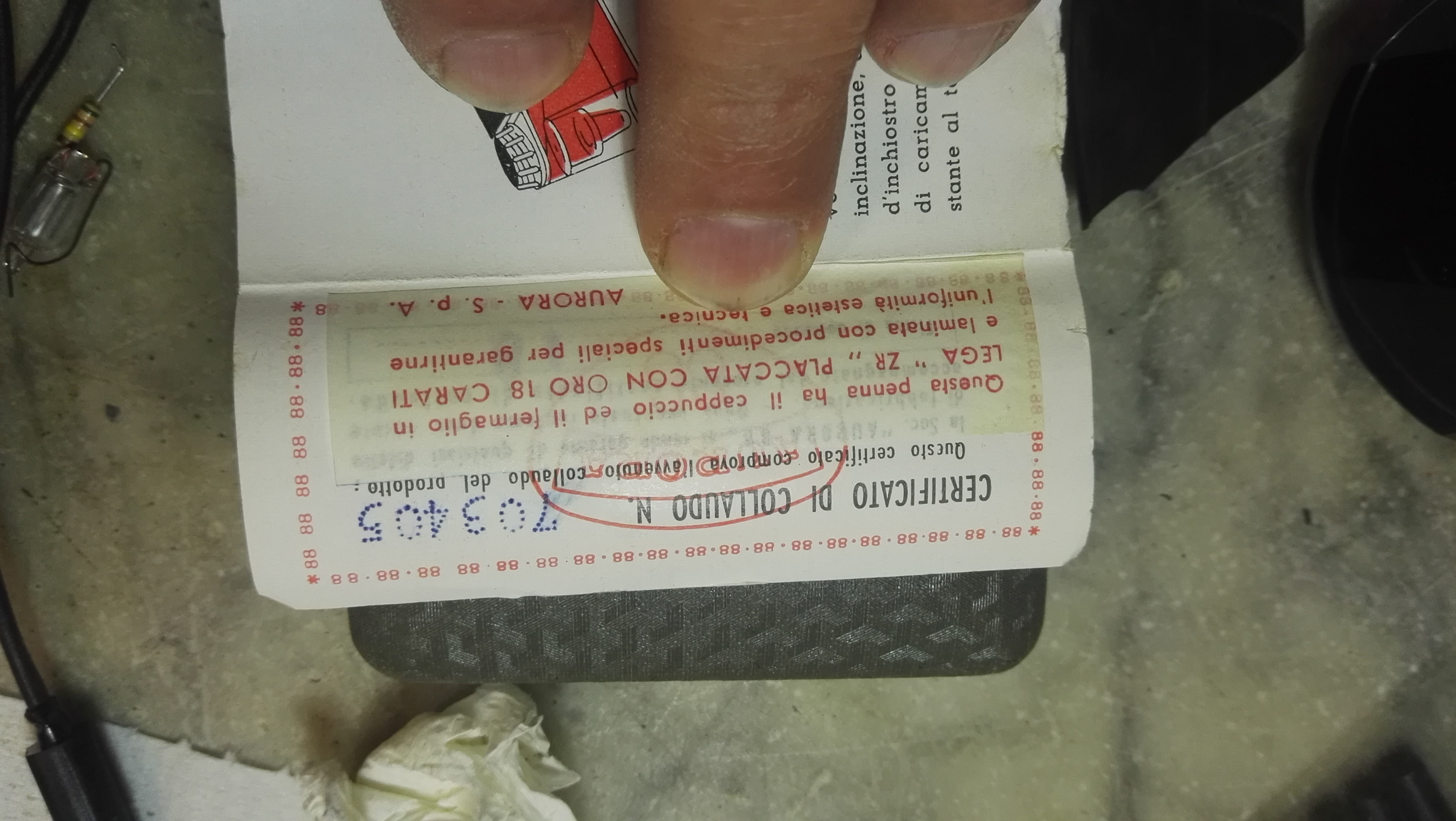 Ovviamente se una penna reca uno sticker come quello nella scansione precedente il suo numero seriale è senz'altro posteriore al 1948. Se non c'è non è possibile concludere che sia antecedente il 1948, dato che potrebbero aver iniziato a metter la scritta anche dopo, ma sarebbe comunque una indicazione interessante. Quello dell'immagine precedente (1085792) è il più basso che ho trovato, sarebbe senz'altro interessante capire fin dove ci si può spingere in basso.