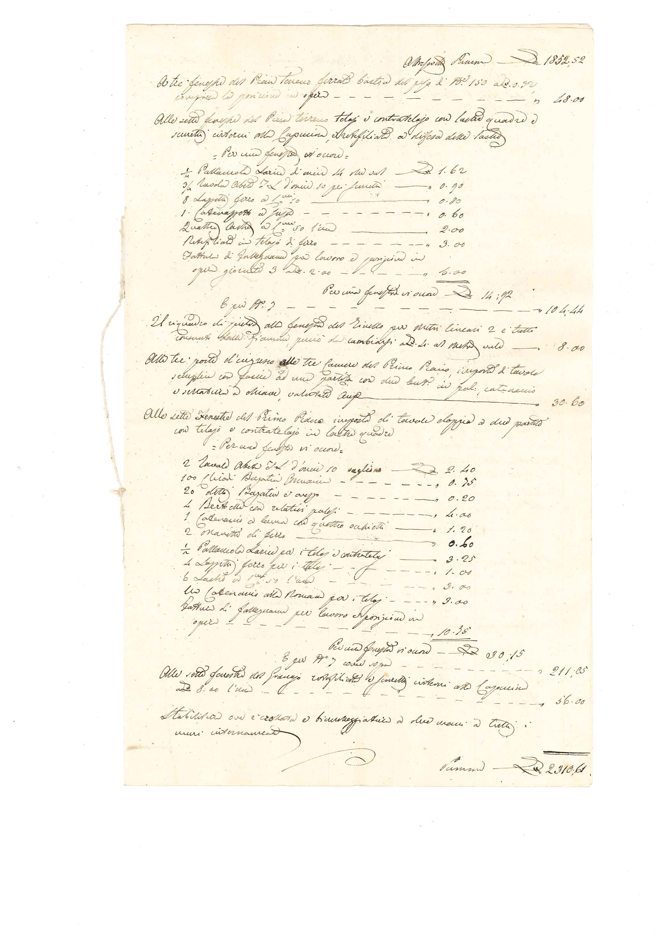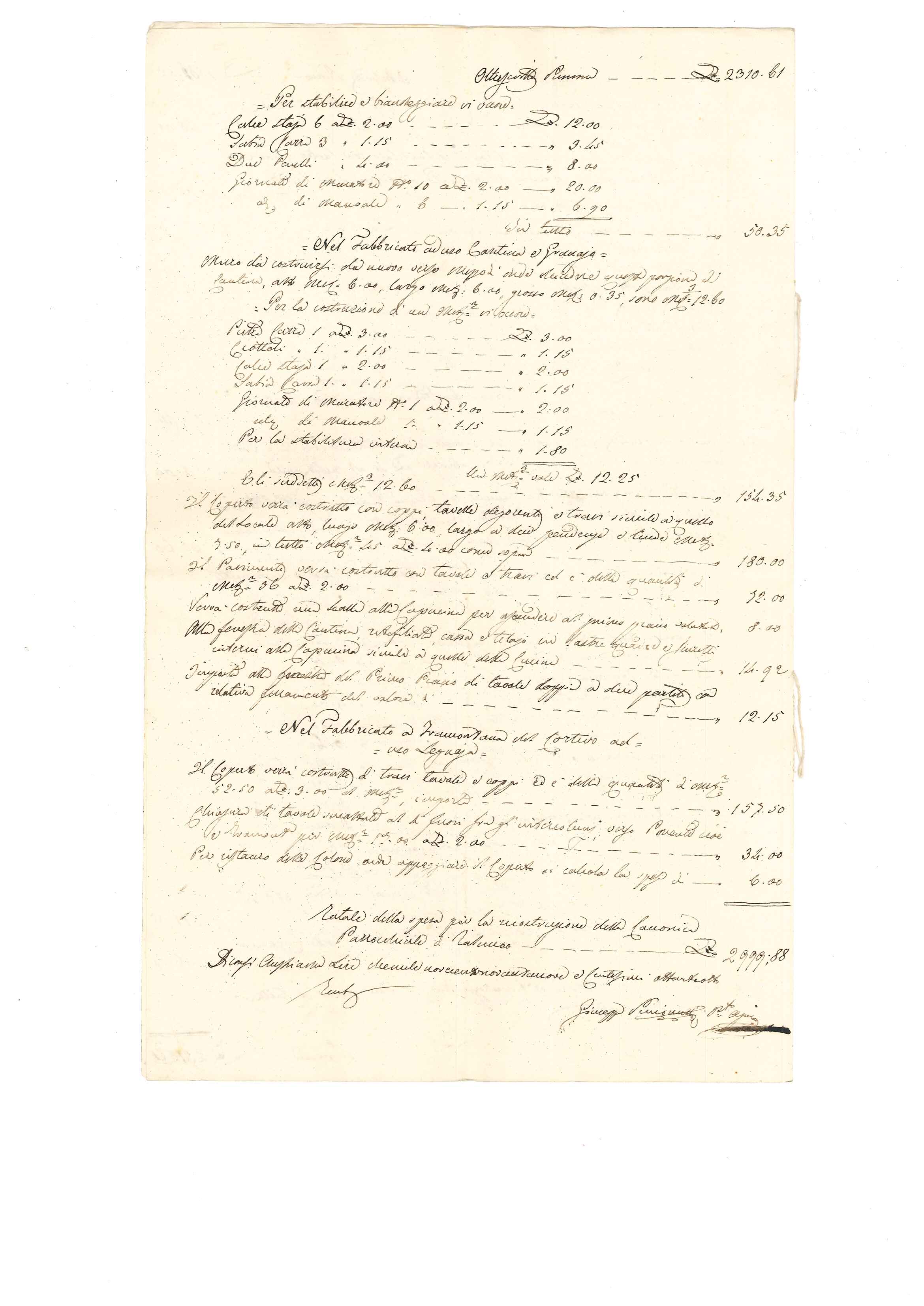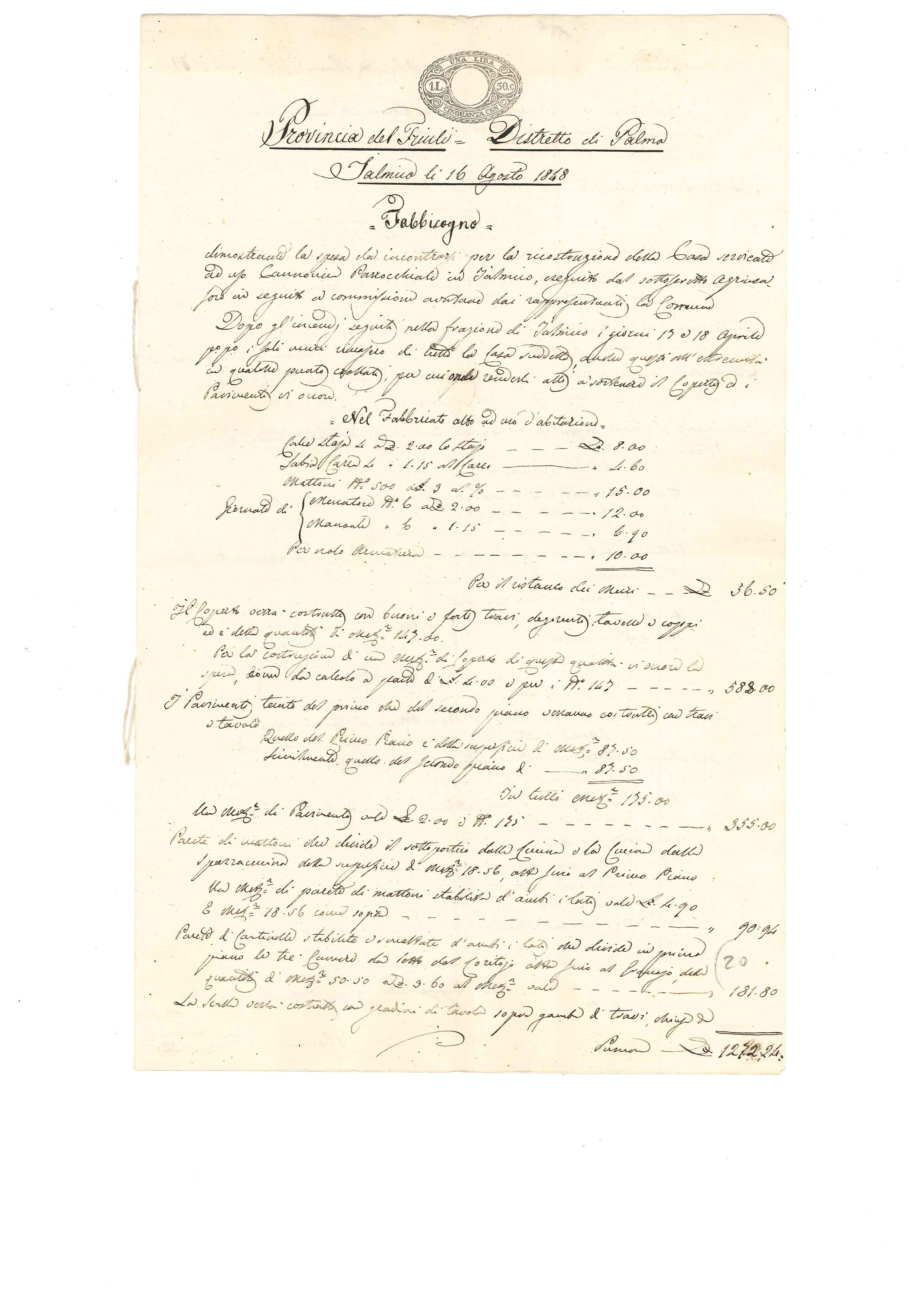 Buongiorno, allego un documento di storia locale relativo alla ricostruzione della canonica di Jalmicco, località in comune di Palmanova,Udine. E' datato 16 agosto 1848 ed è un computo metrico estimativo delle opere e dei materiali occorrenti per la ricostruzione. In premessa l'agrimensore (geometra del tempo) precisa che la ricostruzione è necessaria in seguito agli incendi scoppiati nei giorni 17 e 18 aprile dello stesso anno. Gli incendi furono appiccati dagli austriaci per "punire" i difensori della fortezza di Palmanova che spesso uscivano per delle spedizioni di contrattacco.Gli episodi rientrano in quella che fu l'ondata di moti rivoluzionari che interessò gran parte dell'Europa nel 1848. In Italia si ebbero le insurrezioni di Milano, Brescia, Venezia e,in Friuli, quelle delle fortezze di Palmanova e Osoppo. Palmanova si arrese ben presto (ci sono molti giudizi contrastanti sul fatto) e il generale Zucchi,comandante della piazzaforte, si attirò l'ira dei difensori di Venezia e Osoppo. Per tale fatto gli austriaci poterono togliere l'assedio e rinforzare le truppe che assediavano Venezia e Osoppo con le conseguenze che tutti conosciamo.
