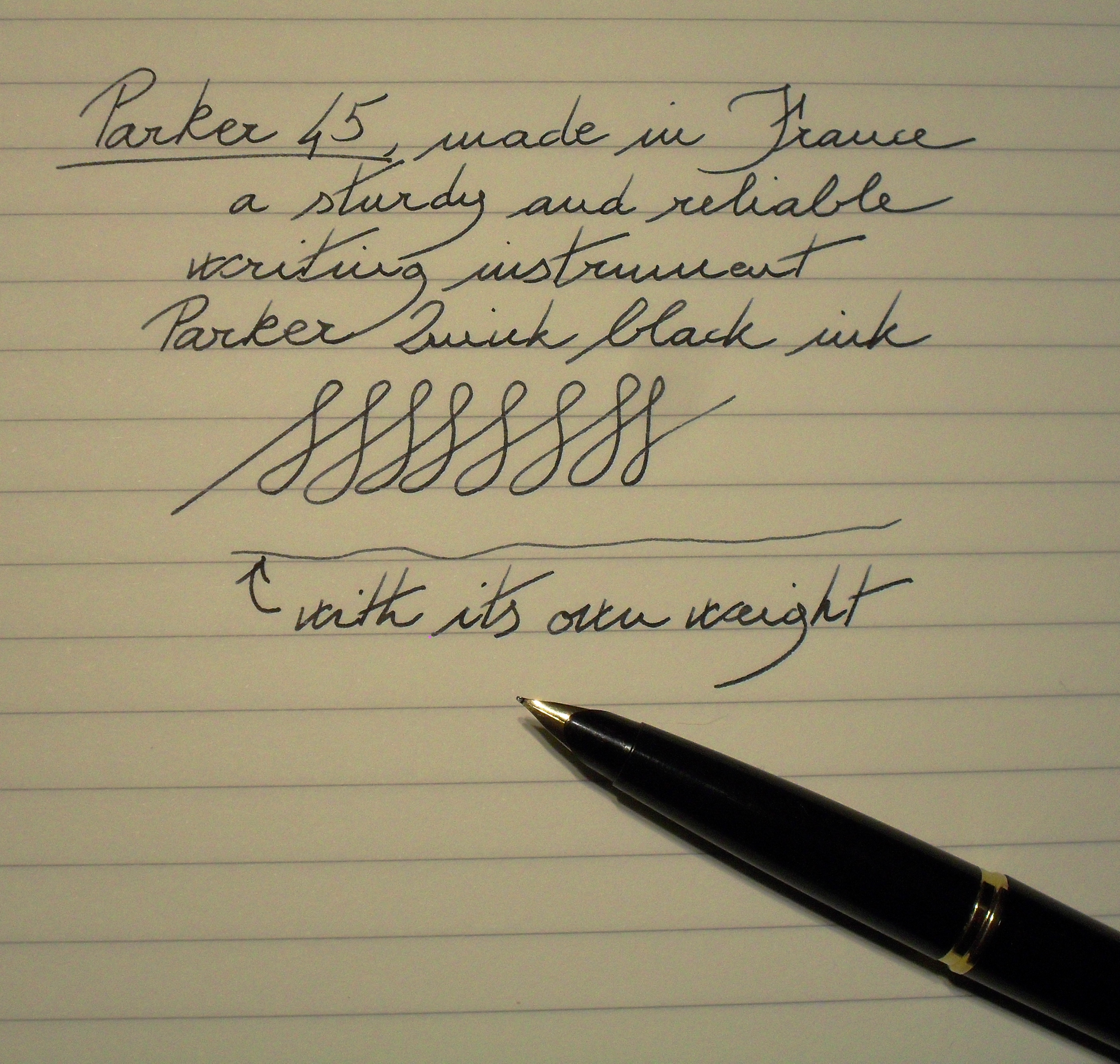 Aggiungo una considerazione del tutto personale: è mia opinione che, sin dalla sua introduzione, la Parker 45 abbia relegato nell’angolo dell’obsolescenza estetica ogni altra stilografica, passata e futura, e che l’eleganza della versione che vi presento oggi, scevra d’ogni ricercatezza o dandismo, non tema confronti.