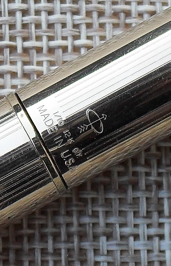 Il corpo ed il cappuccio sono laminati in oro a 12 carati, mentre il pennino F è d’oro a 14 carati. La posizione dei rebbi, leggermente divaricati, lo trasforma in un M, donando però una qualità di scrittura comunque molto piacevole. Bello il tocco del pannello rettangolare liscio sul fusto, per eventuali incisioni.