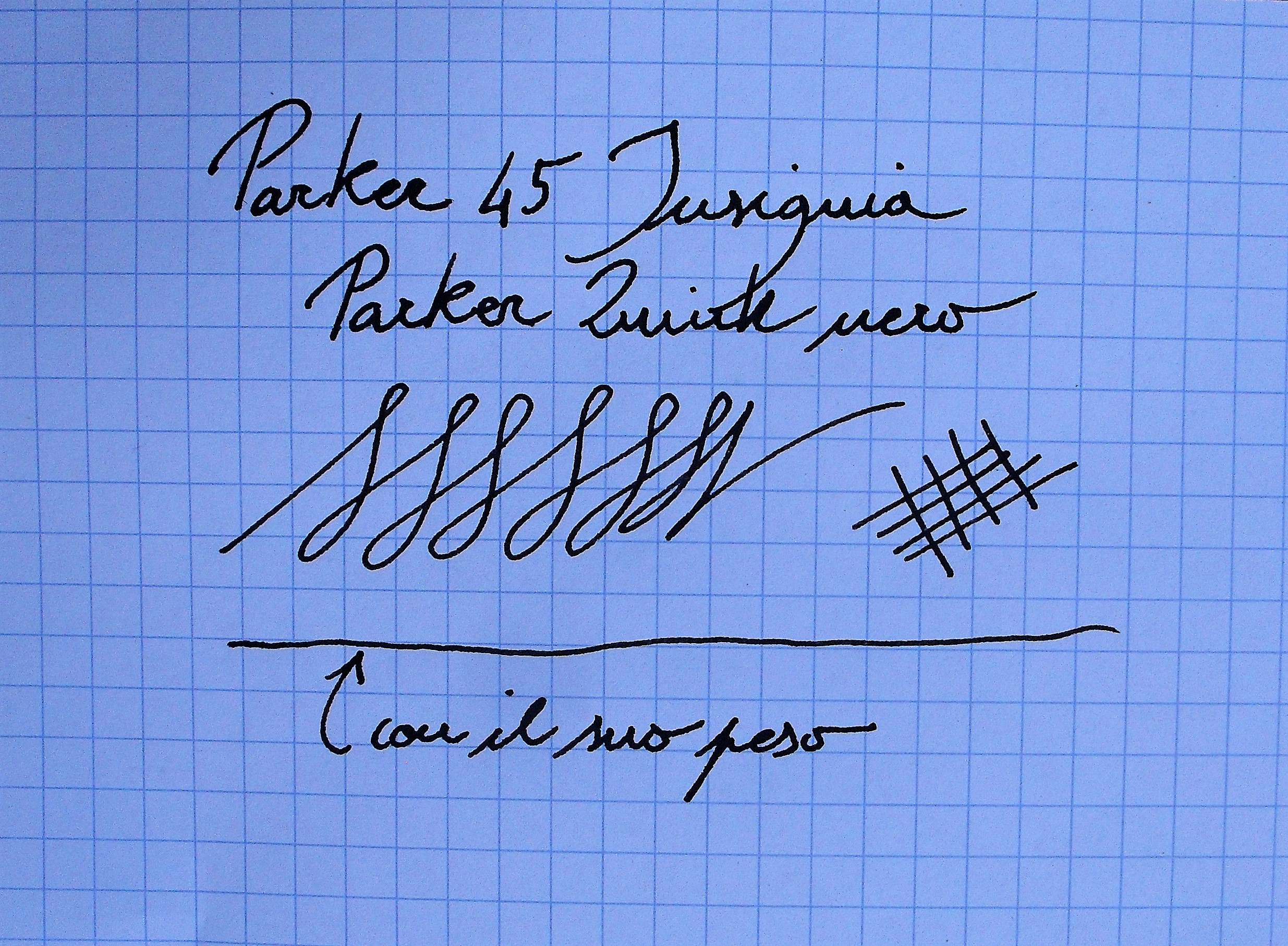 Si tratta, naturalmente, di stilografiche molto moderne, almeno per me, che amo particolarmente quelle degli anni Trenta e le “eyedroppers”. Ma debbo riconoscere che la 45 è un modello piacevole esteticamente e molto funzionale, dotato anche di buone caratteristiche di scrittura. Questa non presenta alcun difetto, è caratterizzata da flusso sempre ben bilanciato, mai magro, e l’autonomia è ottima, grazie alle cartucce proprietarie Parker lunghe, con una piccola riserva d’emergenza.