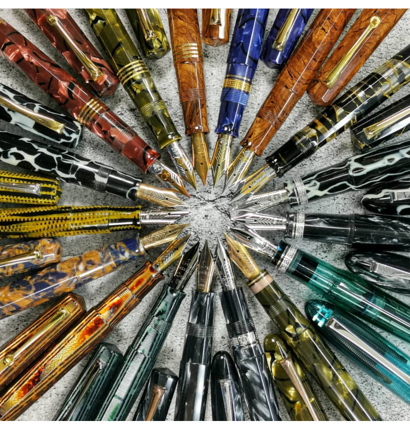 Nel frattempo, quasi dieci anni dopo averla ammirata per la prima volta, vi presento la mia nuova Grand Paragon in celluloide Arco e finiture argentate, con un pennino fine perfetto, qui ripresa in varie pose insieme alla sua sorella dorata e, nell'ultima immagine, nella configurazione "trio di Paragon Arco". Dal vivo, é mozzafiato.