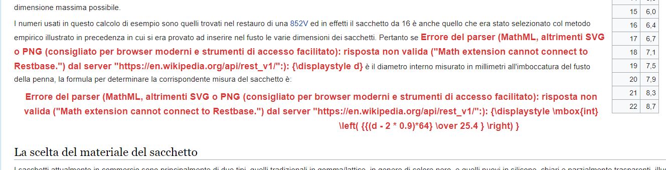 Volevo segnalare che sul wiki in questa pagina Sostituzione_di_un_sacchetto_in_gomma mi risulta un problema sulla visualizzazione delle formule in fondo al paragrafo sulla scelta della misura del sacchetto (io vedo la pagina così) ps. Volevo ringraziare tutti quelli che hanno collaborato alla creazione del wiki perchè è veramente una cosa spettacolare