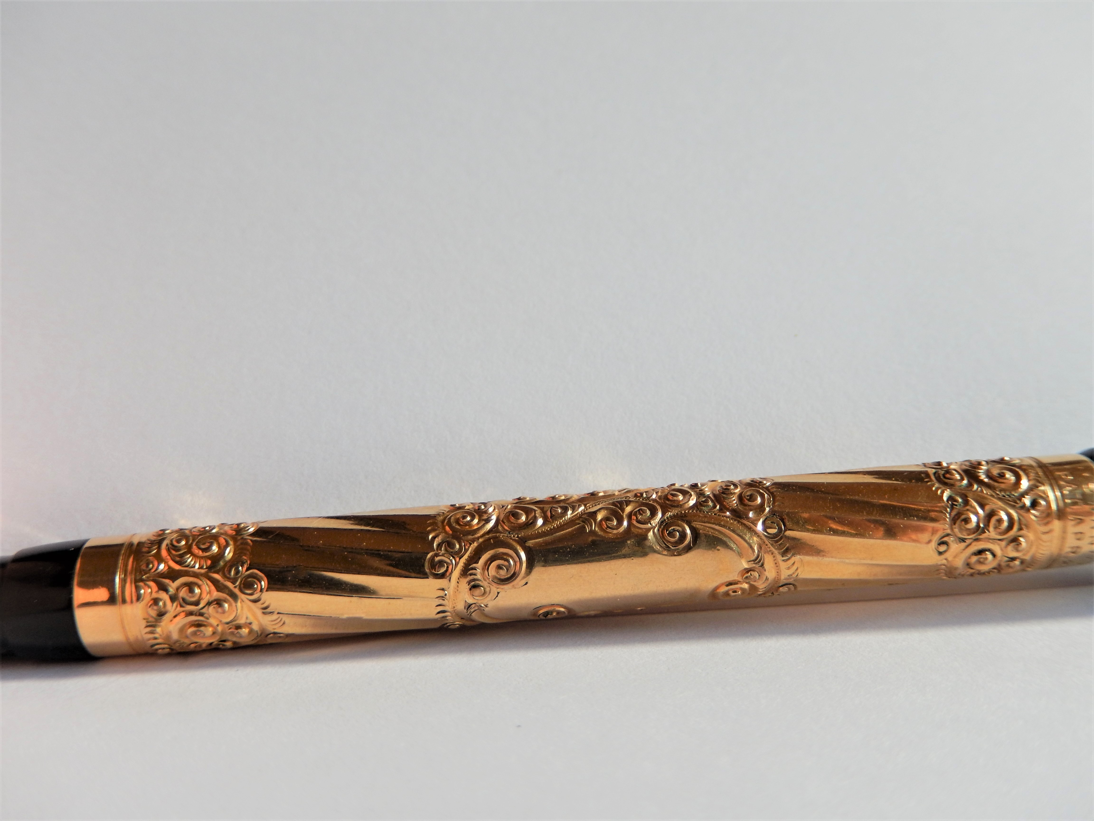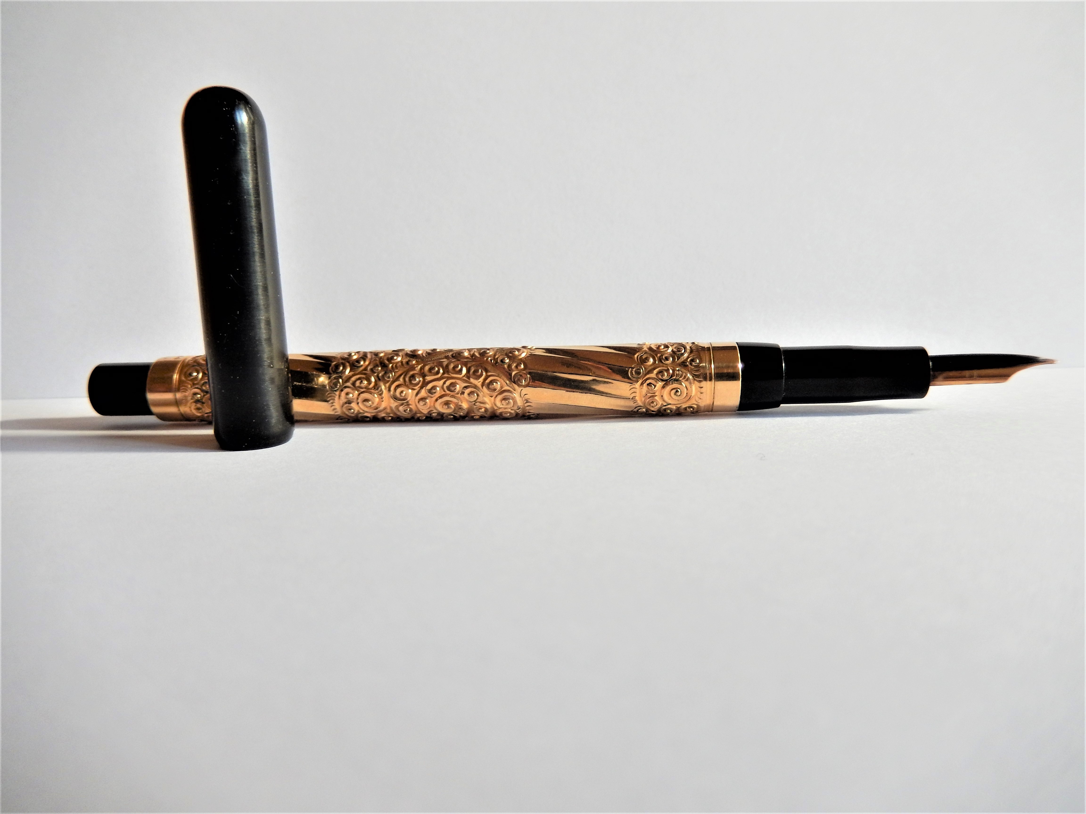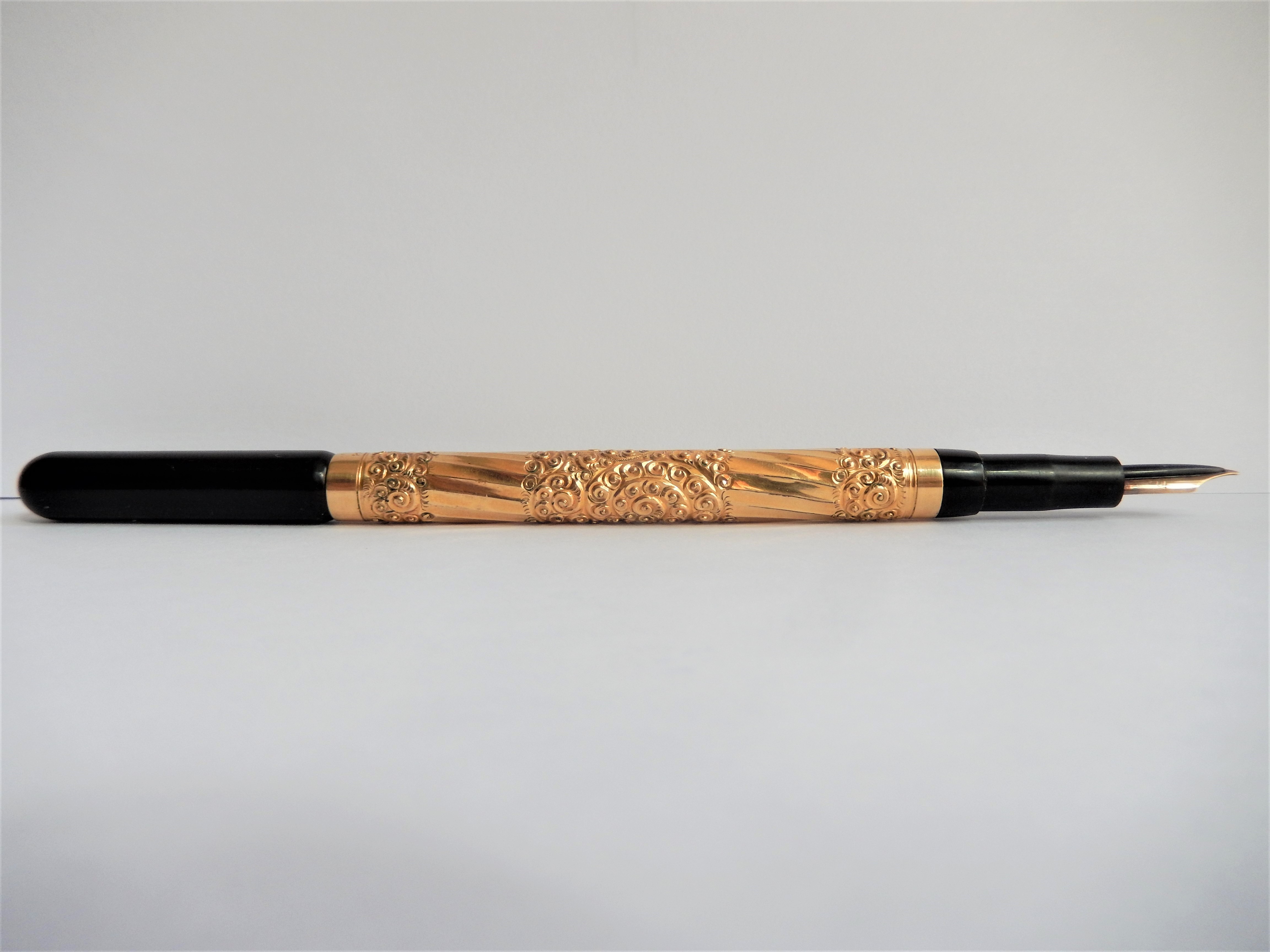 Una Swan Mabie Todd & Co, ormai ultracentenaria, ma che non ha perso, malgrado gli anni, l'elegante raffinatezza che caratterizzava questo produttore. Si tratta di una Eyedropper con il corpo rivestito in oro, avvolto da spirali e "snails" e cappuccio in ebanite.