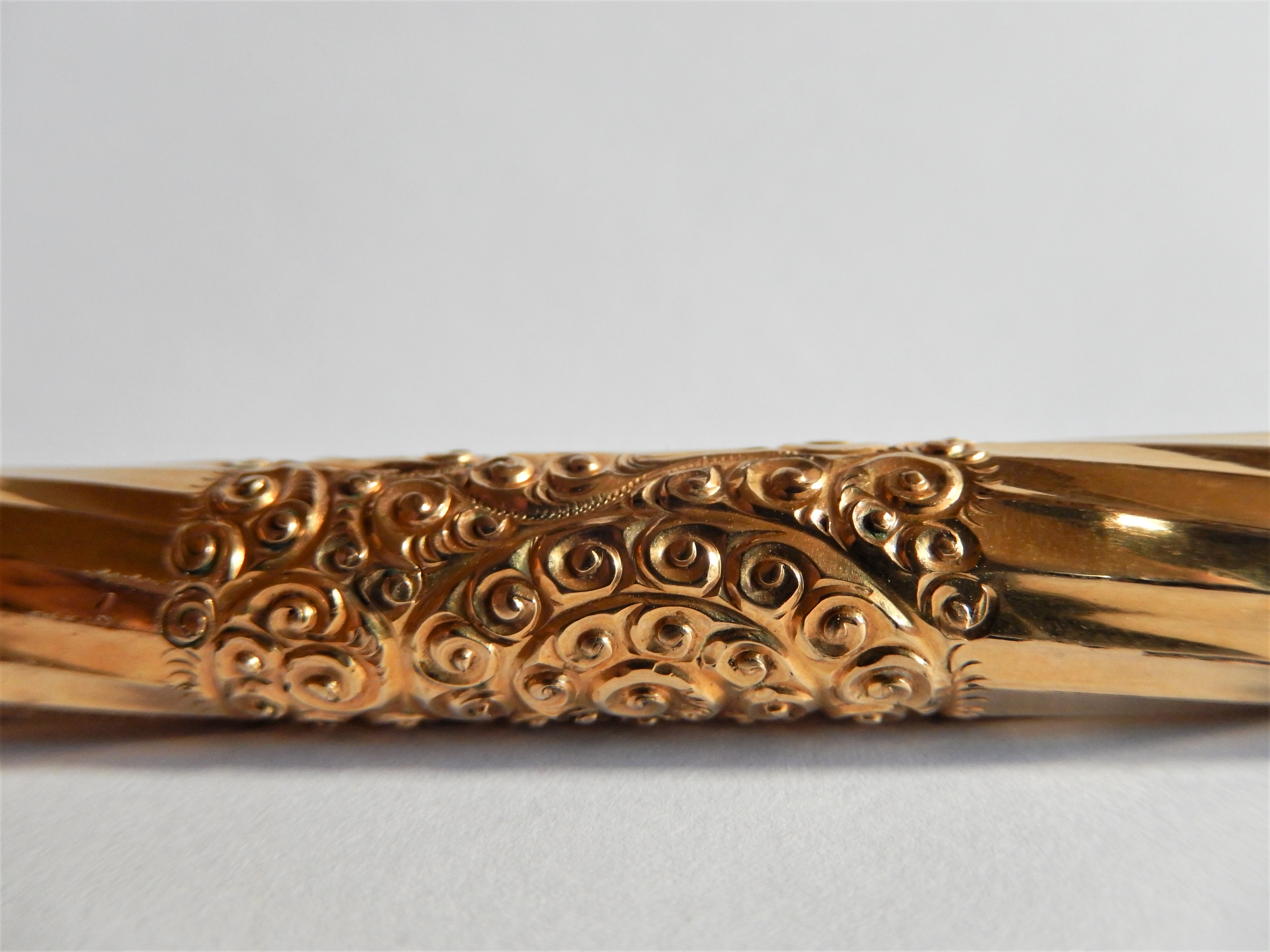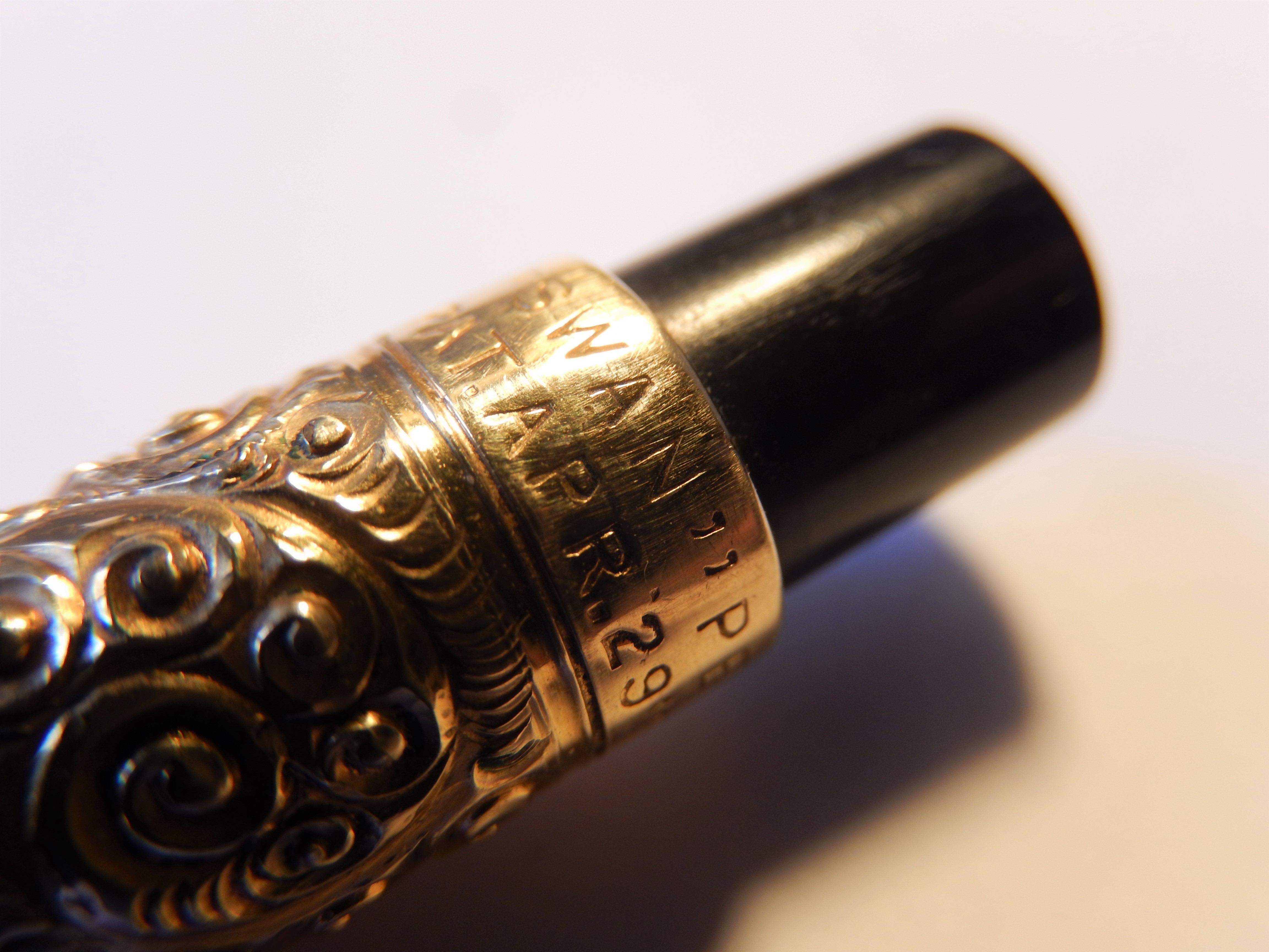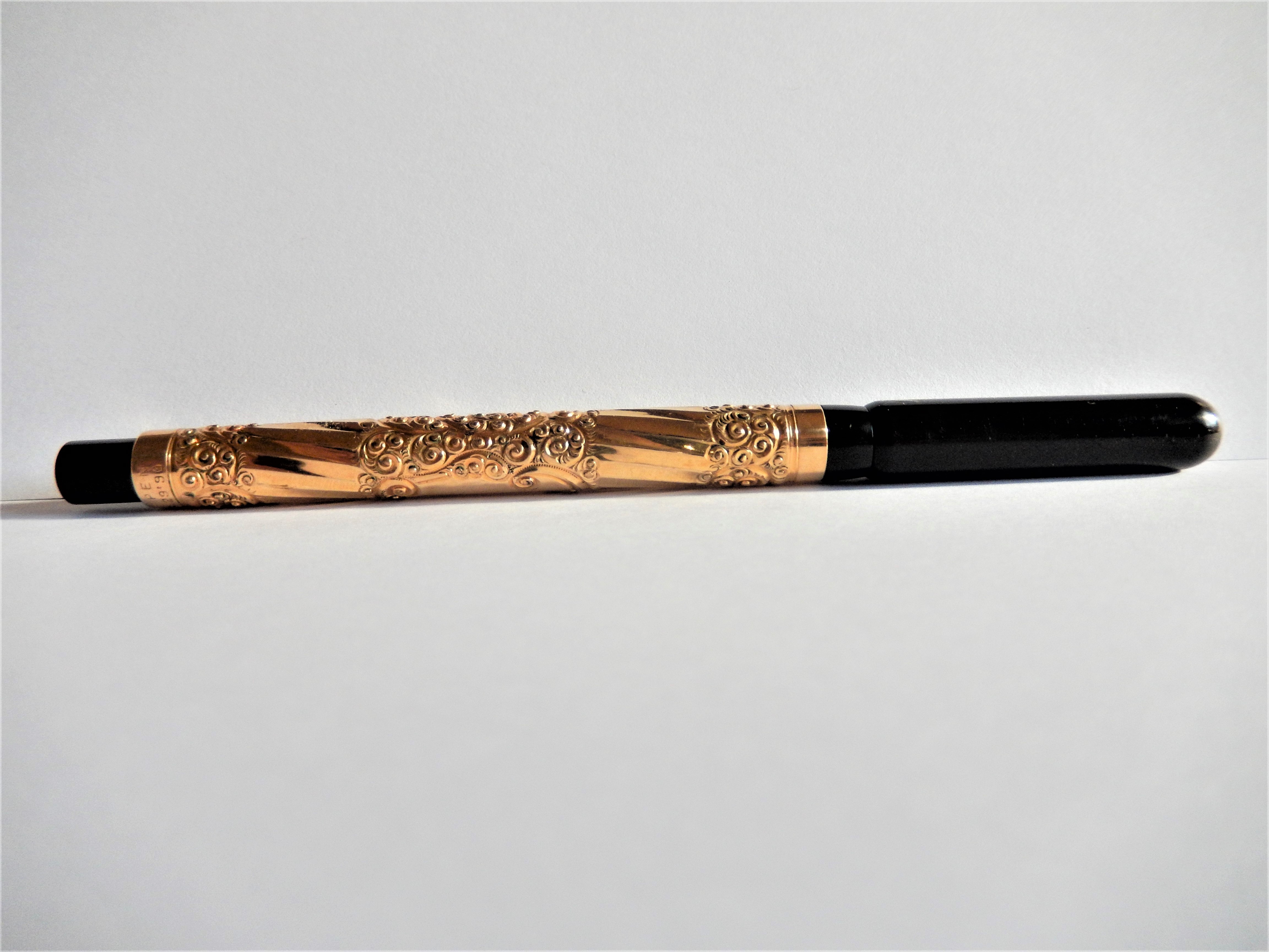 Una Swan Mabie Todd & Co, ormai ultracentenaria, ma che non ha perso, malgrado gli anni, l'elegante raffinatezza che caratterizzava questo produttore. Si tratta di una Eyedropper con il corpo rivestito in oro, avvolto da spirali e "snails" e cappuccio in ebanite.