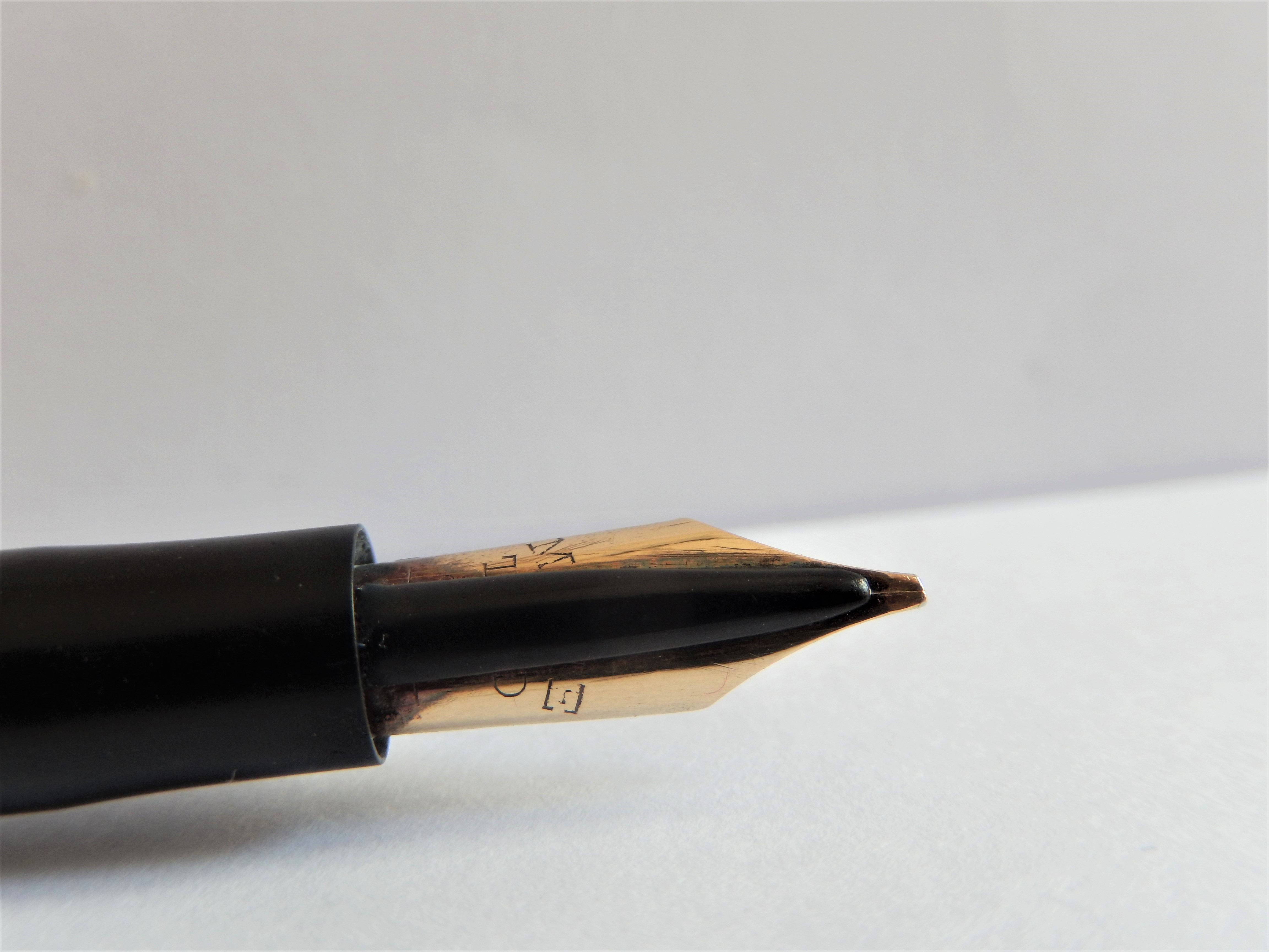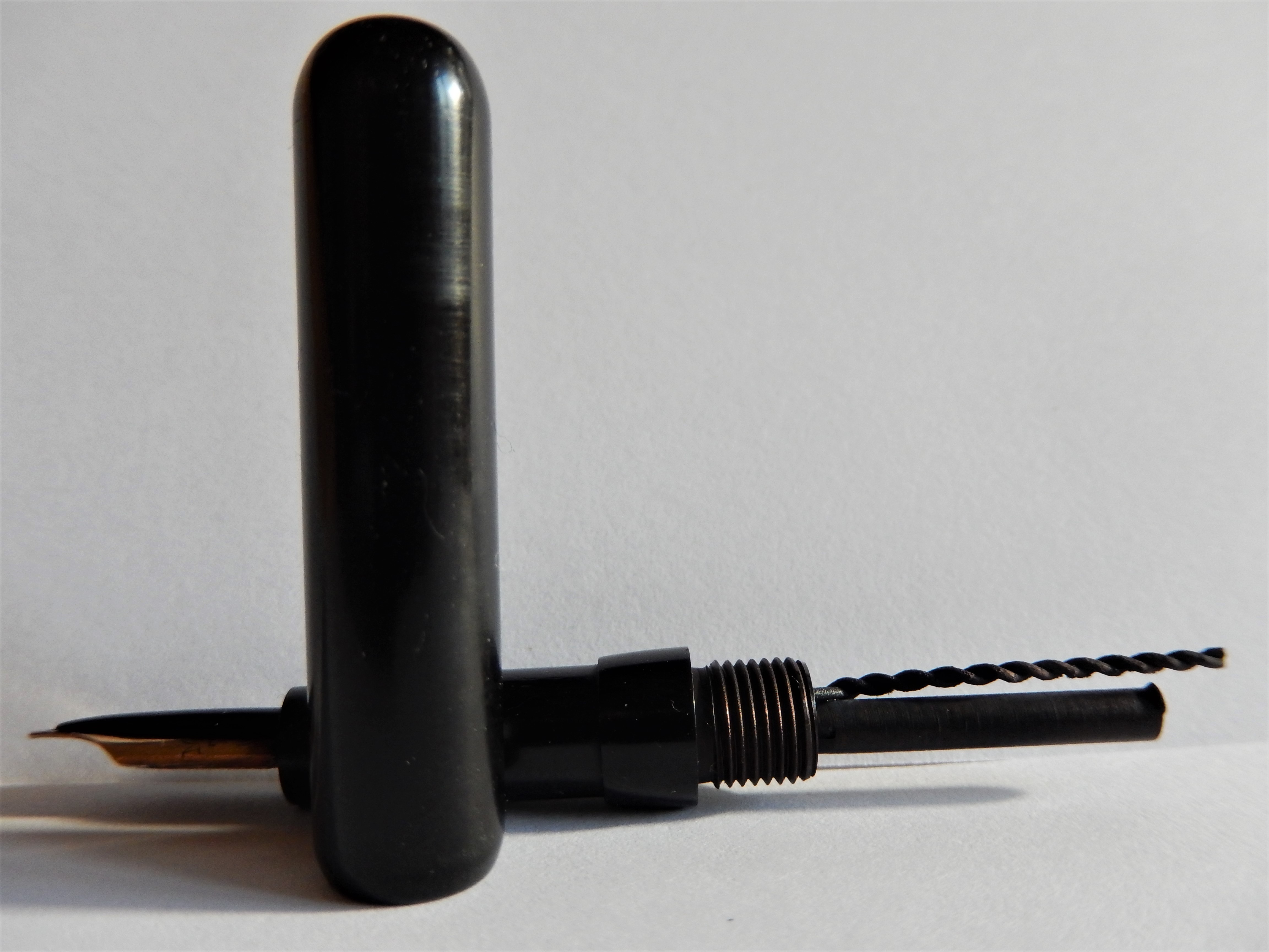 La penna in visione è dotata di un alimentatore del tipo over e under in ebanite nera con code in filo d'argento intrecciato per la regolarizzazione del flusso dell'inchiostro. Il cappuccio è ancora del tipo a pressione ( quelli a vite arrivarono dopo il 1910)