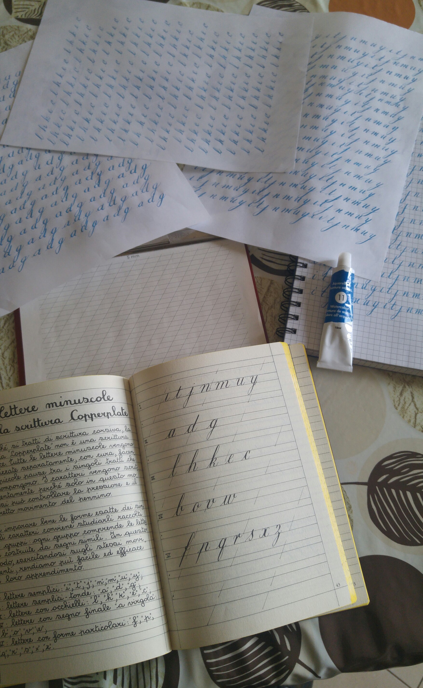 - In generale: lascia spazio tra le righe e quando ripeti le stesse lettere per esercizio, lascia abbondante spazio fra le singole lettere; le lettere isolate si analizzano meglio e non si influenzano a vicenda mentre scrivi, lo stesso vale per le righe di scrittura. Usa il rapporto "corretto" delle altezze (3,2,3). Metti i "puntini" sulle i: sempre uguali, sempre alla stessa altezza, e "disegnati" (non il semplice appoggio della punta del pennino). anche i "tagli" della t, falli come vuoi ma in una serie falli sempre uguali. Memorizza altezze diverse per "b, f, h, k, l, " (altezza massima), per "d" (per esempio 2/3 del massimo ascendente), per "t" (per esempio 1/3 del massimo ascendente): allo stesso modo "f, g, j, y" massimo discendente, "p, q" (per es. 2/3 del massimo discendente).