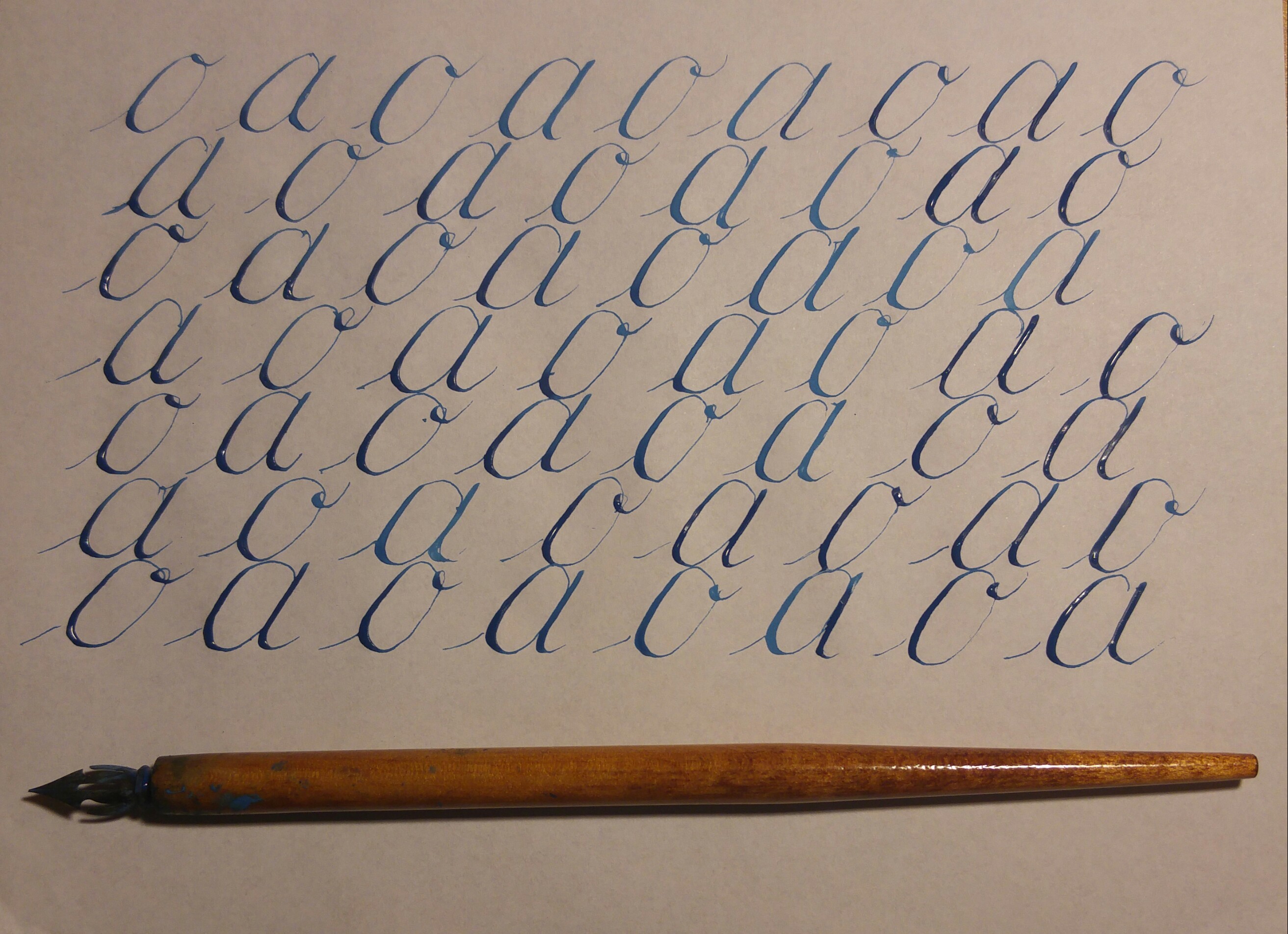 Il consiglio che posso darti è di fare qualche pagina di esercizi lavorando solo sugli ovali, ma disegnandoli di maggiore altezza (io mi esercito ad esempio su un comune foglio a righe e uso un'interlinea come altezza di riferimento, circa 1 cm) e se non ti trovassi bene con il pennino, puoi sempre procurarti un pennino Brause "Steno" (Brause 361) che è molto docile e permette di disegnare lettere di altezza ragguardevole.