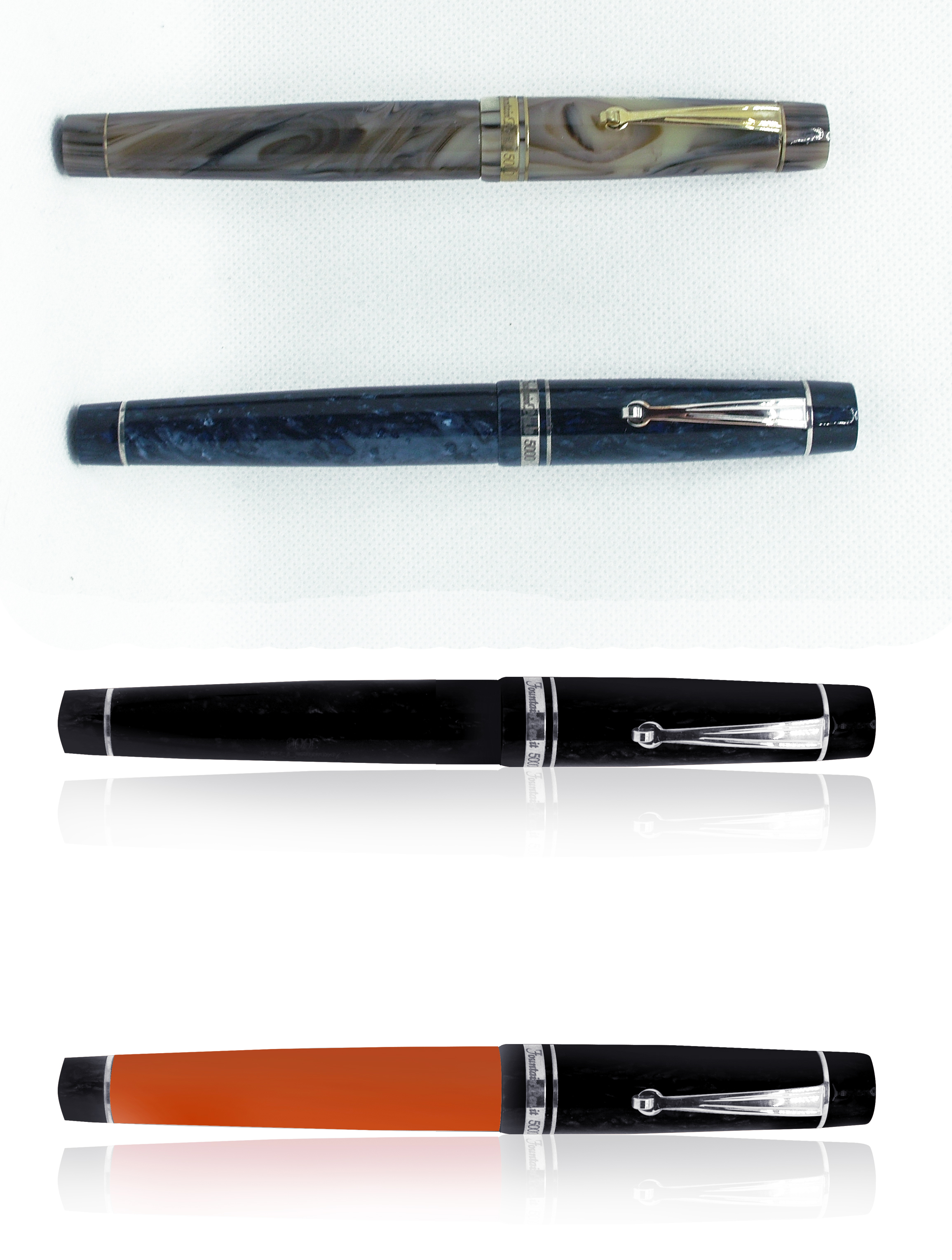 Le resine sono di prima qualità, prodotte da Mazzucchelli, le parti componenti la penna di adeguato spessore vengono tornite dal pieno per una maggiore robustezza. La clip è un pezzo unico con l'anello sotto la testina, superiore come robustezza al modello composto di due parti. Il converter (incluso) è a vite, il gruppo alimentazione si potrà sostituire con estrema facilità con qualunque gruppo Jowo n° 6 essendo a vite "tipo PeliKan". Bisogna sempre ricordarsi di estrarre il converter prima di svitare il gruppo scrittura, che funge anche da controdado per bloccare il gruppo scrittura. Attualmente sul pennino non c'è nessuna incisione, ma quando arriveranno nelle vostre mani ci sarà il numero magico "5000". Dopo un attento studio del colore da dare alle finiture metalliche abbiamo concordato che per la versione corno queste andavano dorate, mentre per le altre andavano rodiate. Purtroppo l'artigiano per impegni precedenti non è riuscito a consegnarci i campioni della stilografica in tutti i colori.