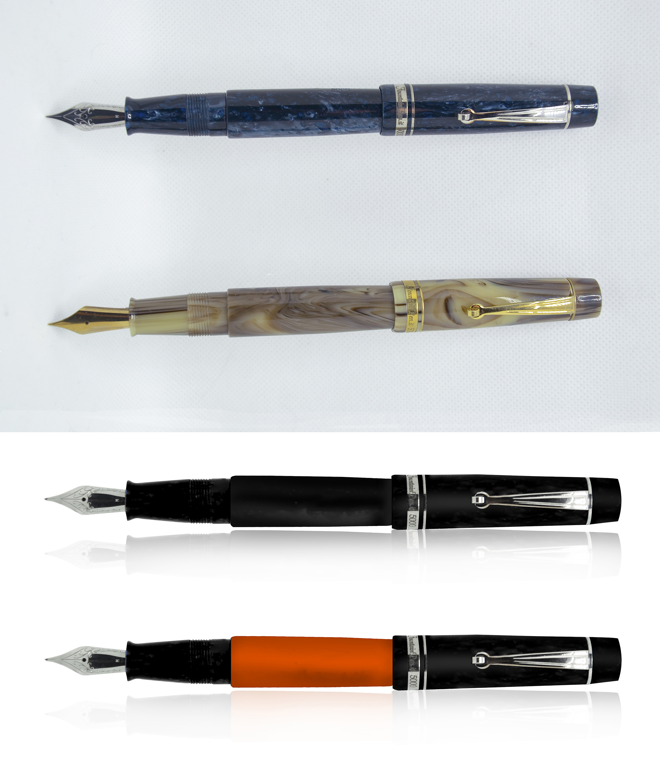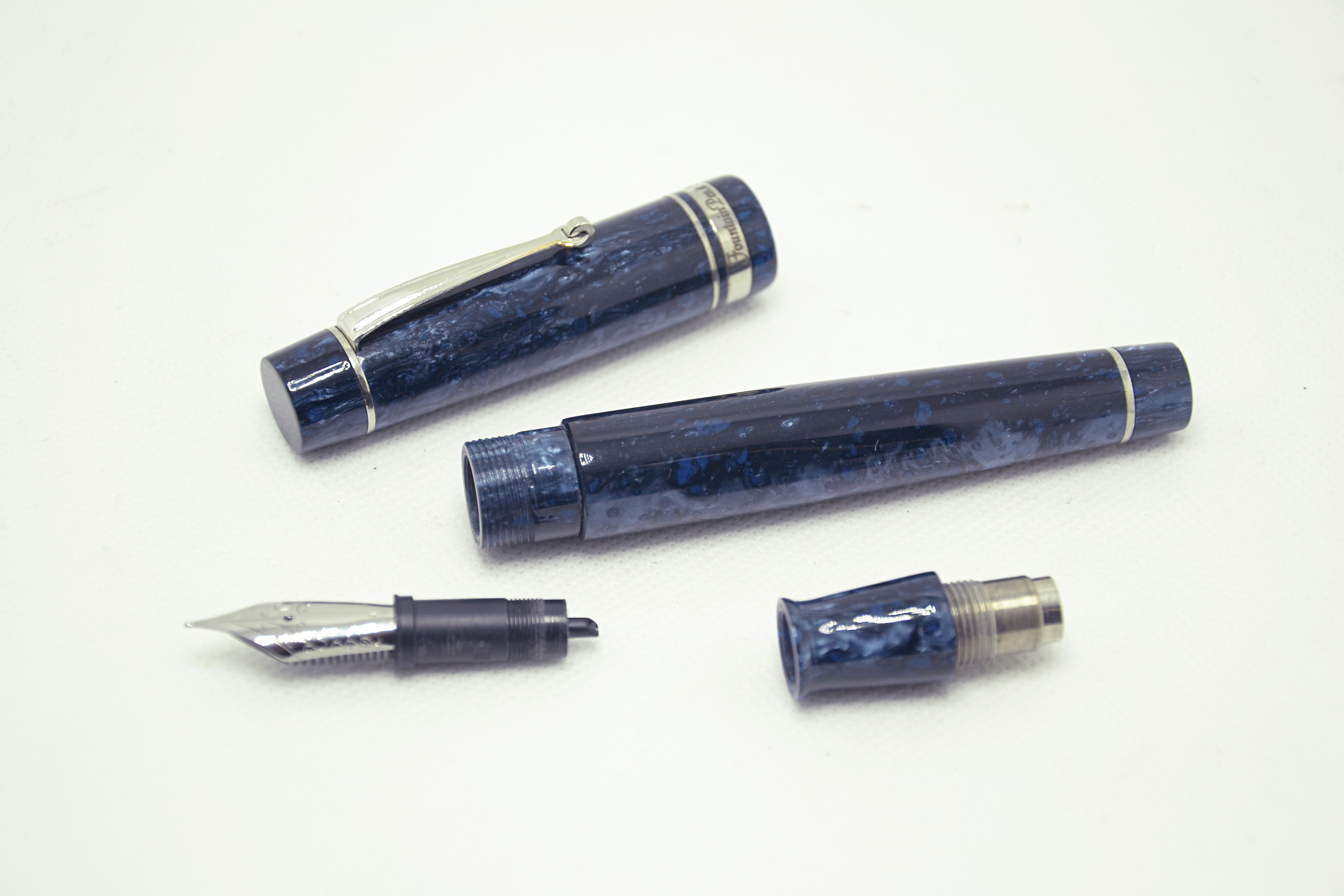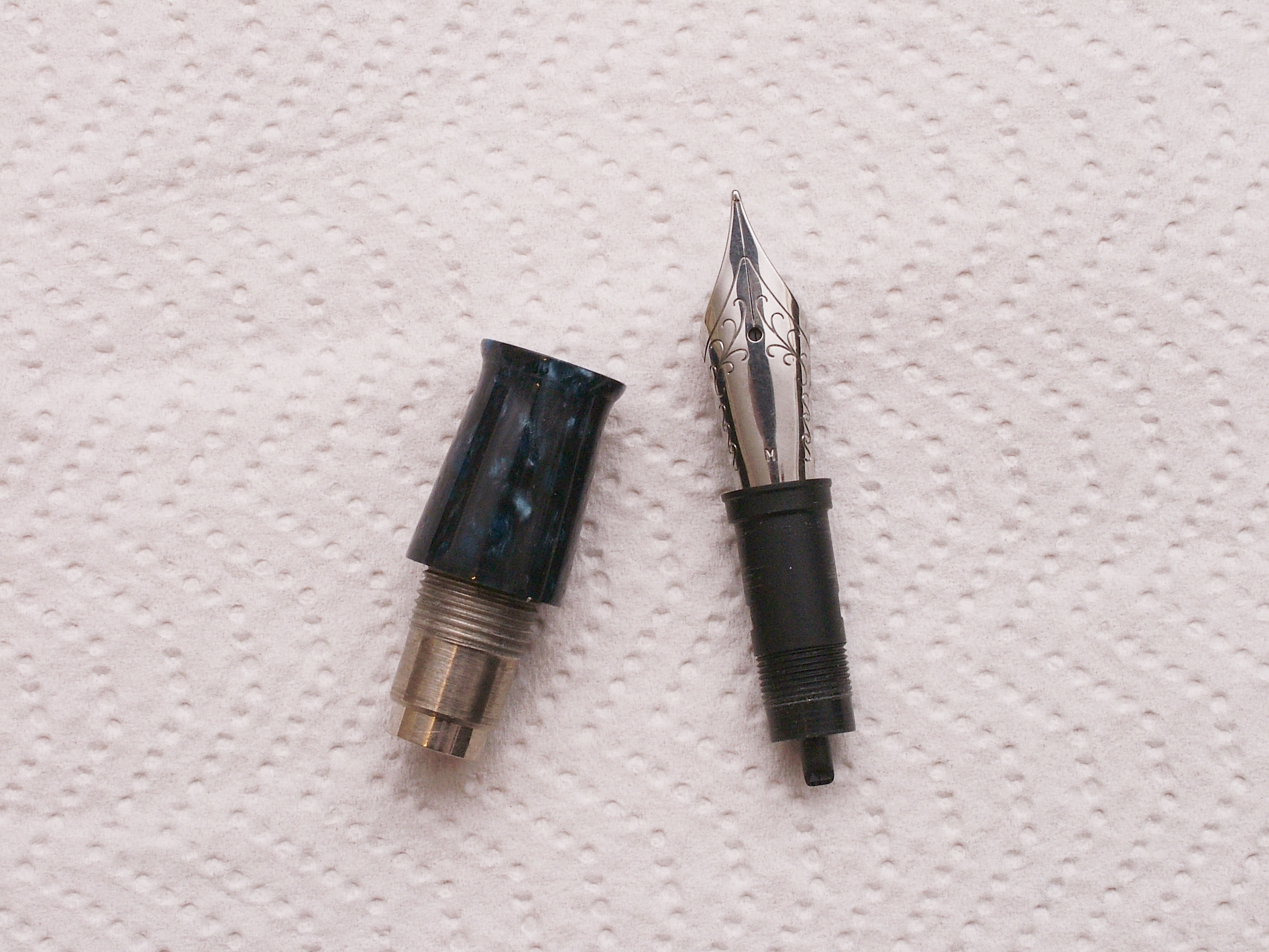 Noterete che in foto la corno ha delle piccole differenze come il pennino Bock e non Jowo, questo è dovuto al fatto che la corno è il prototipo mentre la Blu marmorizzata è la definitiva su cui si è deciso di optare per il pennino Jowo.