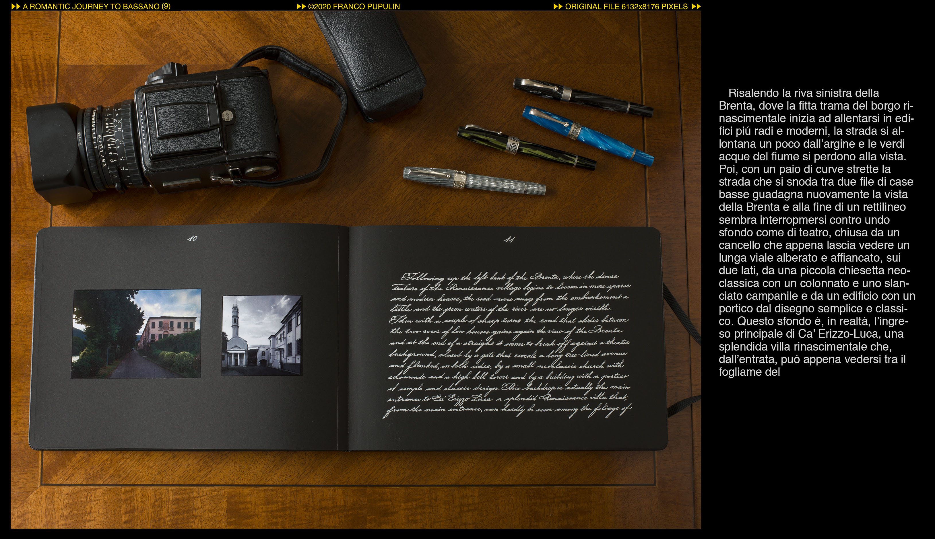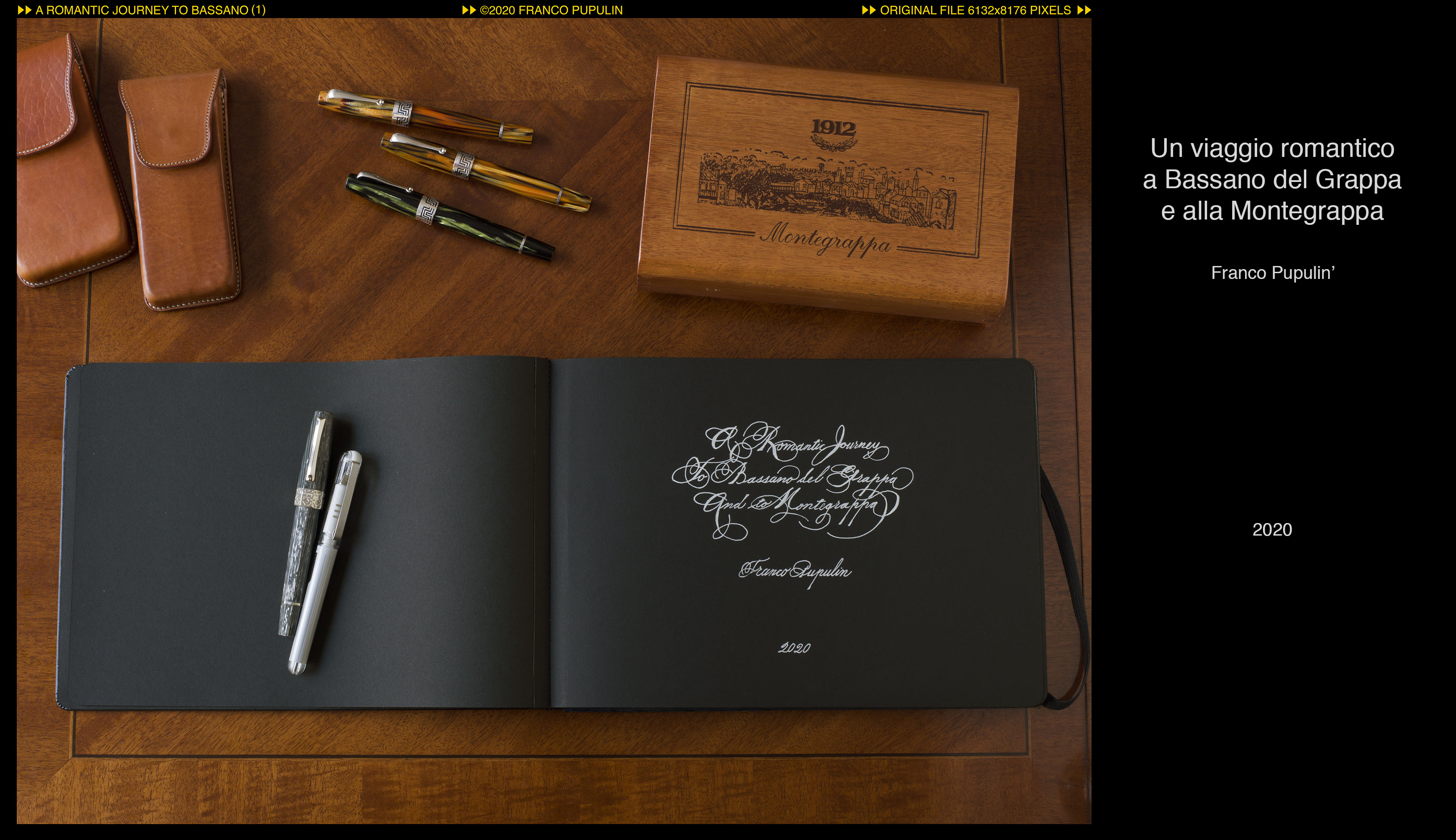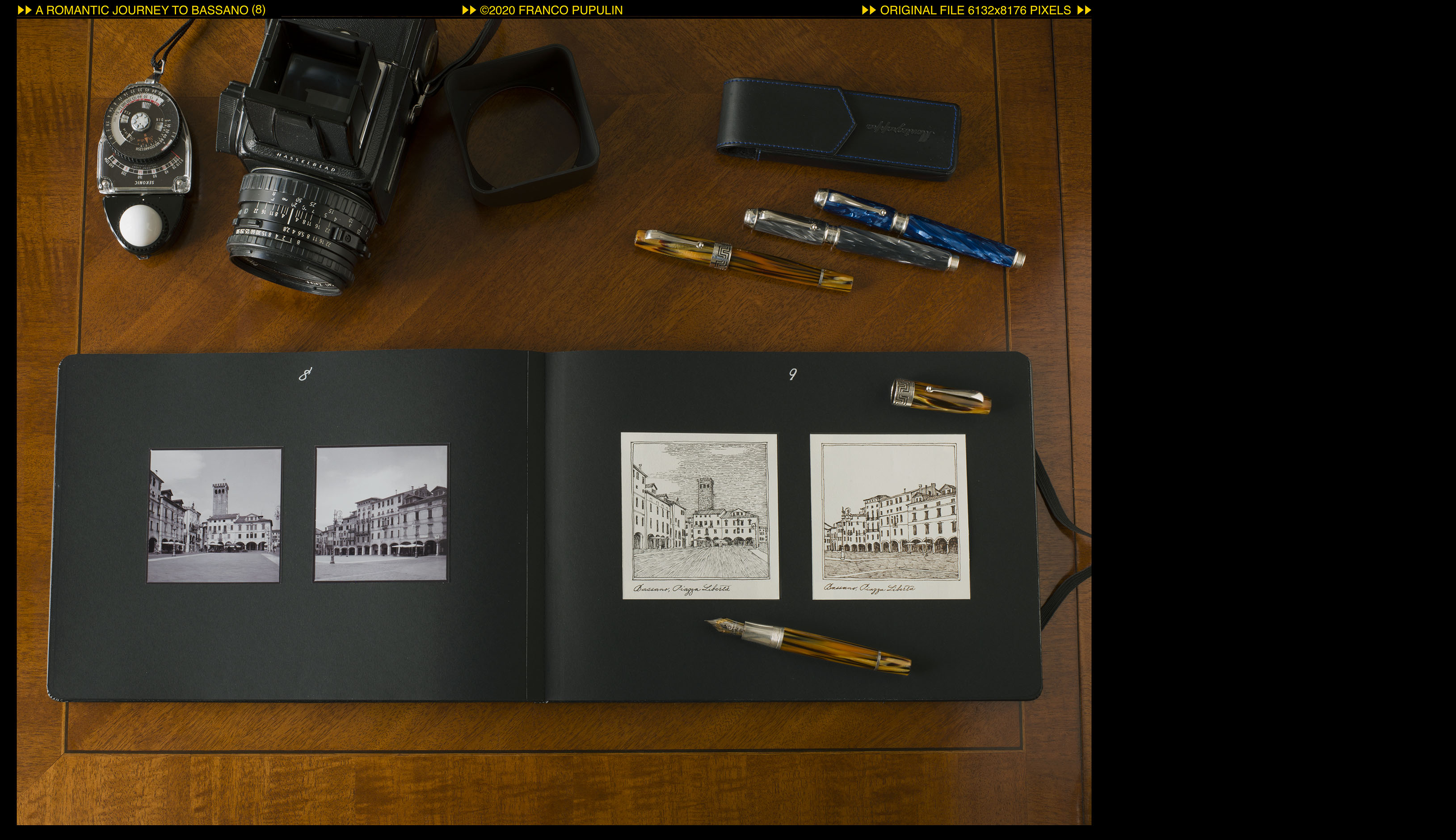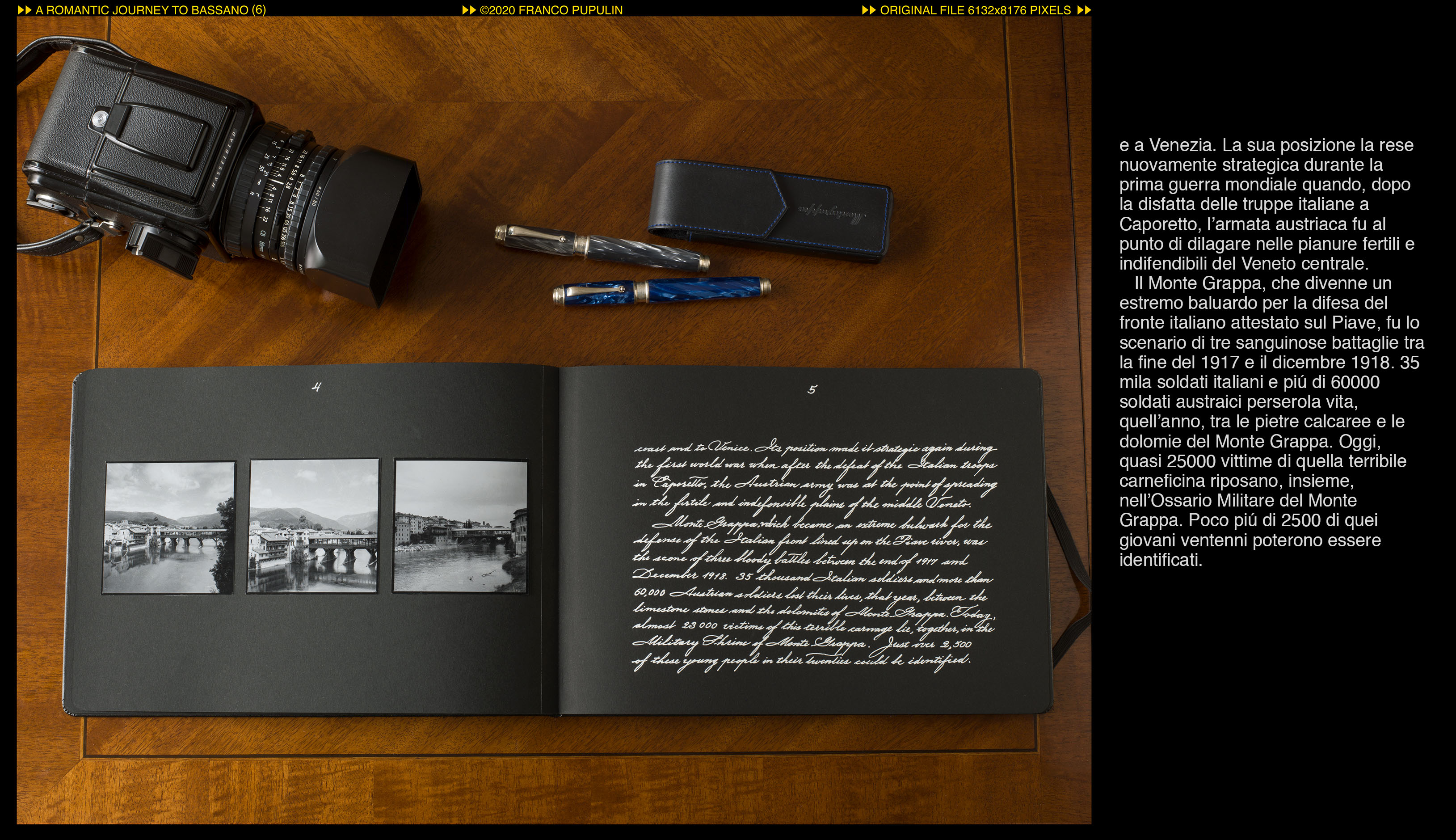Inizialmente, l’album avrebbe dovuto essere solamente un classico album di fotografie con le loro didascalie. Poi è diventato una specie di racconto illustrato, e il racconto è stato scritto in grafia corsiva. Il risultato d’insieme, con quell’album nero, con le fotografie e gli schizzi, e quel testo corsivo scritto in bianco, mi è infine parso sufficientemente “romantico” da suggerire il titolo del lavoro: “Un viaggio romantico a Bassano del Grappa e alla Montegrappa”.