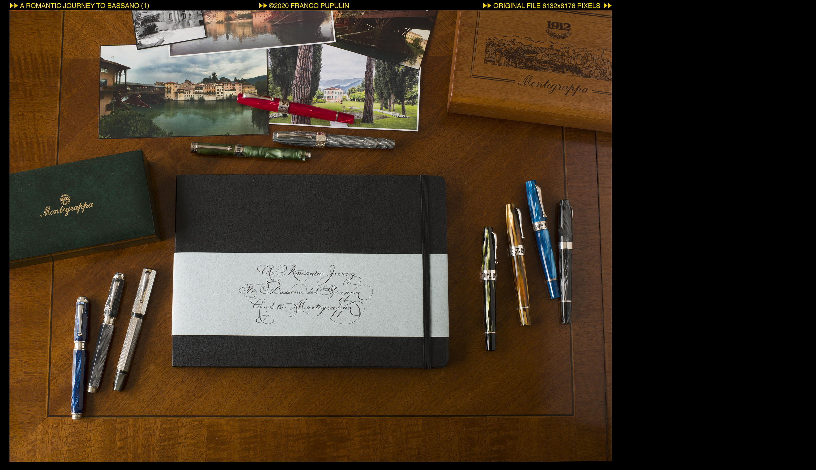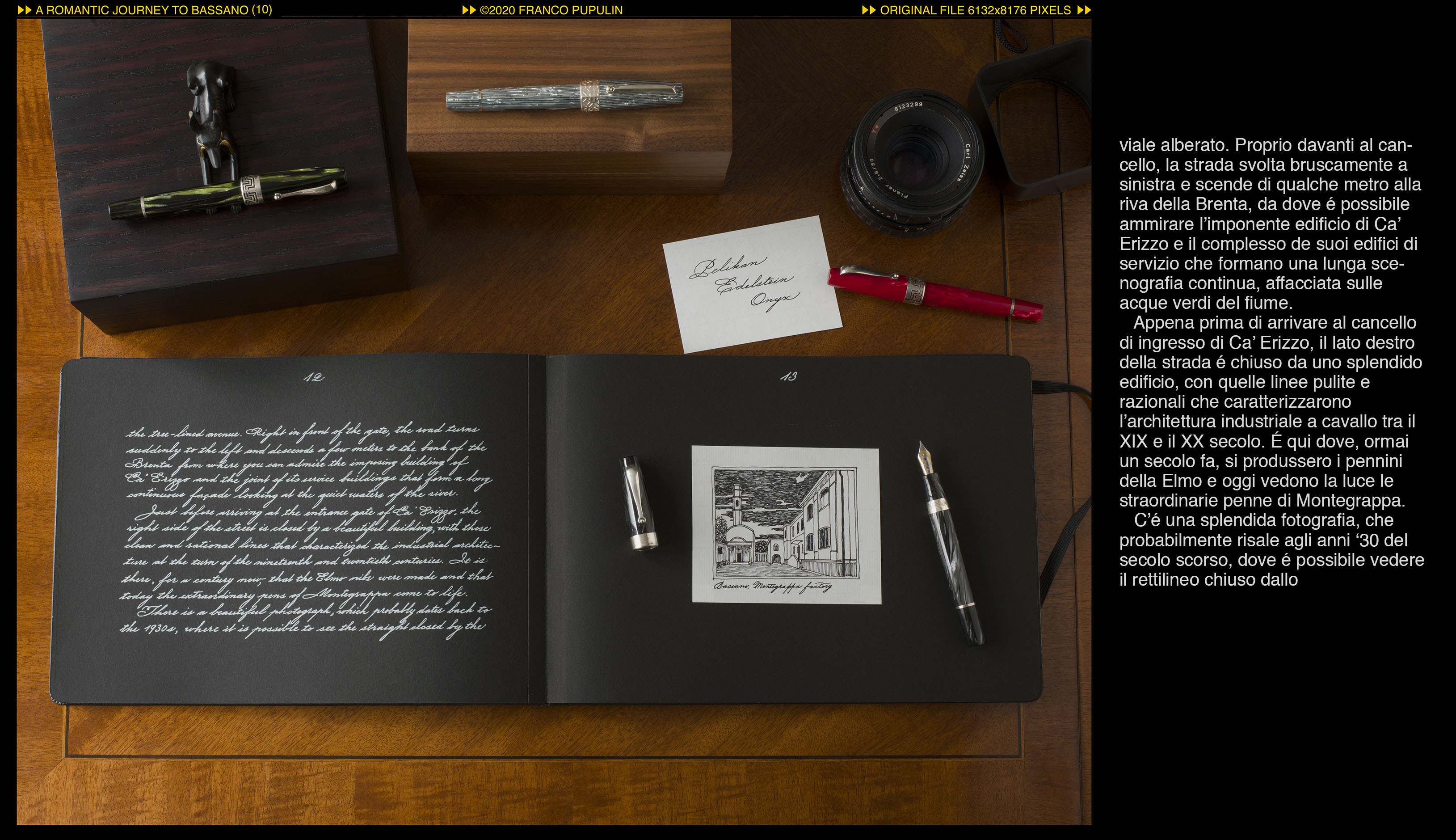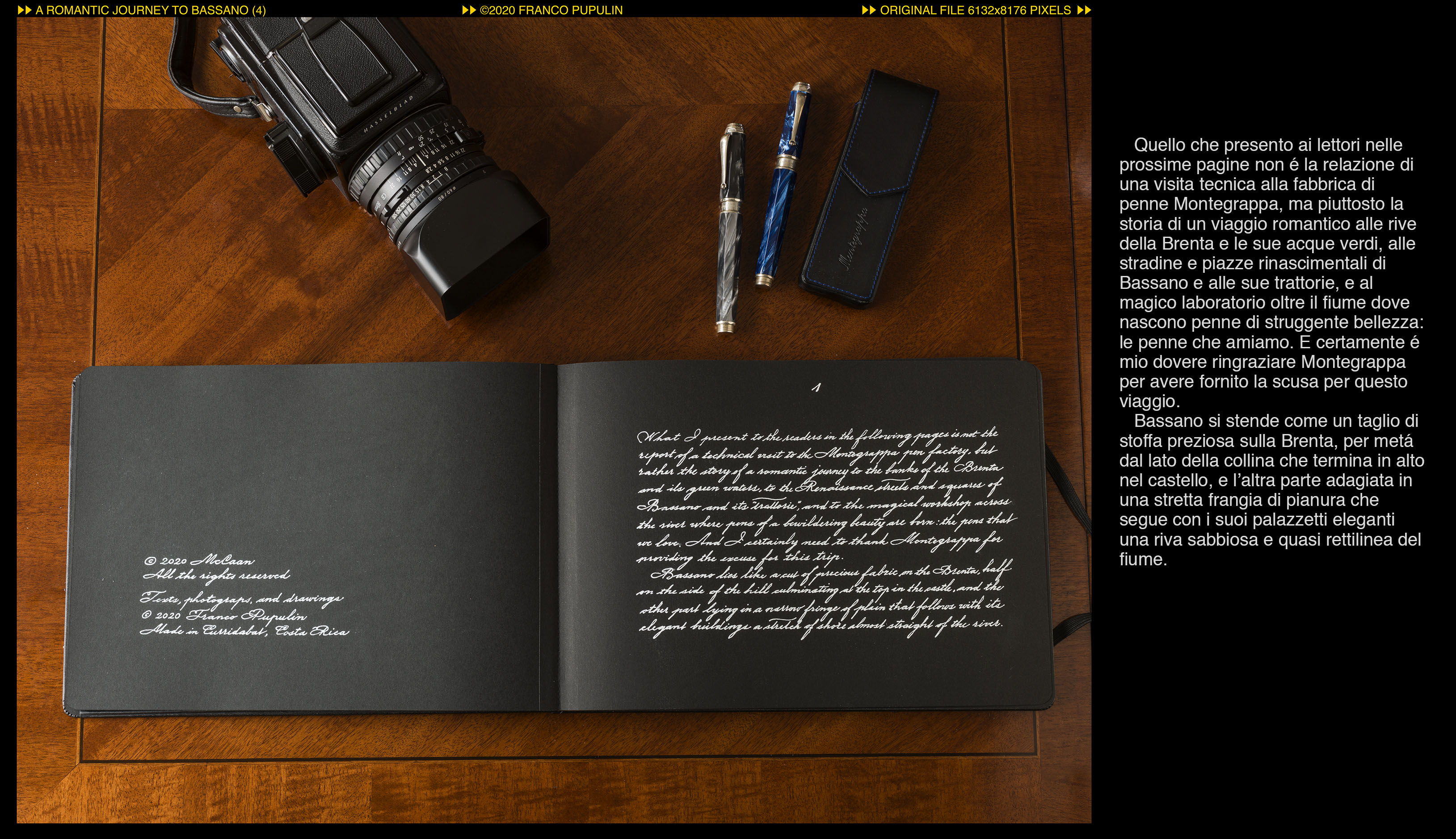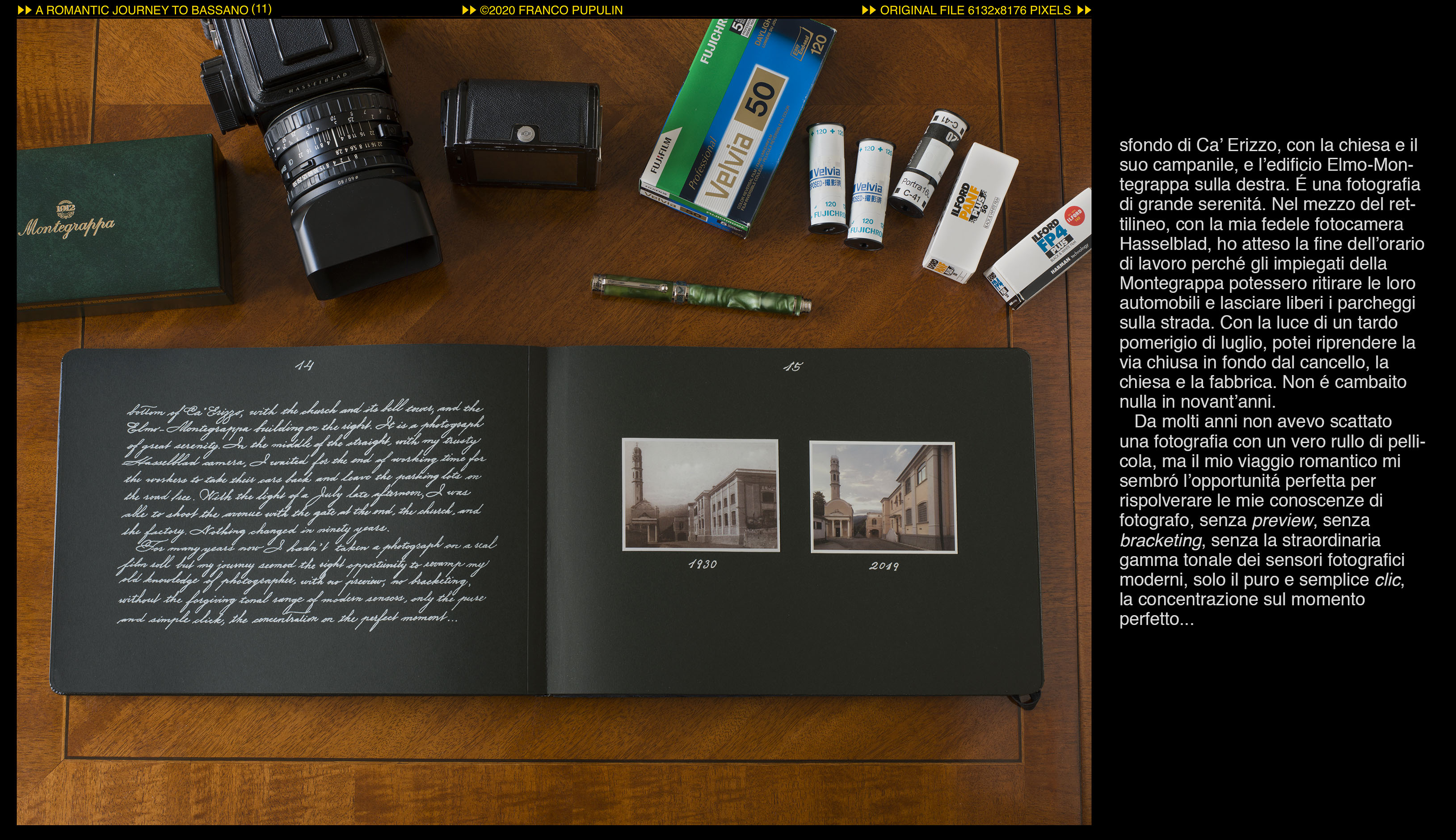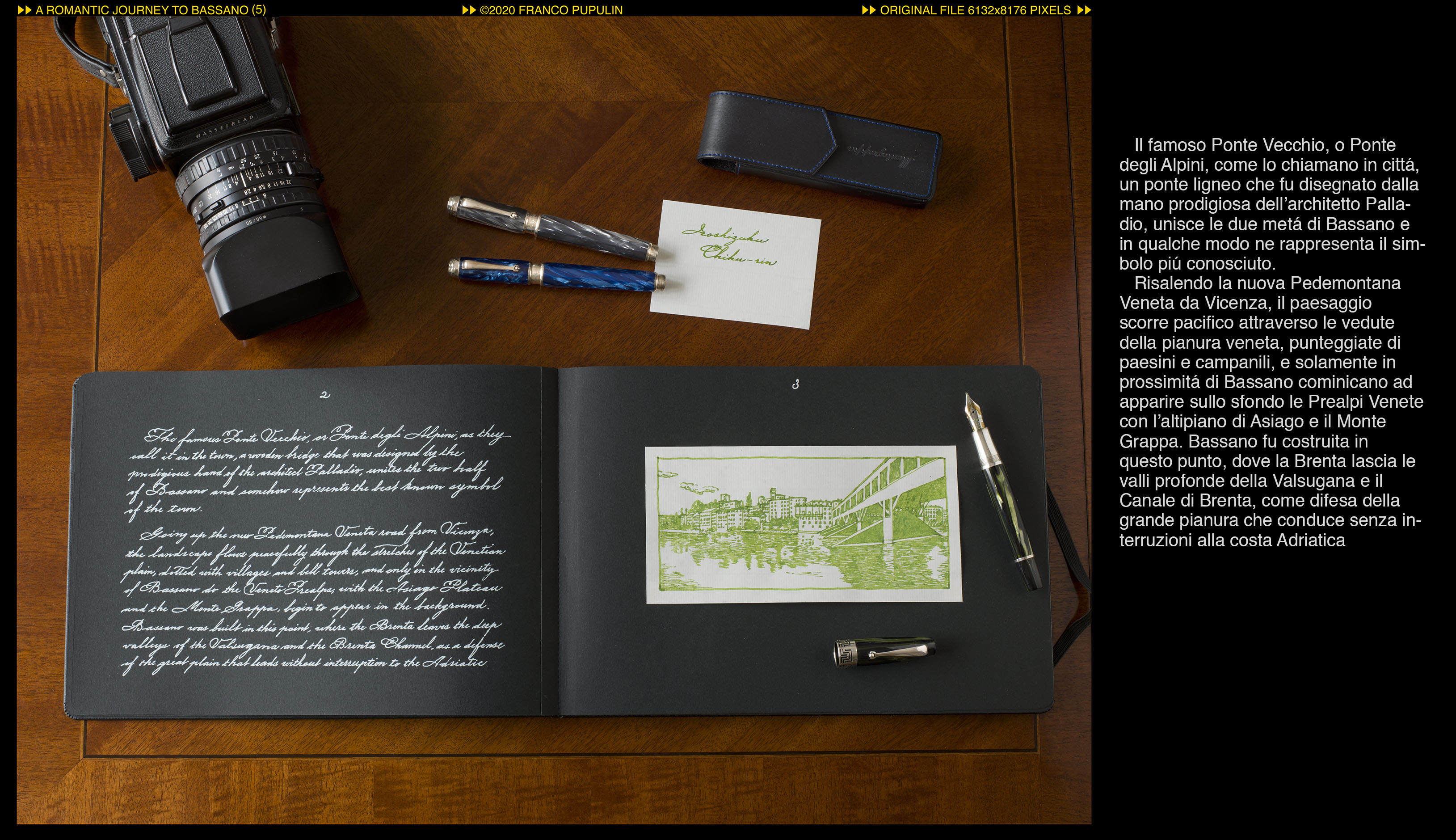 Inizialmente, l’album avrebbe dovuto essere solamente un classico album di fotografie con le loro didascalie. Poi è diventato una specie di racconto illustrato, e il racconto è stato scritto in grafia corsiva. Il risultato d’insieme, con quell’album nero, con le fotografie e gli schizzi, e quel testo corsivo scritto in bianco, mi è infine parso sufficientemente “romantico” da suggerire il titolo del lavoro: “Un viaggio romantico a Bassano del Grappa e alla Montegrappa”.