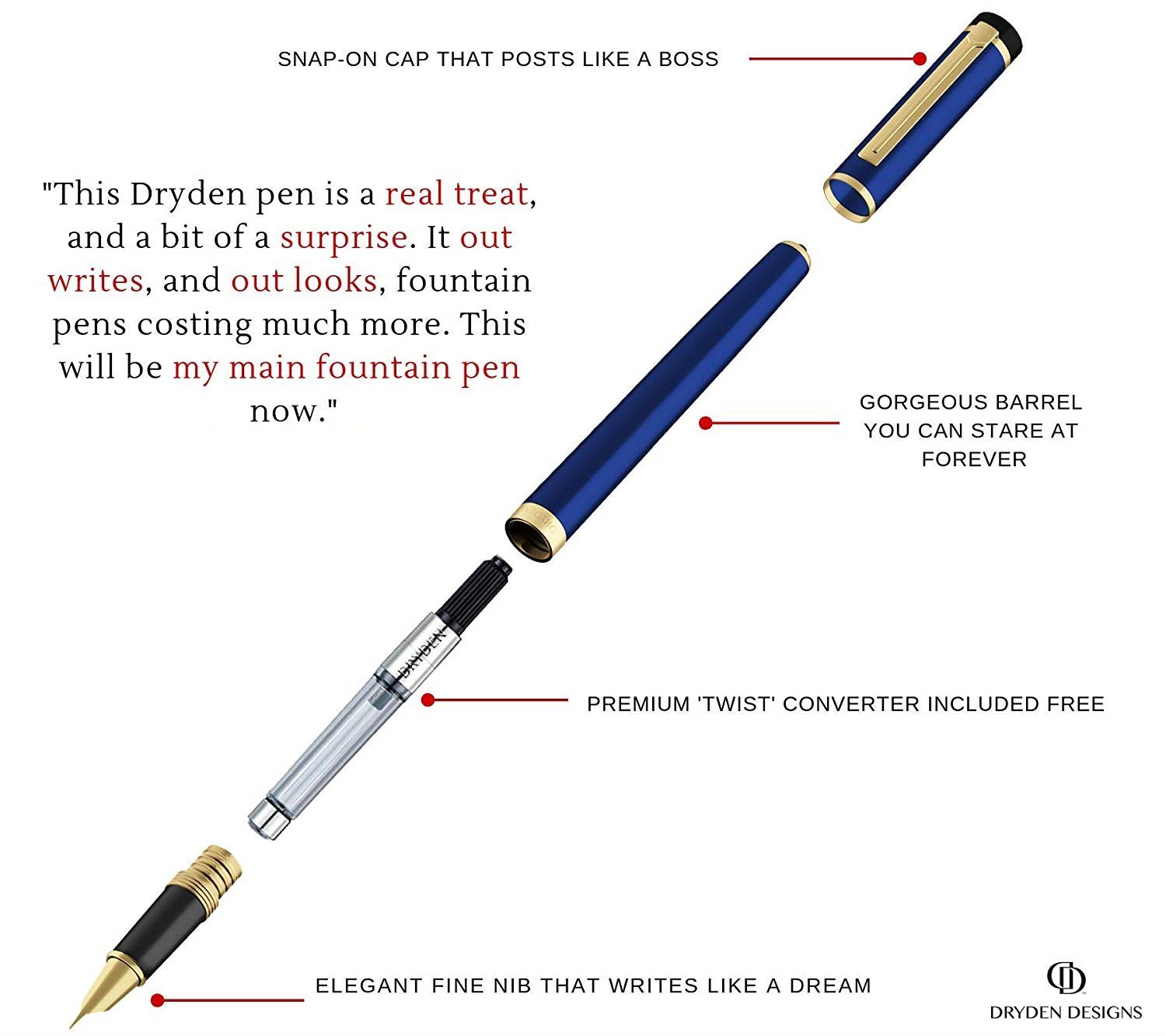 Qualche mese fa ne avevo messa una nel carrello su Amazon, poi per un motivo o per l'altro non l'ho più presa. Produttore inglese a conduzione familiare, si legge nel sito. Dryden si è messo in gioco per produrre penne dopo le gran delusioni avute dalle marche esistenti... Mah, un po' sborone, visto che queste penne sospetto siano fabbricate da cima a fondo in Cina (anche se il CQ resta la cosa più importante), ma ognuno crea i propri miti per tornaconto personale.