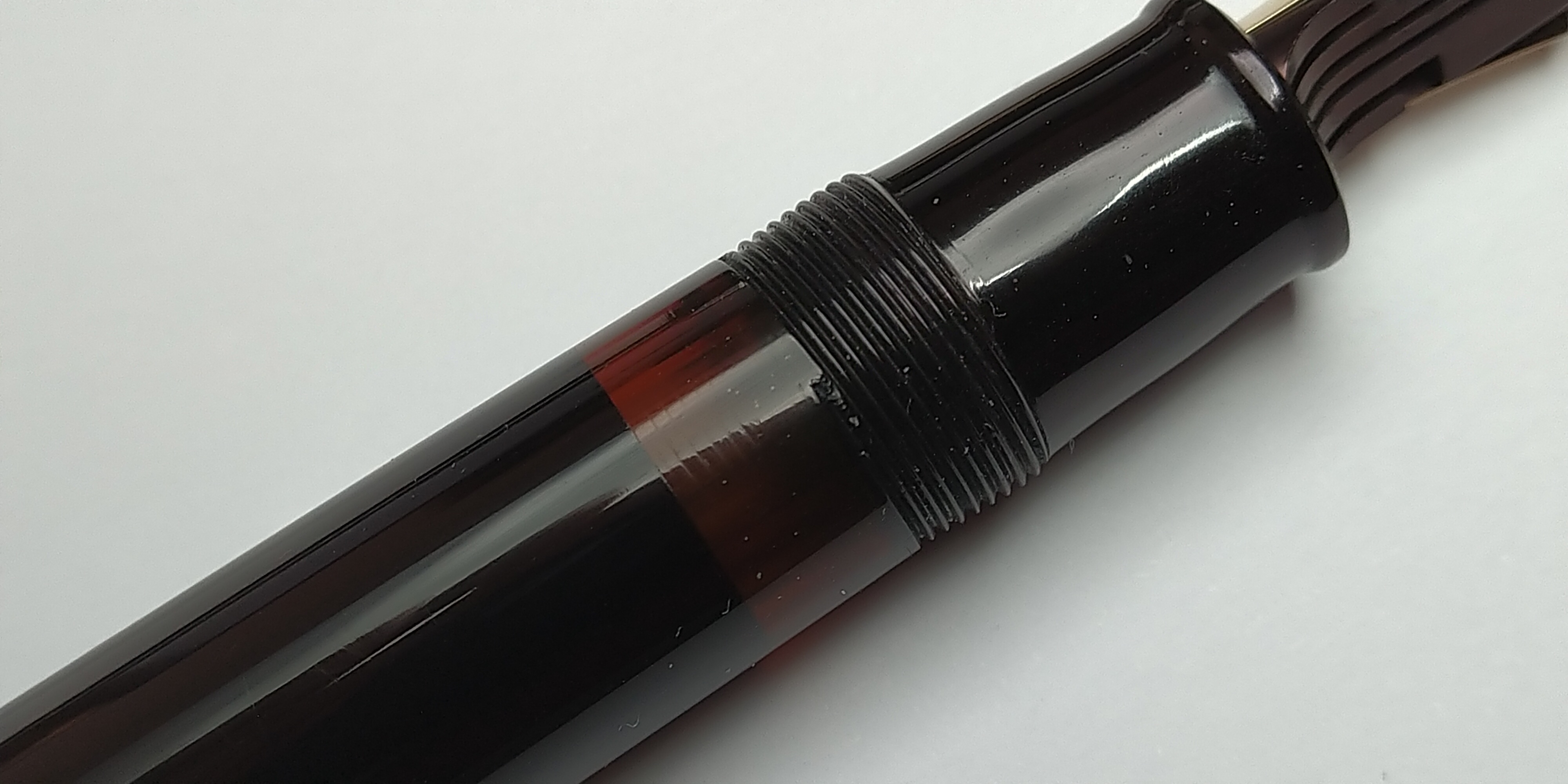 La penna è in celluloide nera, in assoluto il mio materiale preferito utilizzato per le penne stilografiche: quando la si prende tra le mani, si nota subito la caratteristica igroscopica della celluloide, è piacevolissima al tatto e per quanto alla sola vista possa sembrare delicata, in mano la si avverte come una penna molto solida. Ogni volta che si leva il cappuccio si sprigiona da esso un inebriante profumo di canfora, dettaglio molto apprezzato (e abusato) dal sottoscritto. Appena al di sotto della filettatura su cui si avvita il tappo, è presente una finestrella di un bel colore ambrato per visualizzare il livello di inchiostro. Non è difficile trovare queste penne con discolorazioni del fusto, quest'ultimi venivano prodotti in celluloide trasparente successivamente colorati con un sottile strato di celluloide liquida nera, ed è del tutto normale che col tempo e con l'utilizzo quel sottile strato venga piano piano asportato, rivelando in modo graduale la natura trasparente del corpo. La mia fortunatamente non presenta per ora questo problema, le sottili linee della finestrella si sono leggermente cancellate. La qualità costruttiva di questa penna è impressionate, dalla celluloide di ottima qualità al metallo utilizzato per le finiture, ogni particolare è curato alla perfezione così da creare non solo uno strumento da scrittura esteticamente gradevole ma anche dalla funzionalità eccellente.