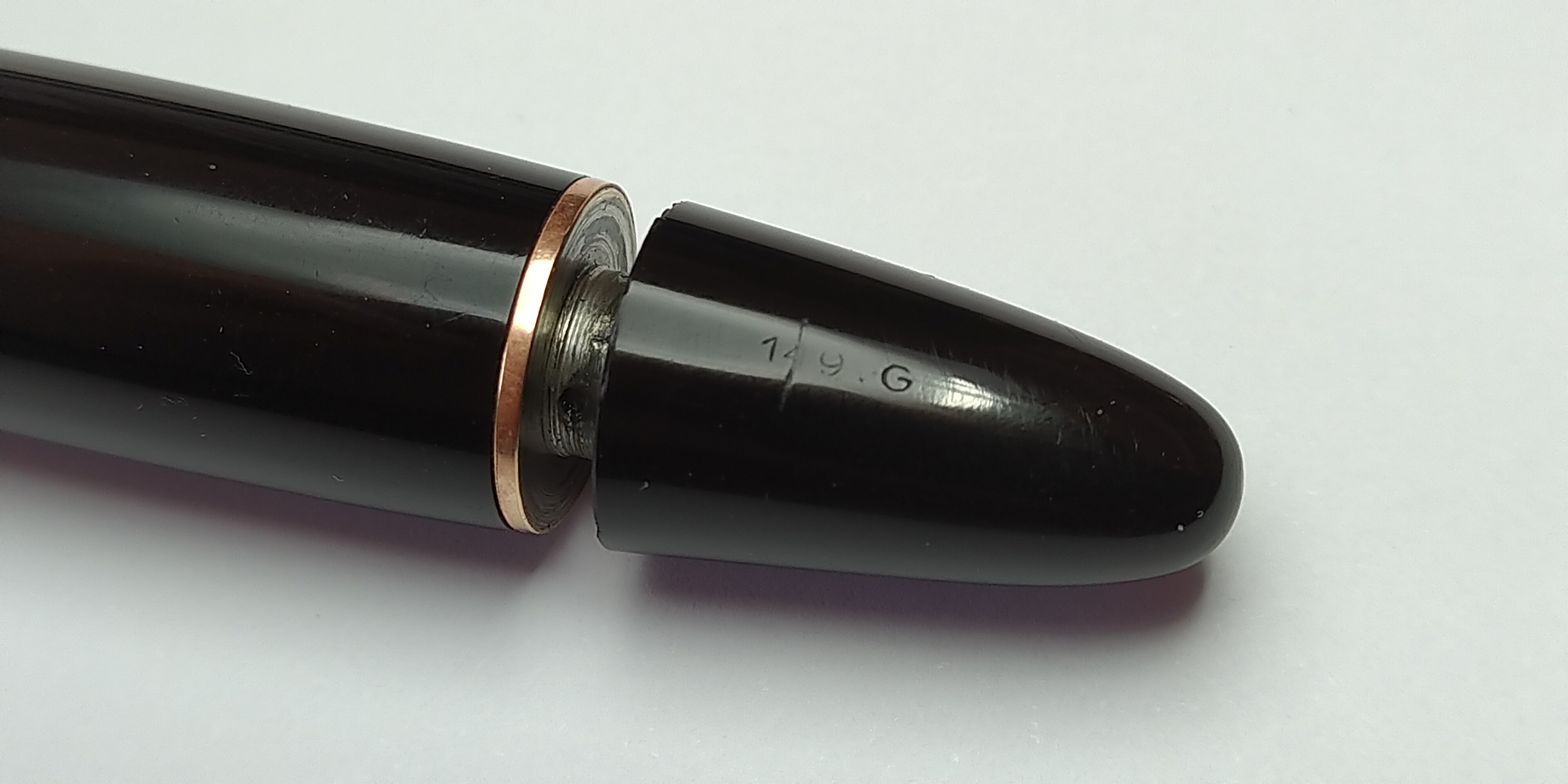 Il pennino è imponente, il disegno elegante e fine lo rendono molto piacevole da ammirare. In base alla grafica dello stesso (e anche all'incisione 149G sul fondello di caricamento) è stato possibile collocare questa penna nella prima produzione, in quanto il pennino appartiene all'ultima versione della 139 (lo si riconosce dal pattern a righe tra il cerchio e la stella al centro del pennino, non presente sui i pennini successivi). Di seguito vi lascio osservare le performance del pennino grazie ad alcune foto. Le versioni dei primi anni montavano un'alimentatore piatto e sottile, soprannominato Ski-slope Feeder per la sua particolare geometria e per i solchi longitudinali che lo attraversano. Anche questo esemplare è dotato dell'alimentatore piatto: nonostante sia molto gradevole da guardare non sopporta molto bene gli sbalzi di temperatura e di pressione, essendo sprovvisto delle classiche alette per contenimento dell'inchiostro sul retro dell'alimentatore stesso. Per quanto concerne le votazioni inerenti alla scrittura, non può che ottenere anche qui il massimo dei voti; l'unico difetto di cui potrei lamentarmi è appunto l'alimentatore, ma del quale ci si accorge veramente in poche occasioni. Il flusso controllato dall'alimentatore è perfetto, sufficientemente abbondante da riempire il tratto durante la flessione del pennino.