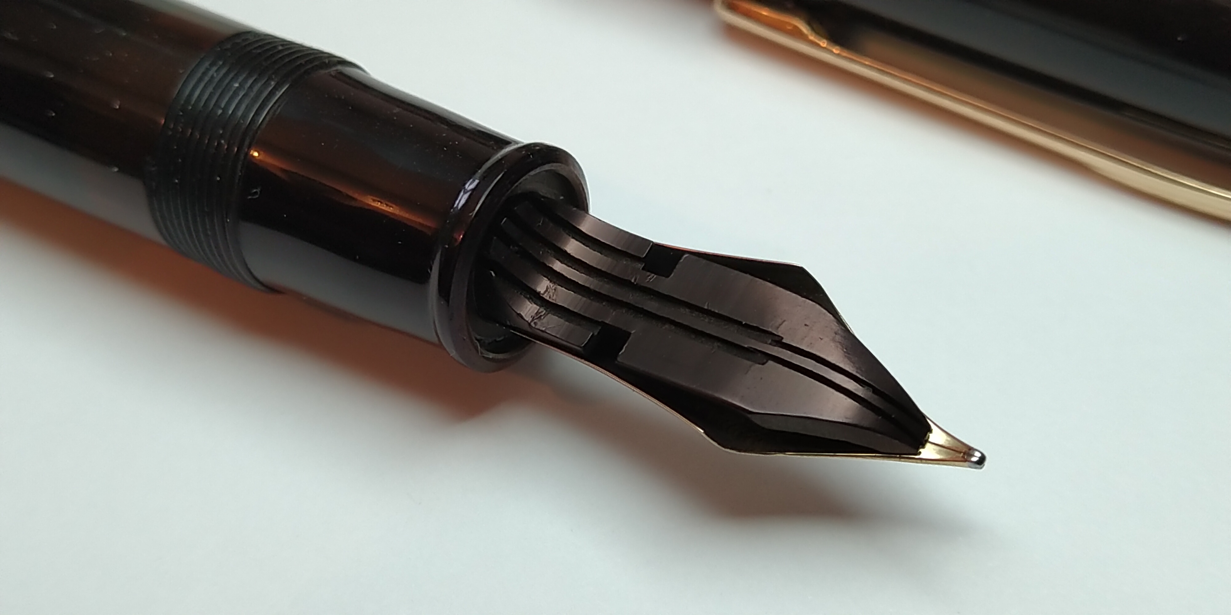 Non avrei mai pensato di poter trovare un pennino come questo. Anche se sembra che io sia dominato dall'euforia che provo per questa penna, chiedo a tutti quelli che hanno avuto l'opportunità di provarla a Bologna e in altre occasioni (ricordo che il grande Fab66, persona veramente squisita, ne rimase assai soddisfatto) di esprimere liberamente le loro impressioni riguardo a questa meraviglia. Chiedendo venia per il piccolo momento autocelebrante, procedo a parlare del pennino. Mi è difficile dargli una gradazione precisa, lo collocherei tra un M e un B con un leggerissimo taglio obliquo verso destra (Right Foot Oblique), la sua piacevolezza e scorrevolezza sono sensazionali, ogni sessione di scrittura è un'esperienza unica. La sua flessibilità è spettacolare, non solo per la grande variazione del tratto, ma per il comportamento elastico del pennino: ottimo controllo durante la fase in pressione e grande precisione nel ritorno alla posizione iniziale, senza che quest'ultimo risulti troppo rapido o troppo lento. Scrivere con questa penna è un autentico piacere, l'impugnabilità della penna è eccezionale, inizialmente ero dubbioso riguardo alla particolare forma della sezione, ma mi sono dovuto ricredere.
