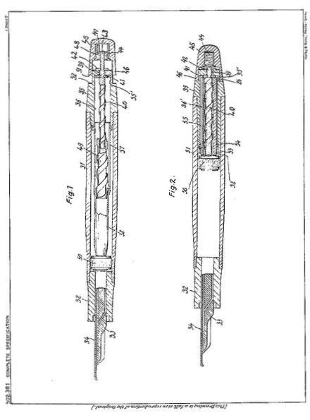 Ad essere sincero, questo è stato uno dei motivi per il quale mi sono avvicinato al questa penna. Il caricamento è a stantuffo telescopico, un meraviglioso sistema di caricamento equipaggiato su tutti i modelli della fascia Meisterstück e alcuni della seconda fascia. Se vi ricordate, alla voce delle dimensioni della penna ho aggiunto anche la sua capacità effettiva. Non ho sbagliato a digitare, questa penna ha un'incredibile capienza di inchiostro pari a 3.2 mL caricata al massimo. Ciò è reso possibile grazie all'ingegnoso sistema di caricamento, costituito da due alberi coassiali che si innestano uno dentro l'altro, aumentando di molto la corsa del pistone. Di seguito vi riporto un'immagine presa dall'archivio dei brevetti del Wiki che mostra la penna in due casi diversi, una con il pistone completamente esteso e l'atra con il pistone contratto, notate l'escursione del pistone.
