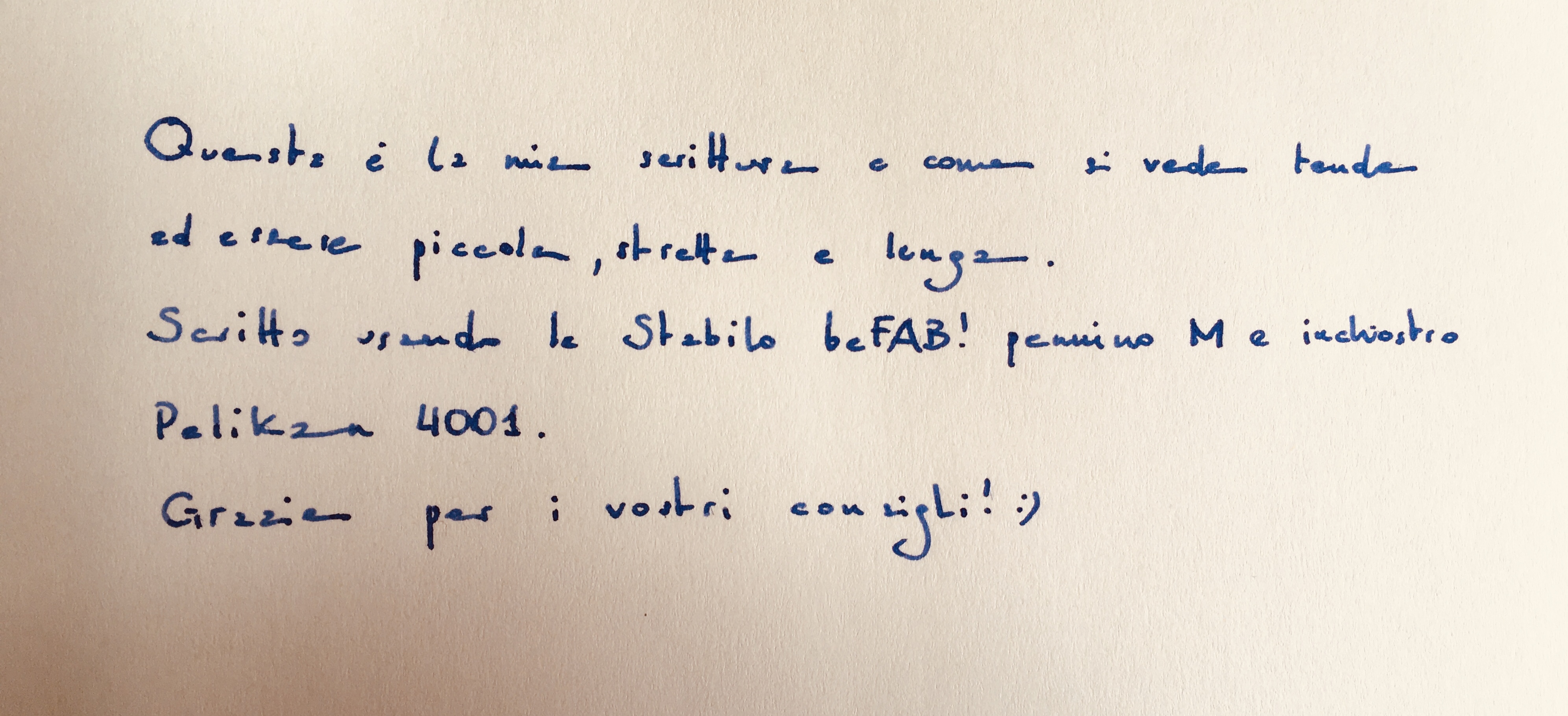- Stabile beFab! - Inchiostro Pelikan 4001 - pennino M - pagata 10€ ed è quella con cui mi trovo decisamente meglio, tratto fine, morbida, tratto consistente e comoda da impugnare