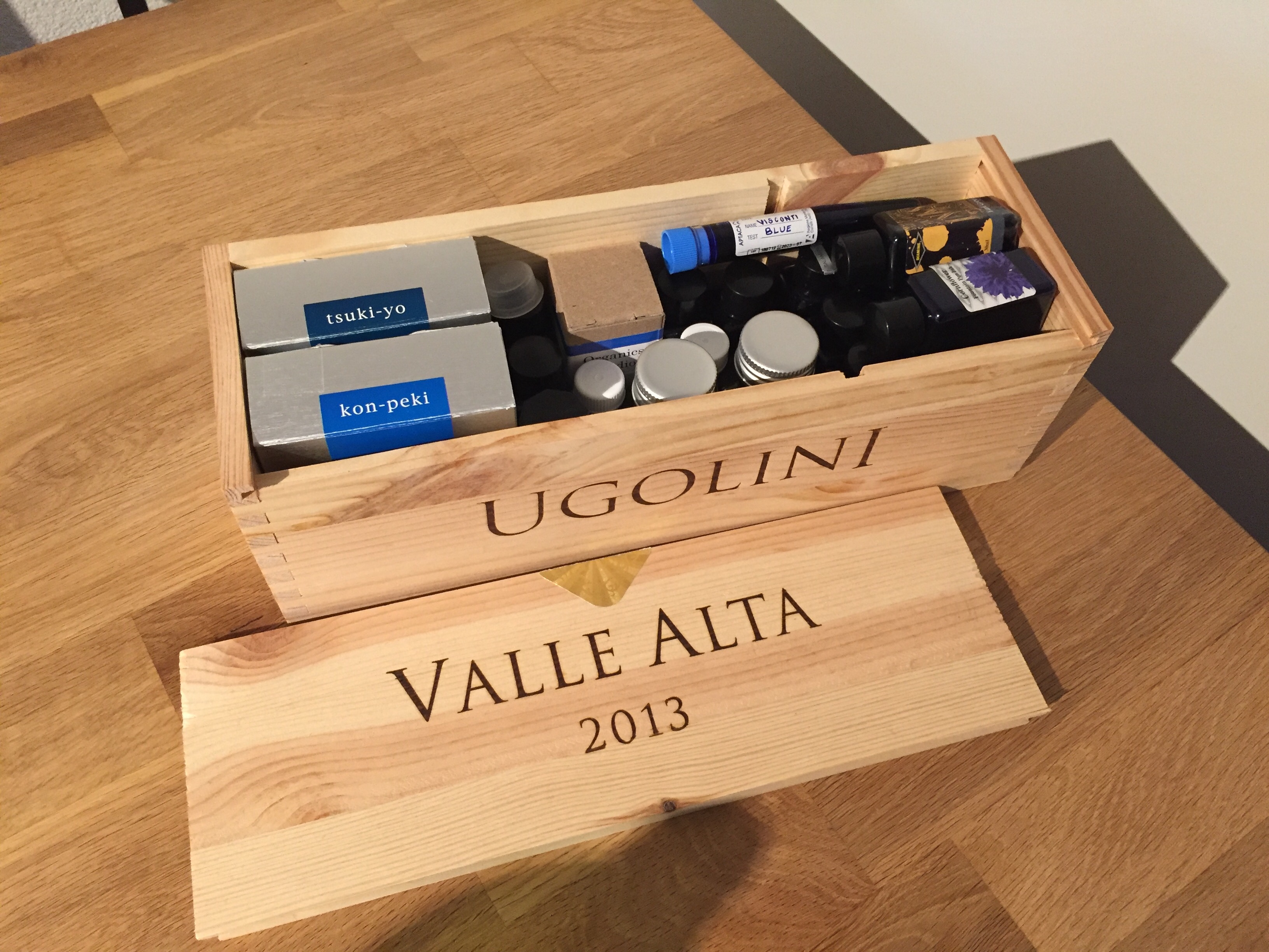 Io tengo alcuni dei miei inchiostri in una cassettina che un tempo conteneva Amarone di Fumane (in Valpolicella).