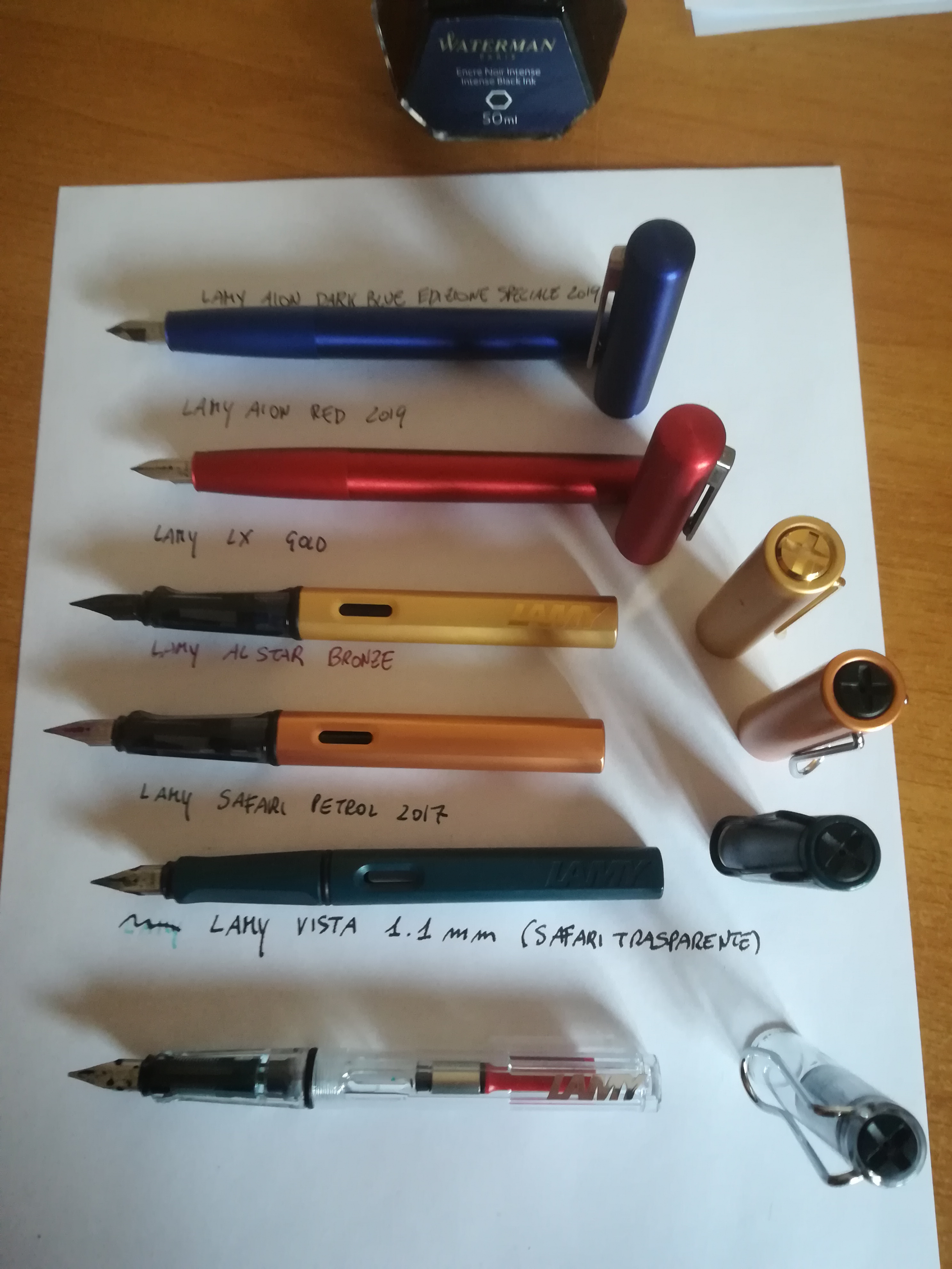 Per quanto riguarda Lamy, le penne che hai indicato hanno una caratteristica in comune, montano lo stesso pennino, per cui scrivono allo stesso modo. Tuttavia l'esperienza di scrittura potrebbe essere molto diversa, perchè passi da una penna come la Al-Star che ha una impugnatura ergonomica in cui la posizione delle dita deve essere quella corretta, ad una penna sottile come la cp-1, passando per una impugnatura classica come la Aion. In una situazione ideale ti direi di andare in negozio e provare a prenderle in mano prima di scegliere quella che senti meglio nella mano, potendo anche scegliere la larghezza del pennino. In questo momento mi rendo conto che non sia possibile, e se compri online non puoi prendere la penna in mano o vedere la larghezza del tratto. Devi per forza fidarti del tuo istinto. Con Lamy non caschi male, è il marchio di penne più venduto in Germania e lì le penne stilografiche sono ancora obbligatorie nelle scuole. Come pennino ti direi M o F, a seconda delle tue preferenze e della tua calligrafia. Se sbagli, con Lamy non è un problema, il pennino si può sostituire con uno di ricambio, che costa circa 5 Euro, senza smontare la penna, basta un po' di pazienza ed un pezzo di nastro adesivo per toglierlo senza rovinarlo.