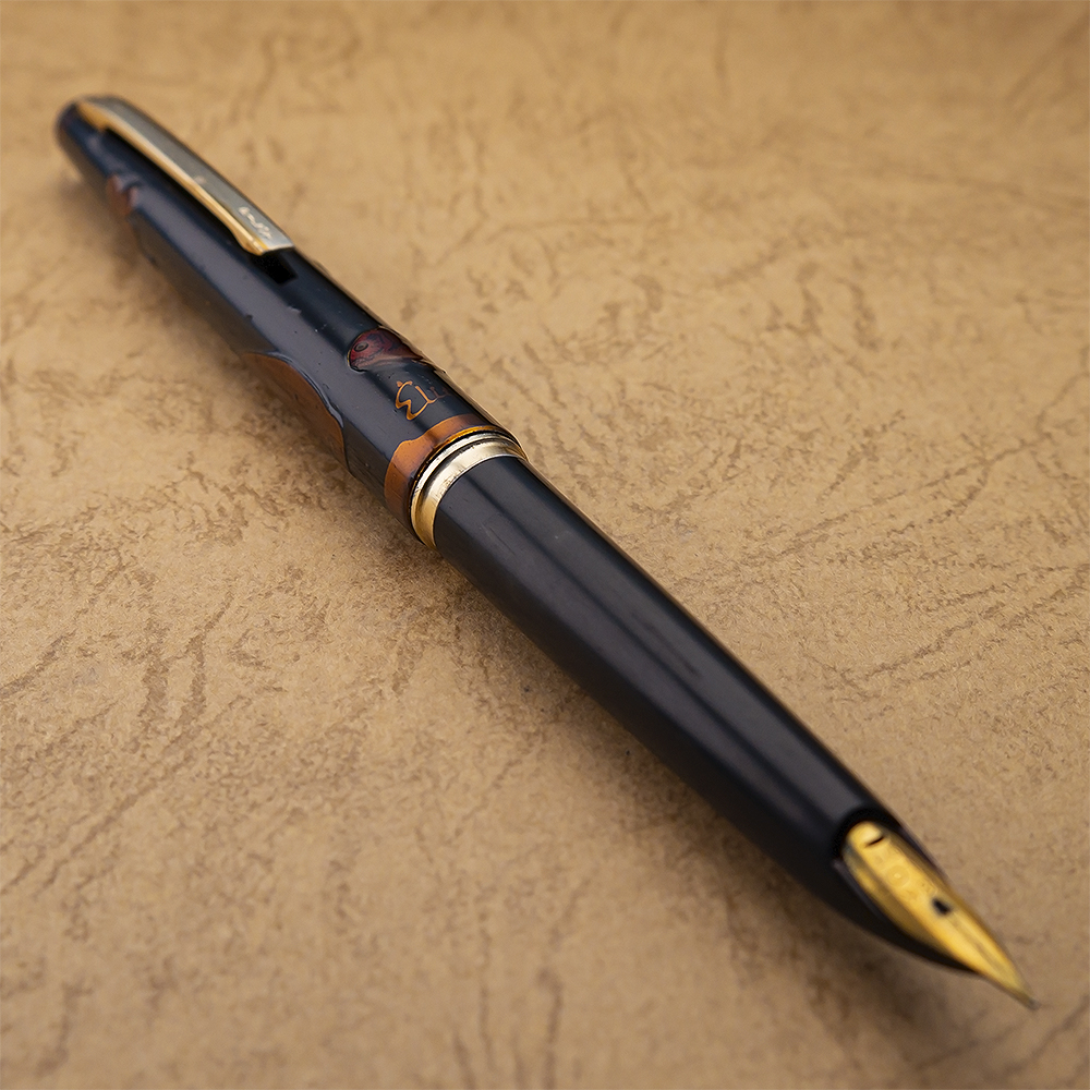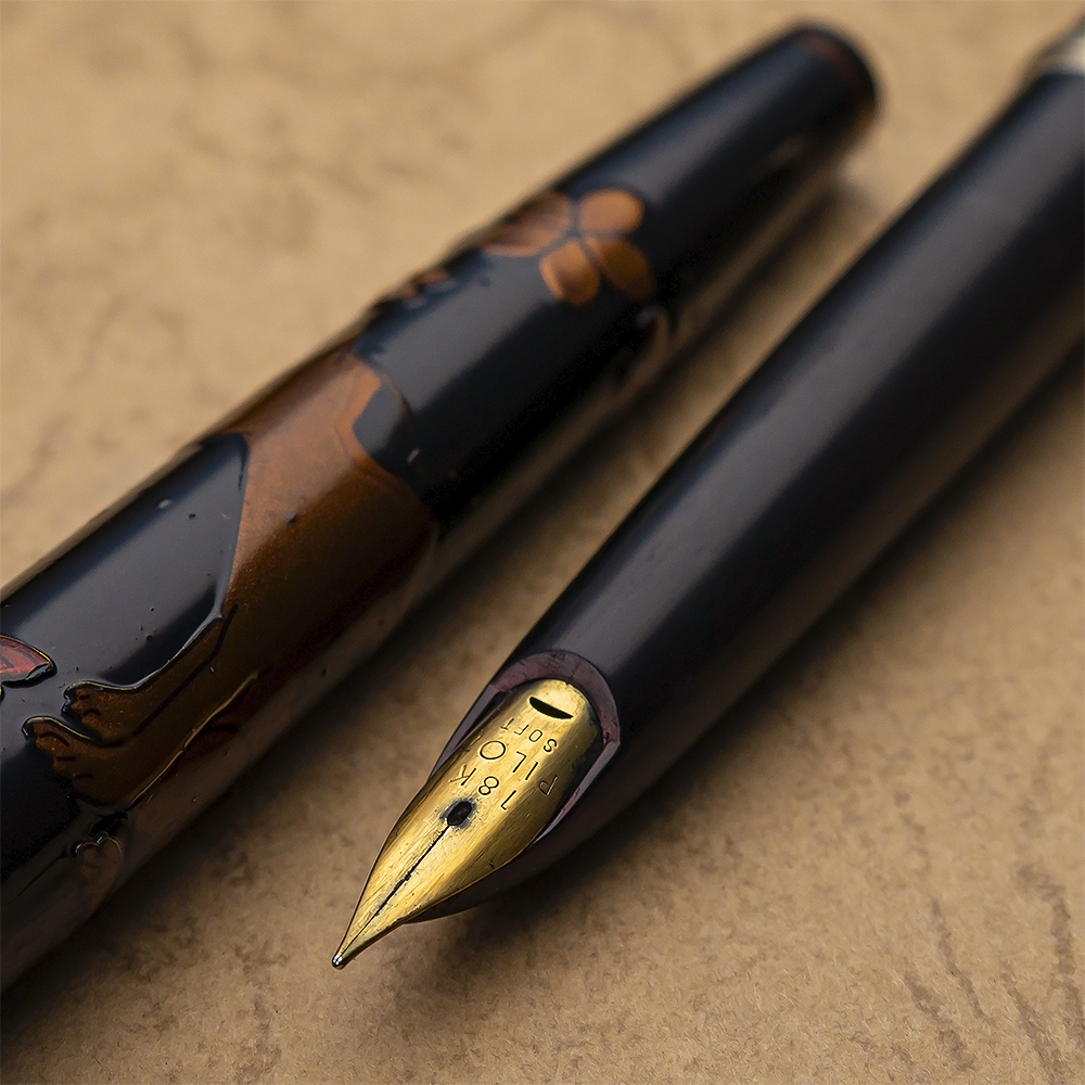 Io invece guardando questa penna (e altre simili a questa) e le moderne urushi maki-e vedo una differenza qualitativa, diciamo nelle finiture e nei colri del disegno molto importante tra queste e le ultime, le ultime sono (o a me sembrano) molto piu' rifinite e colorate. Mi sta venendo in mente che magari quello era il periodo in cui hanno seriamente iniziato a sperimentarci sopra sulle penne, perche' sia la laccatura urushi che i vari tipi di maki-e sono robe secolari