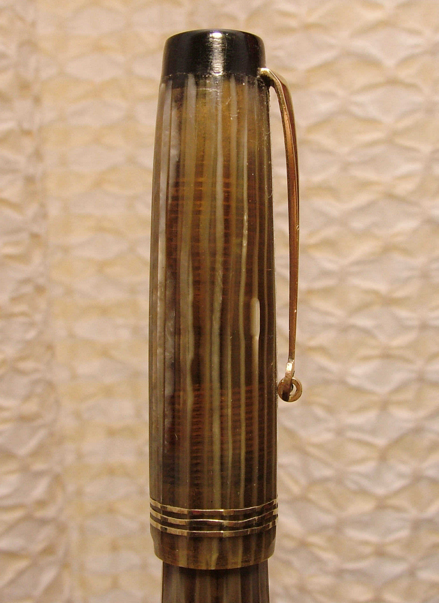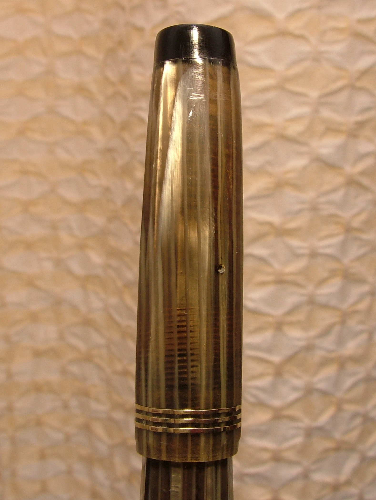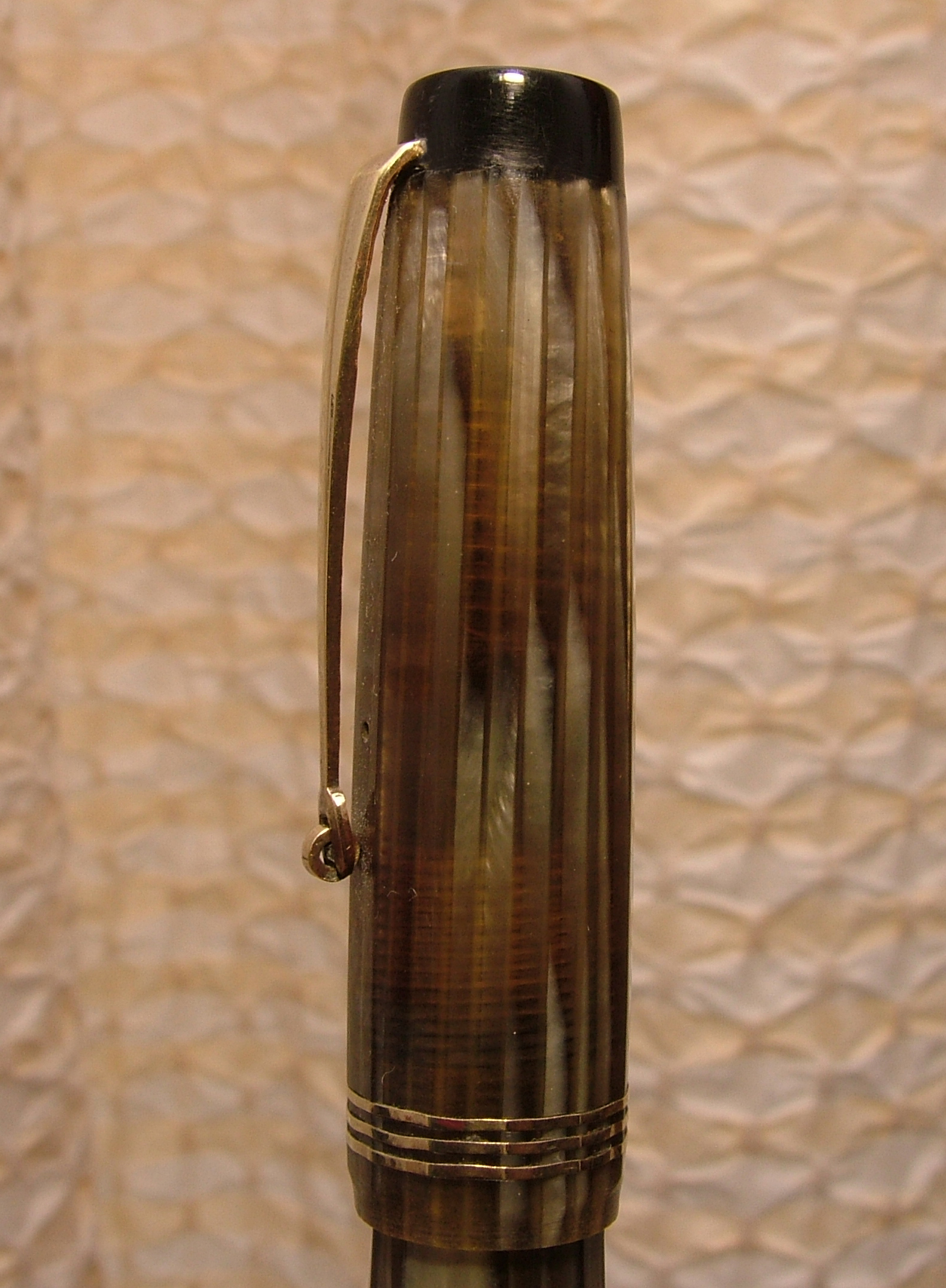 Ora, nella sua penna, tutte le "lamine" sono all'incirca uguali nel loro spessore, il che mi farebbe pensare che una celluloide "laminata" sia stata in qualche modo arrotolata e poi tornita. E' una cosa simile all'uso che Pelikan ha fatto della sua resina "tartaruga" per la replica "Tortoiseshell" della M101N. Le lamelle sono bellamente iridescenti, ma tutte dello stesso spessore, e anche in questo caso potrebbe trattarsi di una celluloide "arrotolata". Lei sa se questo si possa fare?