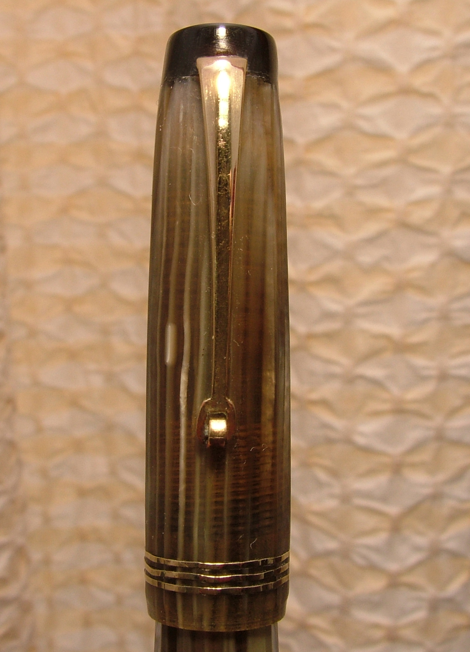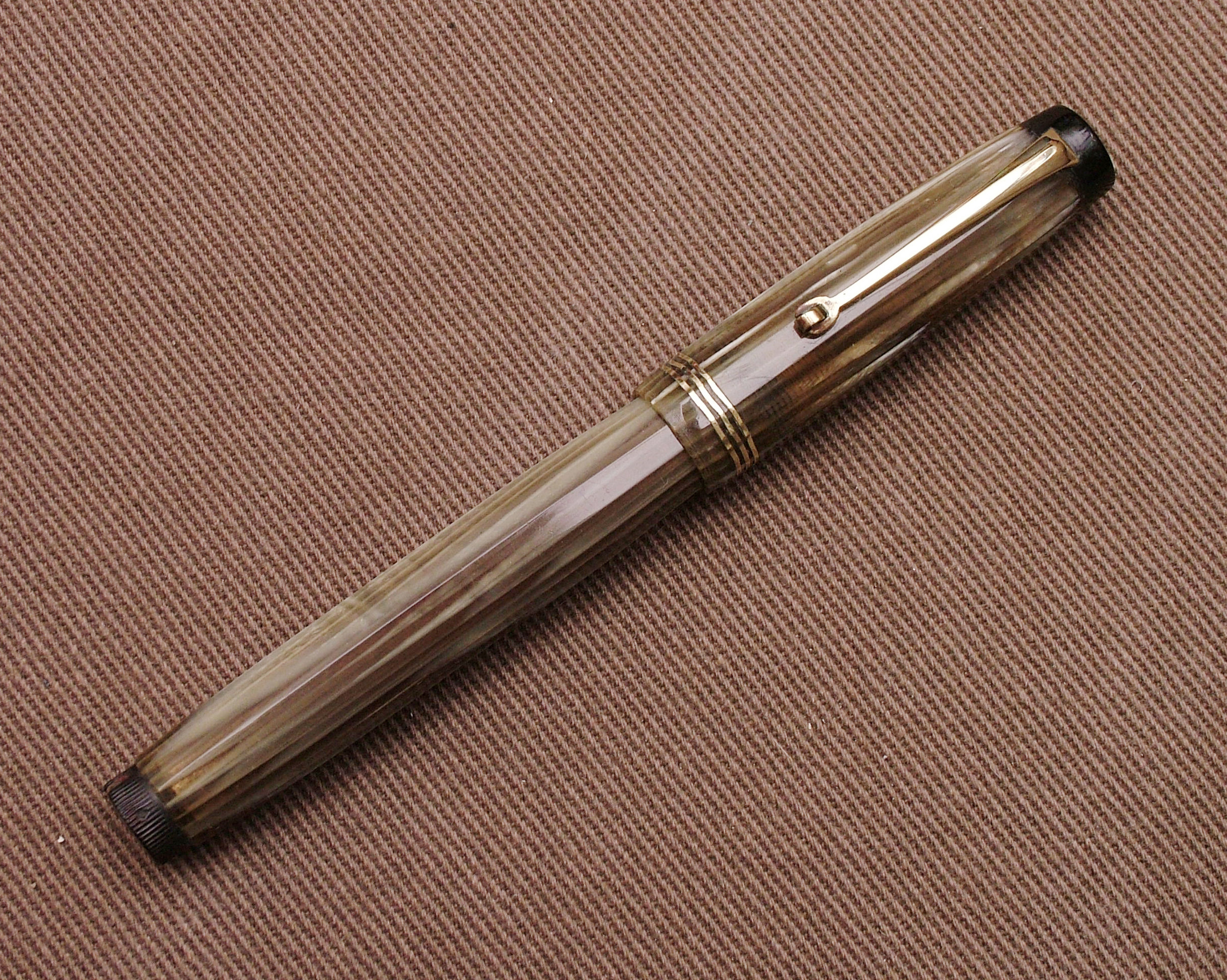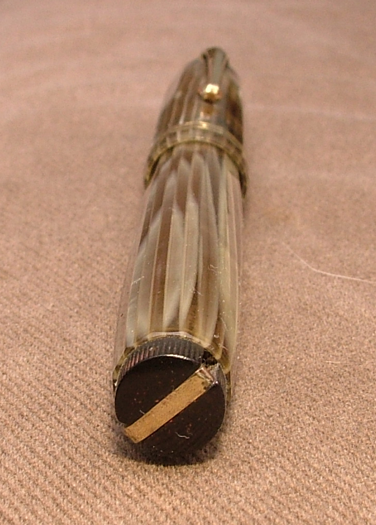 Ora, nella sua penna, tutte le "lamine" sono all'incirca uguali nel loro spessore, il che mi farebbe pensare che una celluloide "laminata" sia stata in qualche modo arrotolata e poi tornita. E' una cosa simile all'uso che Pelikan ha fatto della sua resina "tartaruga" per la replica "Tortoiseshell" della M101N. Le lamelle sono bellamente iridescenti, ma tutte dello stesso spessore, e anche in questo caso potrebbe trattarsi di una celluloide "arrotolata". Lei sa se questo si possa fare?
