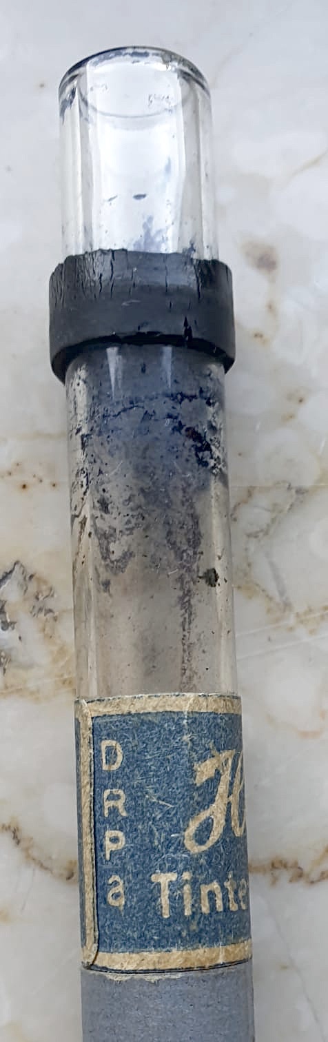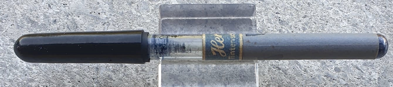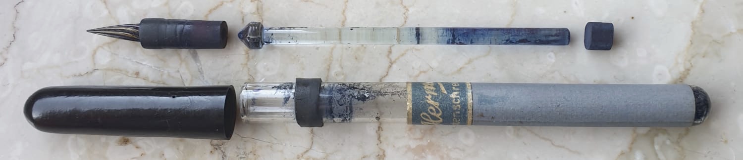 HERMA, Germania. Penna estremamente povera, in vetro e pessima ebanite, rivestita in carta. Ma scrive.