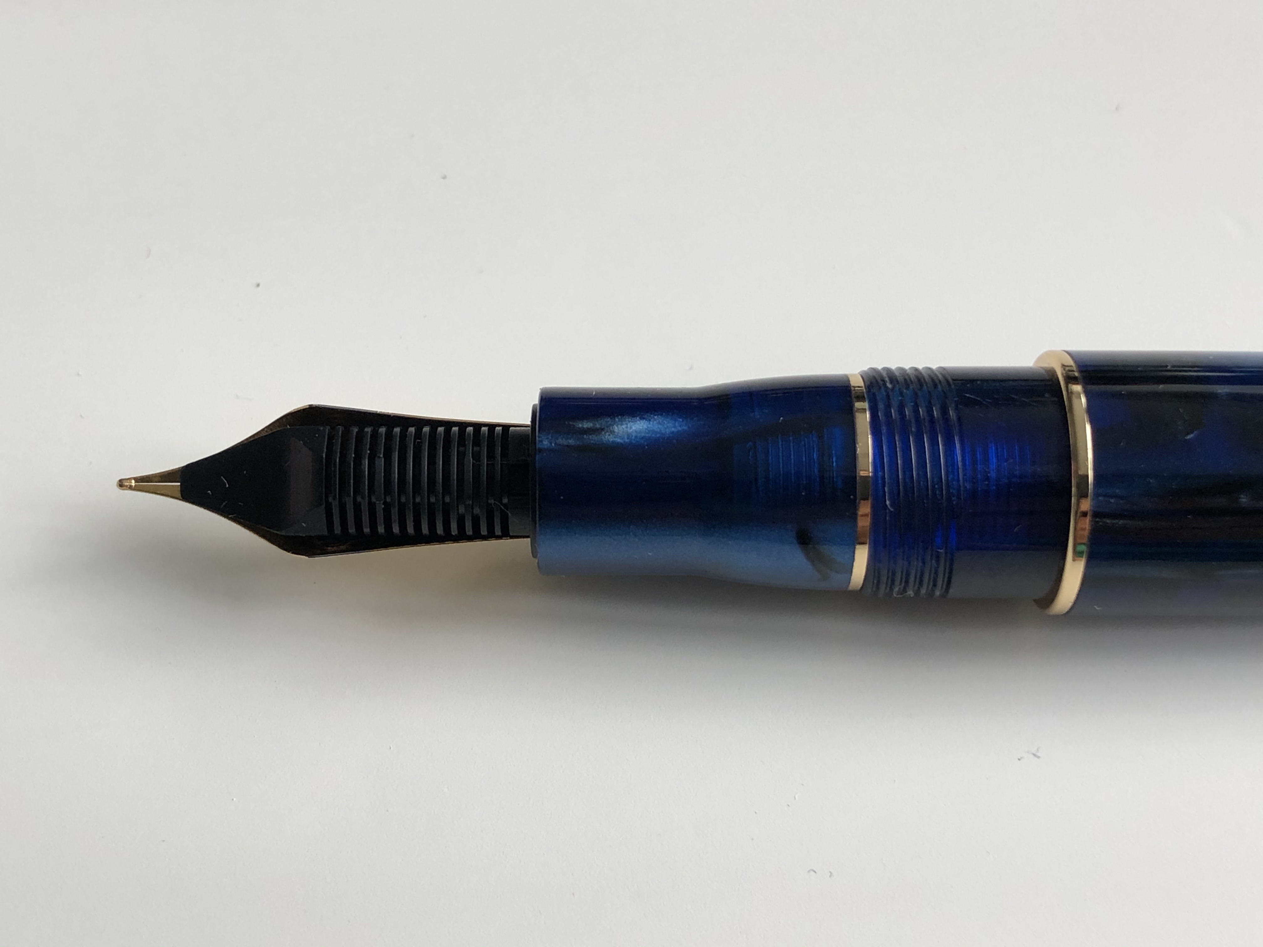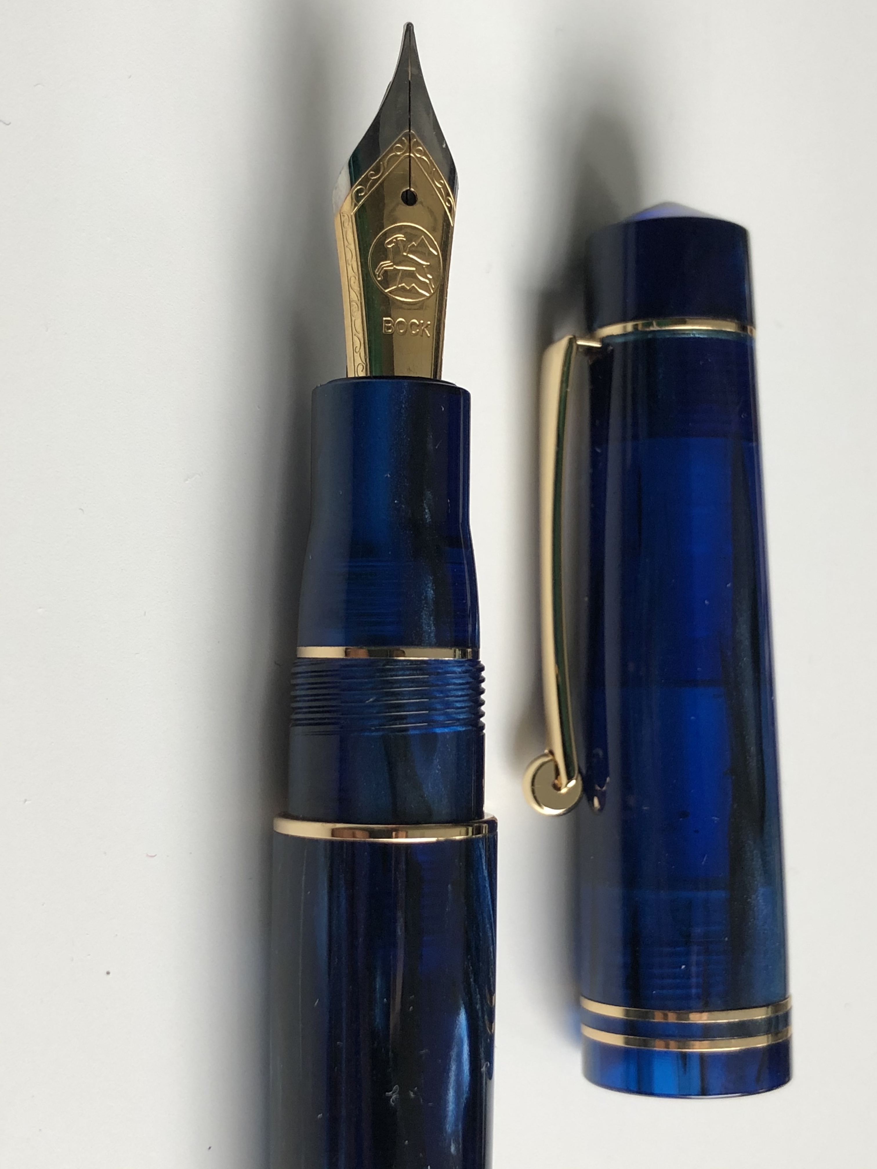 La mia scelta è caduta sul modello con il gruppo Bock. Il pennino è un n. 6, apparentemente disponibile soltanto in gradazione F. La spedizione è stata alquanto veloce: solo 7 giorni lavorativi. Appena tolta dalla scatola e messa alla prova, la penna ha mostrato un tratto molto scorrevole sulla carta, seppur lasci un leggero feedback che non sempre ritrovo sugli altri miei strumenti dotati di pennino di questo marchio.