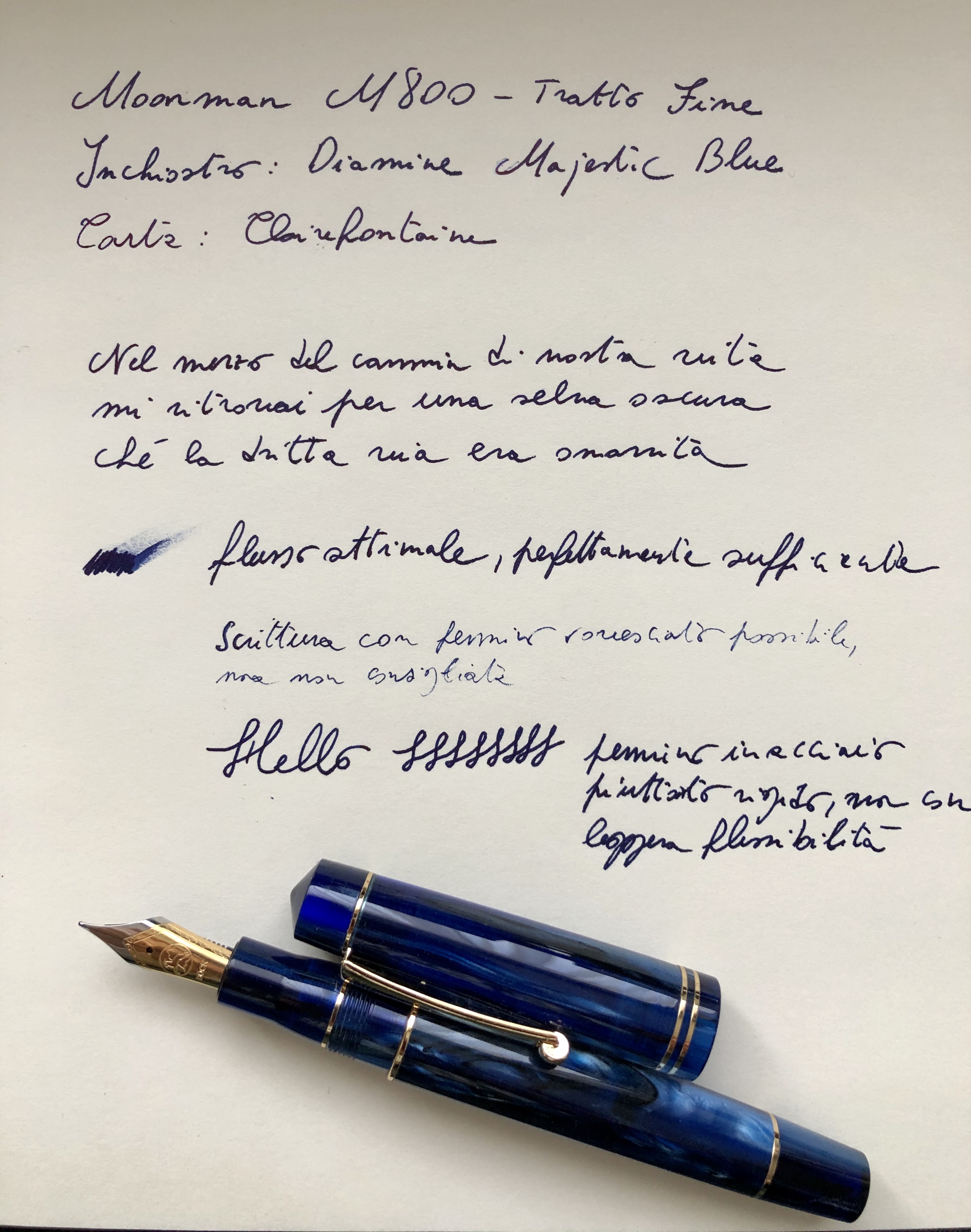 Considerato il rapporto qualità/prezzo, la Moonman M800 è senza dubbio una penna validissima per coloro che amano le penne con caricamento a converter/cartuccia. Le resine impiegate per la produzione sono di ottima valenza estetica, con notevoli variazioni di sfumature e profondità di colore.