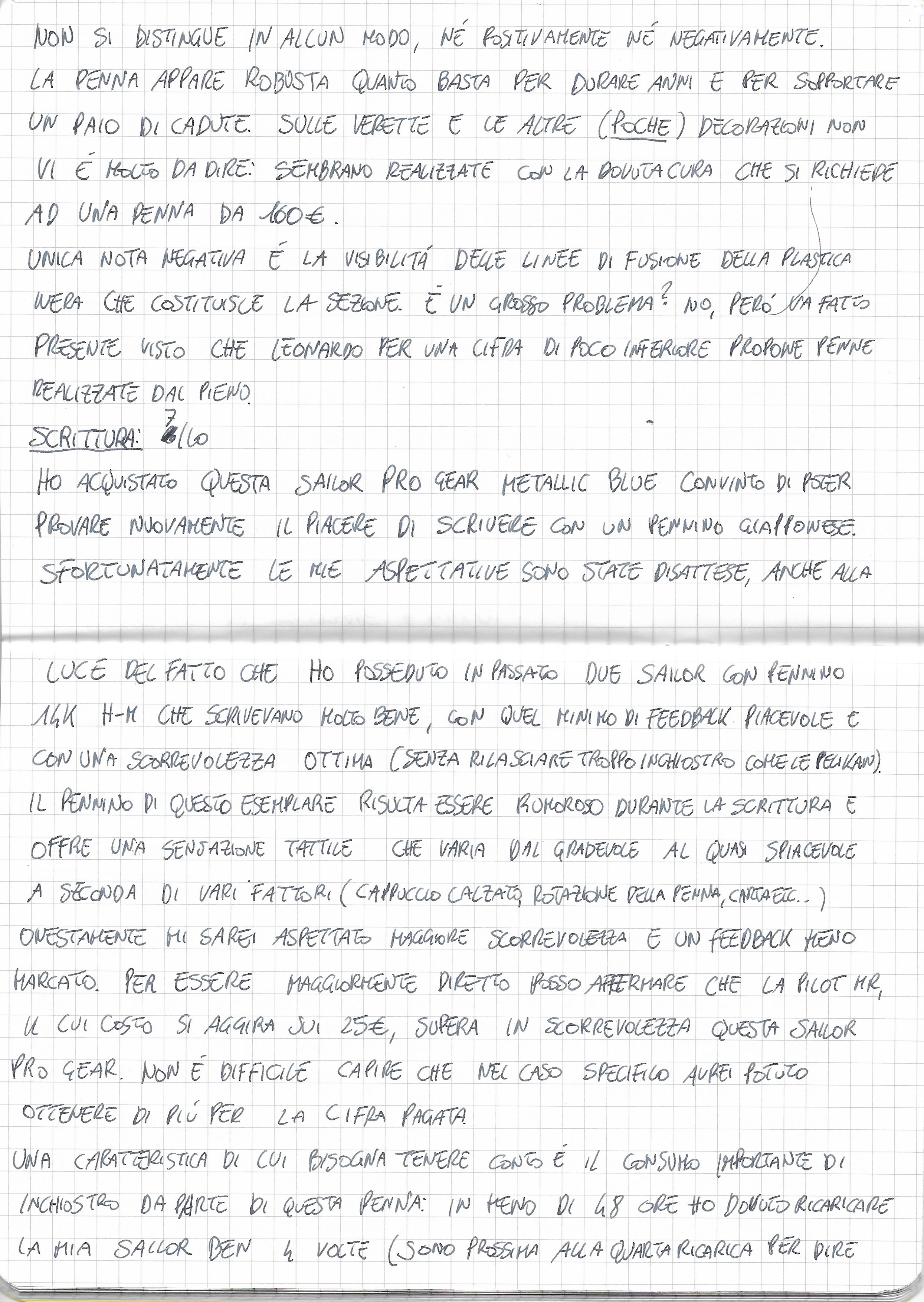 Molti di noi hanno un marchio preferito di penne e vi sono diverse ragioni che ci spingono a preferire una marca ad un'altra. A me piacciono molto le Sailor, così come le altre giapponesine, però quando si fa una recensione bisogna essere obiettivi e cercare di accantonare le proprie preferenze. Questo è uno di quei casi in cui si vorrebbe elogiare il proprio marchio preferito quando i fatti lo impediscono. Segue dunque la mia recensione manoscritta della Sailor Pro Gear Metallic Blue. Perdonate possibili refusi, ogni tanto mi capita di scambiare qualche lettera. Qui di seguito un riepilogo dei voti: