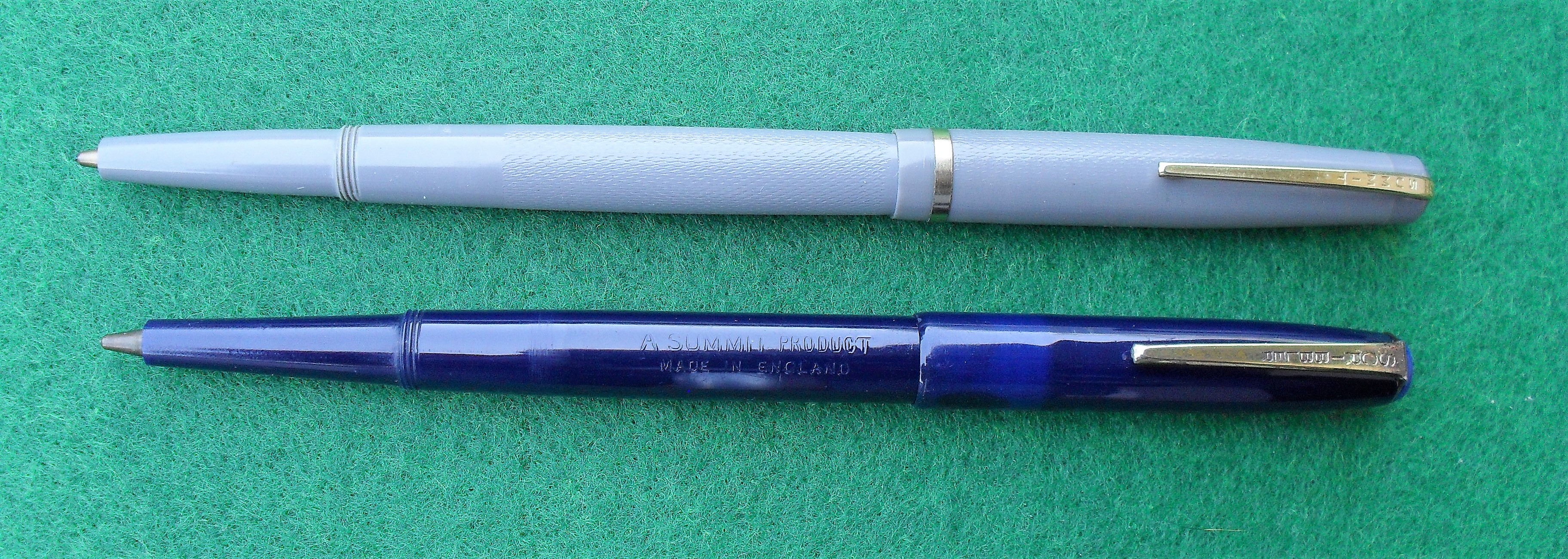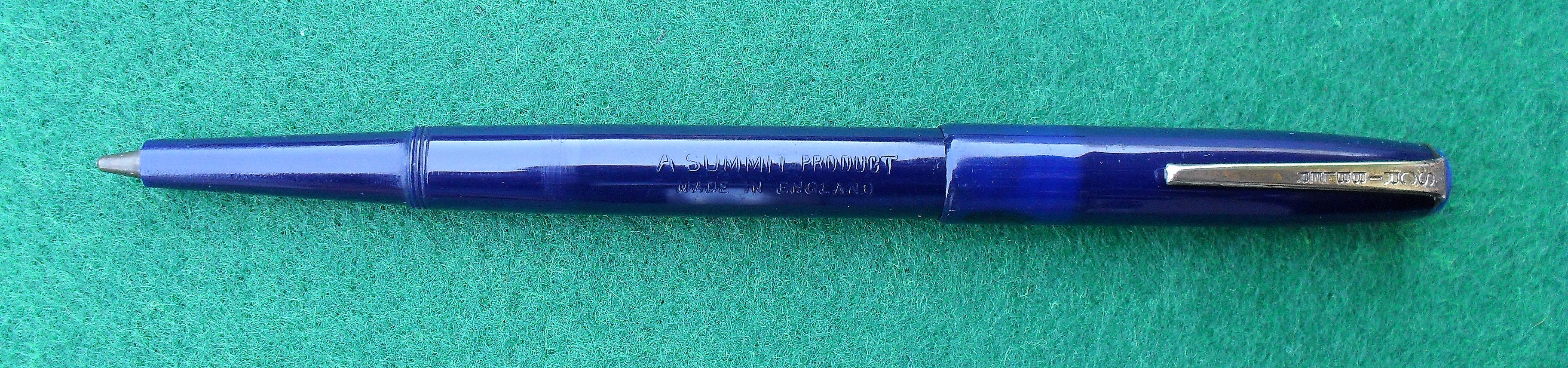 Un’avventura quasi forzata, perché l’avvento di questo nuovo strumento di scrittura ha stravolto il mercato, grazie alle sue qualità pratiche ed al basso costo. Nessun grande produttore di stilografiche può sottrarsi alla competizione ed anche Summit fa il suo passo, proponendo una penna con qualche pregio: cappuccio a vite, inserimento del refill molto pratico, tramite un fondello svitabile, materiale di buona qualità (celluloide anziché plastica ad iniezione) e clip dorata.