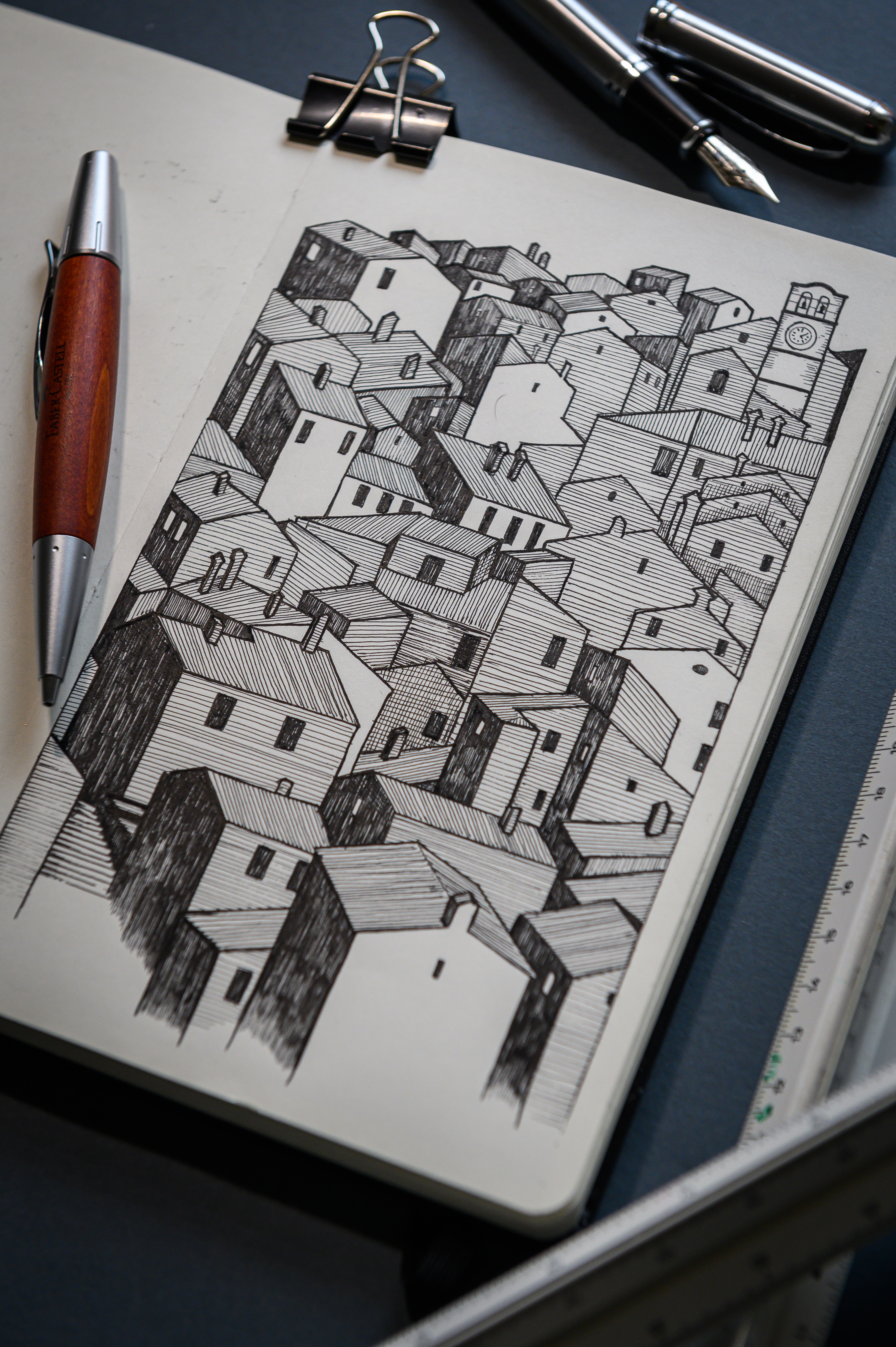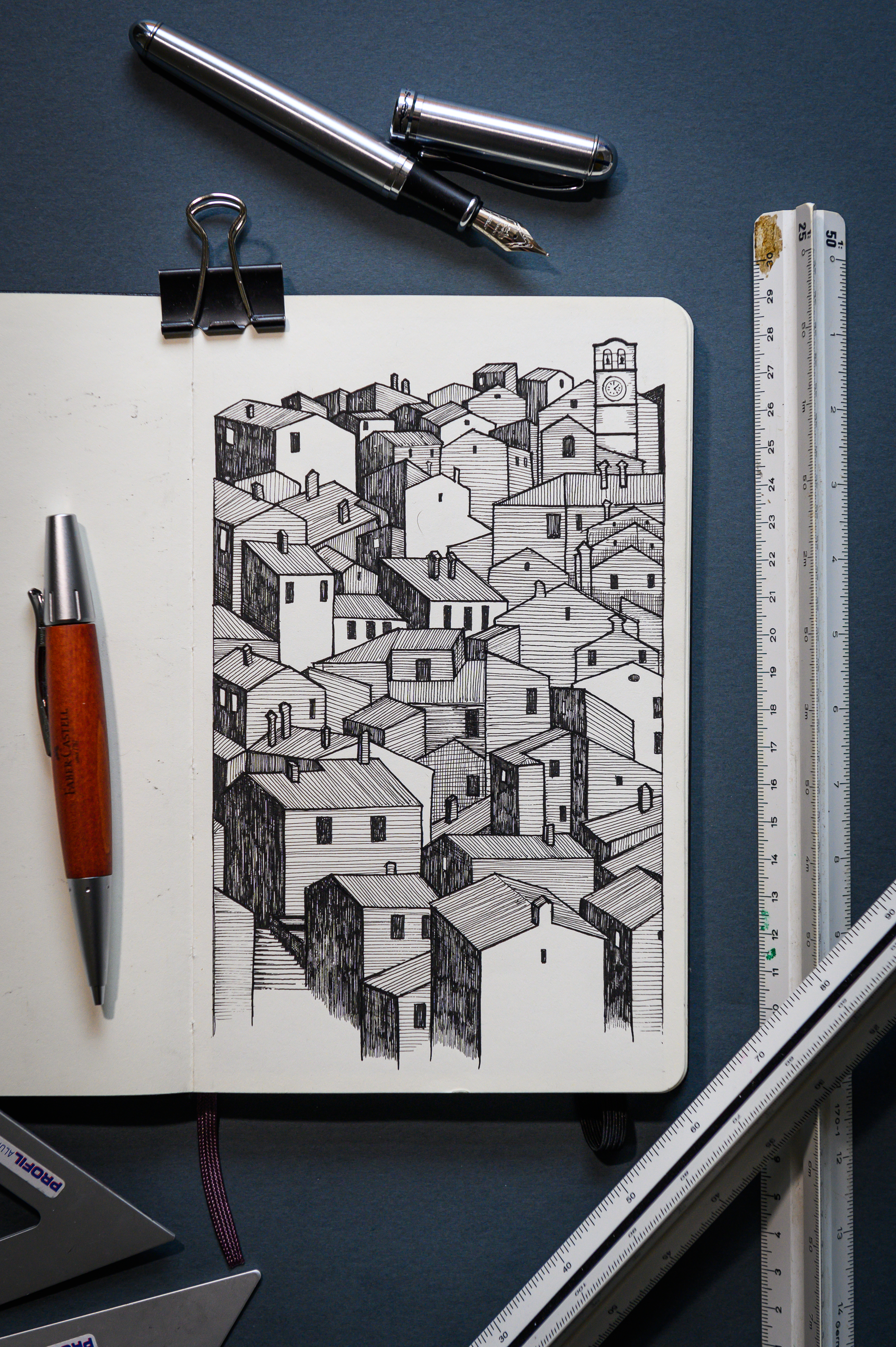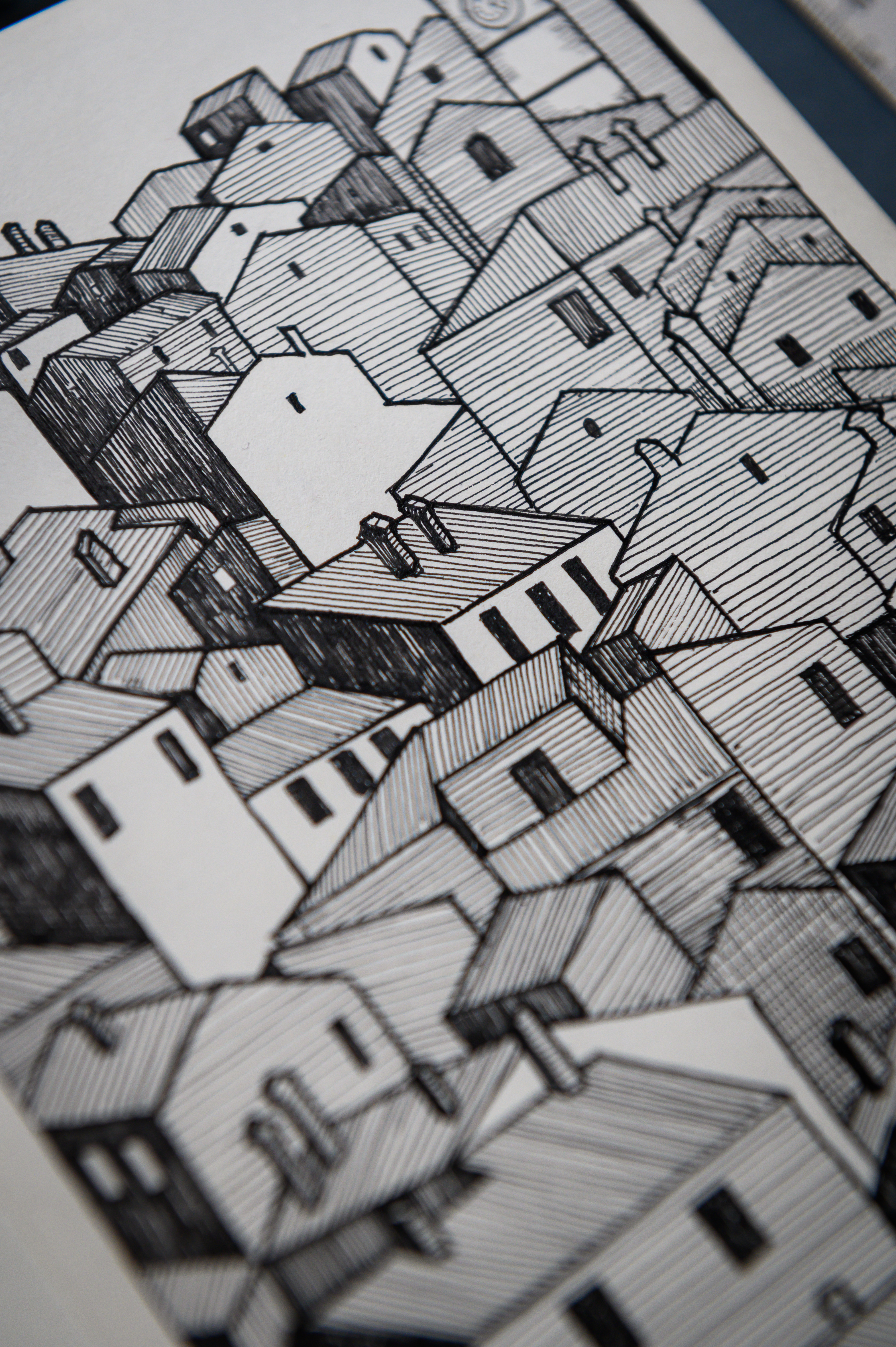 Il mio preferito è il paese rappresentato sul notebook, veramente delizioso nella semplicità delle linee e dei chiari-scuri.