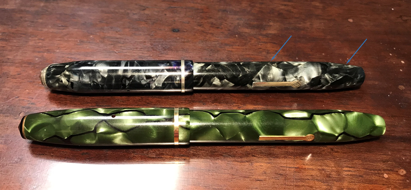 Ho evidenziato con le frecce azzurre le visibili linee di giunzione del tortiglione sul corpo penna. La penna in galalite in primo piano è priva di queste giunture.