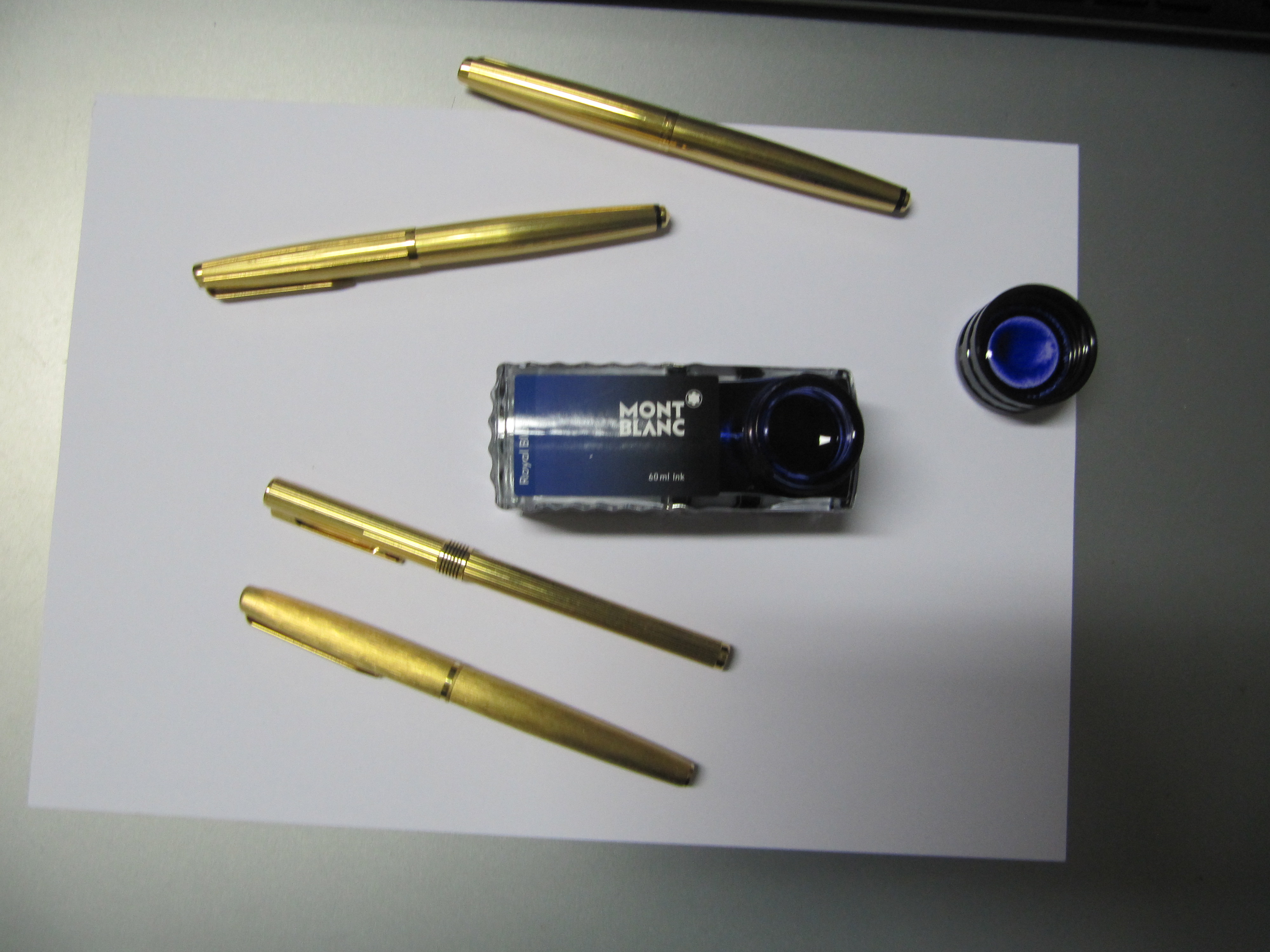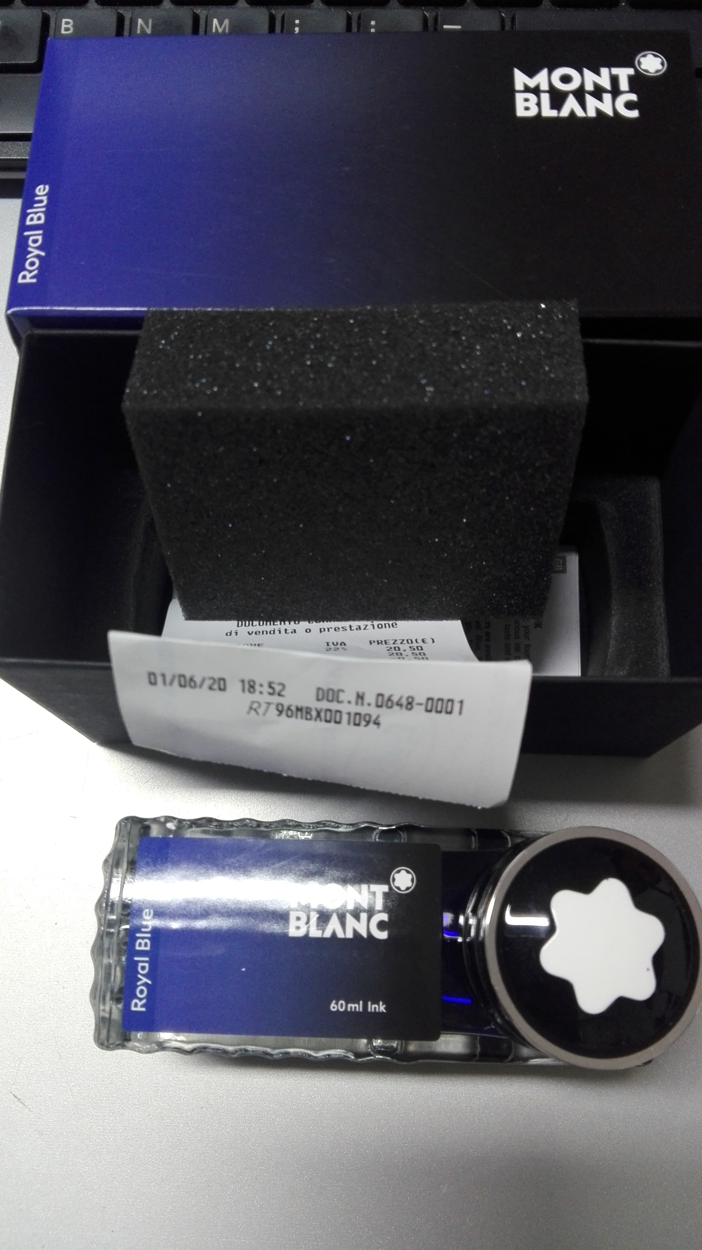 Il Royal Blue Montblanc è un ottimo inchiostro con una tonalità di blu vivo seconda solo al Baystate Blue ma senza i problemi di quest'ultimo; molto fluido, asciuga rapidamente ed il colore rimane brillante nel tempo, ottimo su qualsiasi pennino. Visto anche il contenuto generoso del calamaio, che fa la sua bella figura sulla scrivania, non è neanche eccessivamente oneroso.