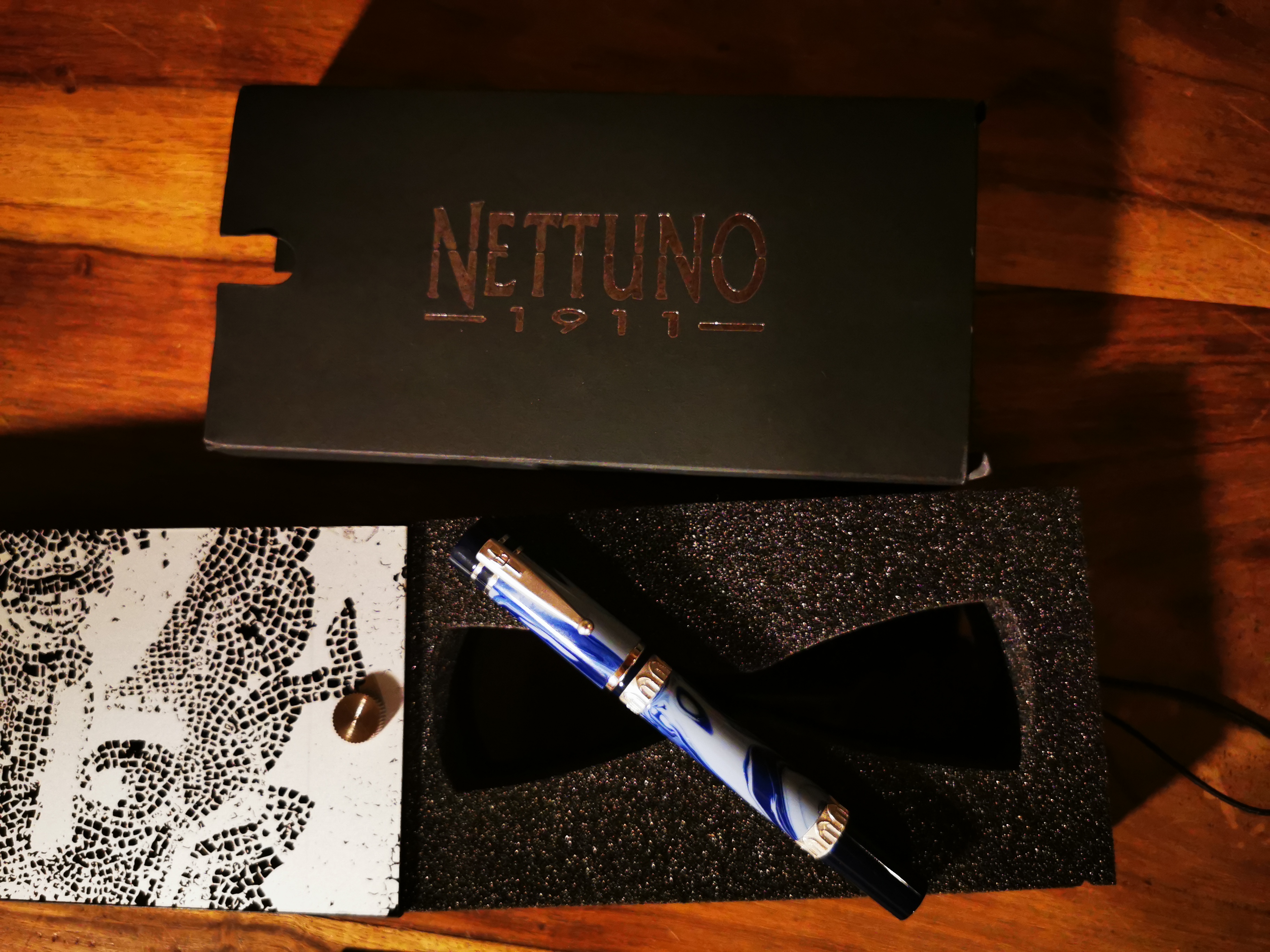 il cartoncino è un po' povero se lo paragoniamo al prezzo di listino della penna ma andando al contenuto, la scatole è un blocco di schiuma sagomata a clessidra con un coperchio che rappresenta un mosaico di Nettuno alla vista molto bello ma anche qui per il prezzo di listino a cui viene venduta la penna (o il prezzo che si trova in commercio) si potrebbe fare di meglio.