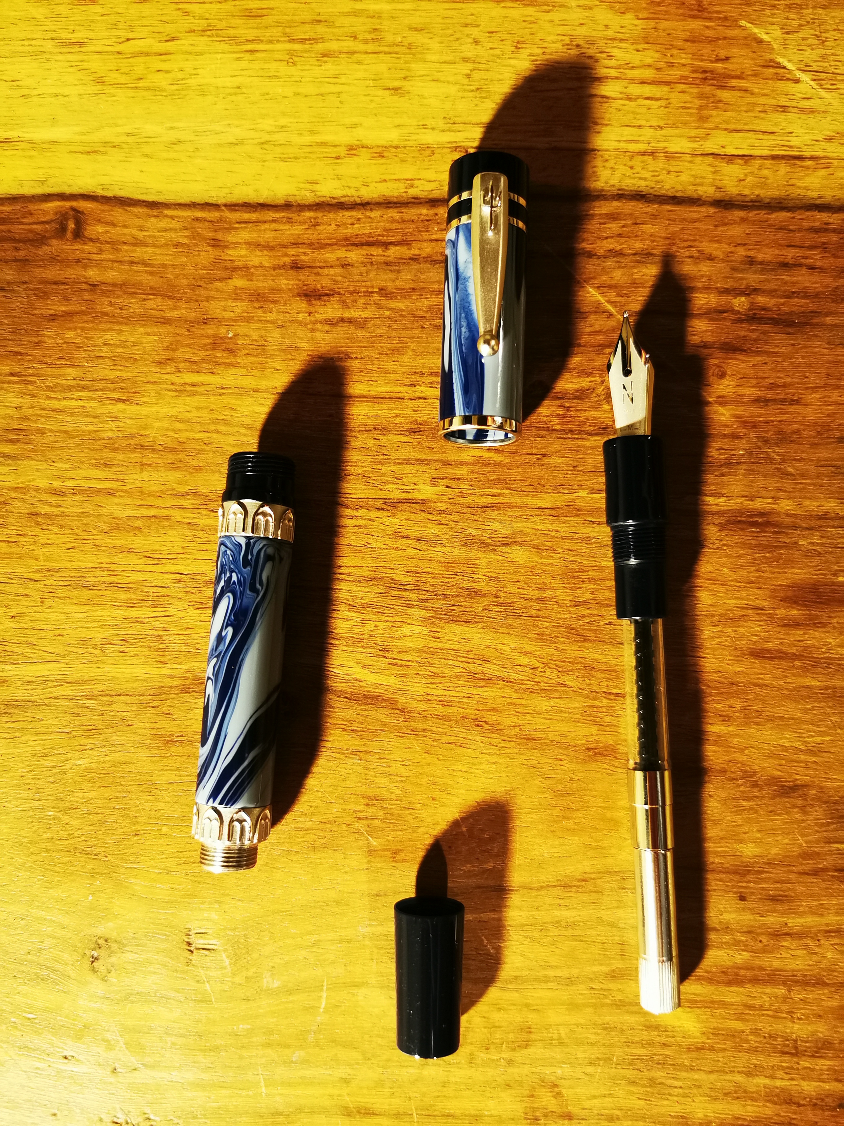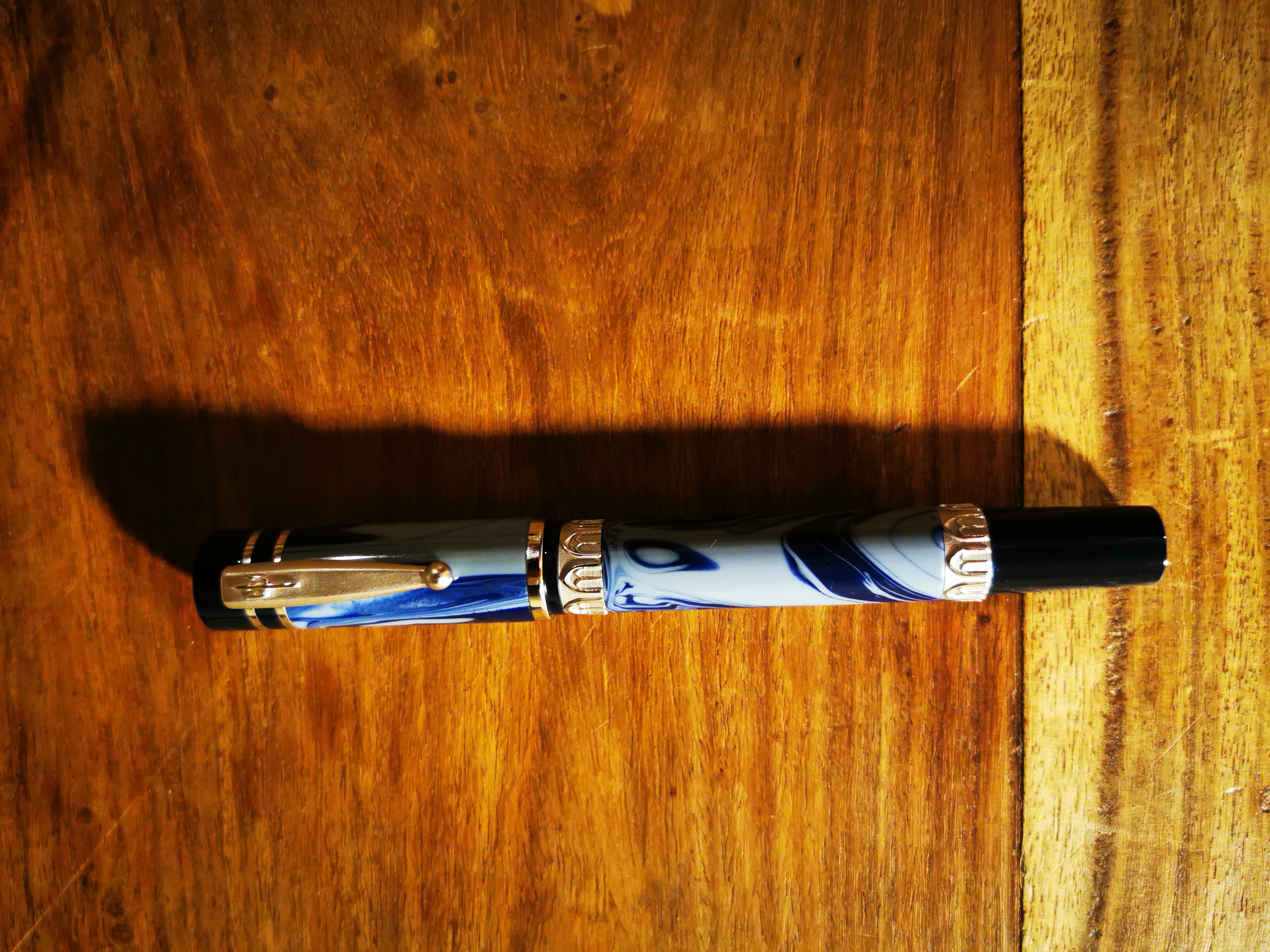 la penna è bella, le resine al tatto sono molto piacevoli e i dettagli della clip con il tridente, gli archi degli anelli, il color argento e i colori delle resine sono molto belli e armoniosi.