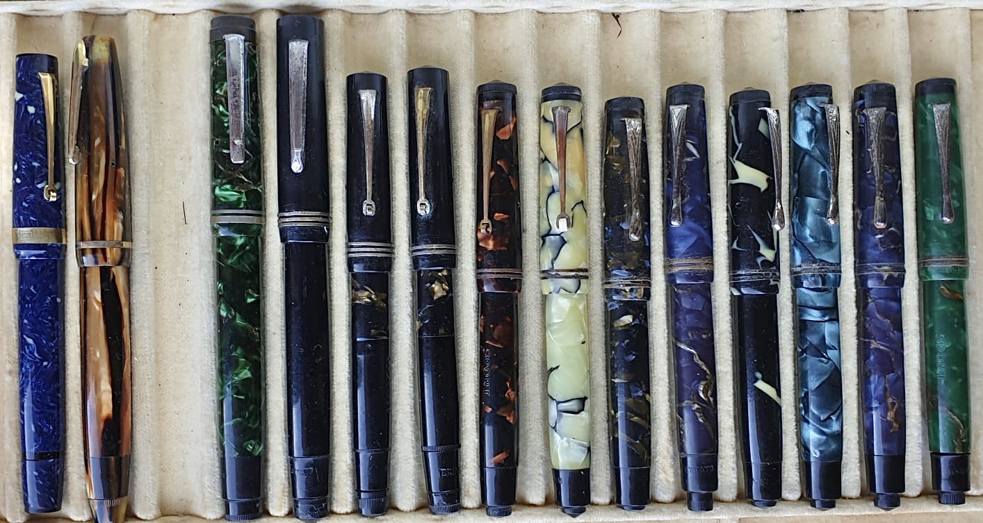 Condivido con piacere altre penne con sistema che evitava lo svitamento totale del fondello per premere il bottone. Da sinistra, VISCONTEA EXTRA E COLUMBUS EXTRA con messa in folle del nottolino terminale con due giri di vite e pressione sullo stesso. Poi le altre quattro ELMO, con torsione sul codolo con anello d'ottone a camme. Le ultime otto SPORT (linea "studenti" Monte Grappa) stesso sistema delle Columbus e Viscontea. Quest'ultimo marchio probabile, non certo, produzione della stessa Columbus.