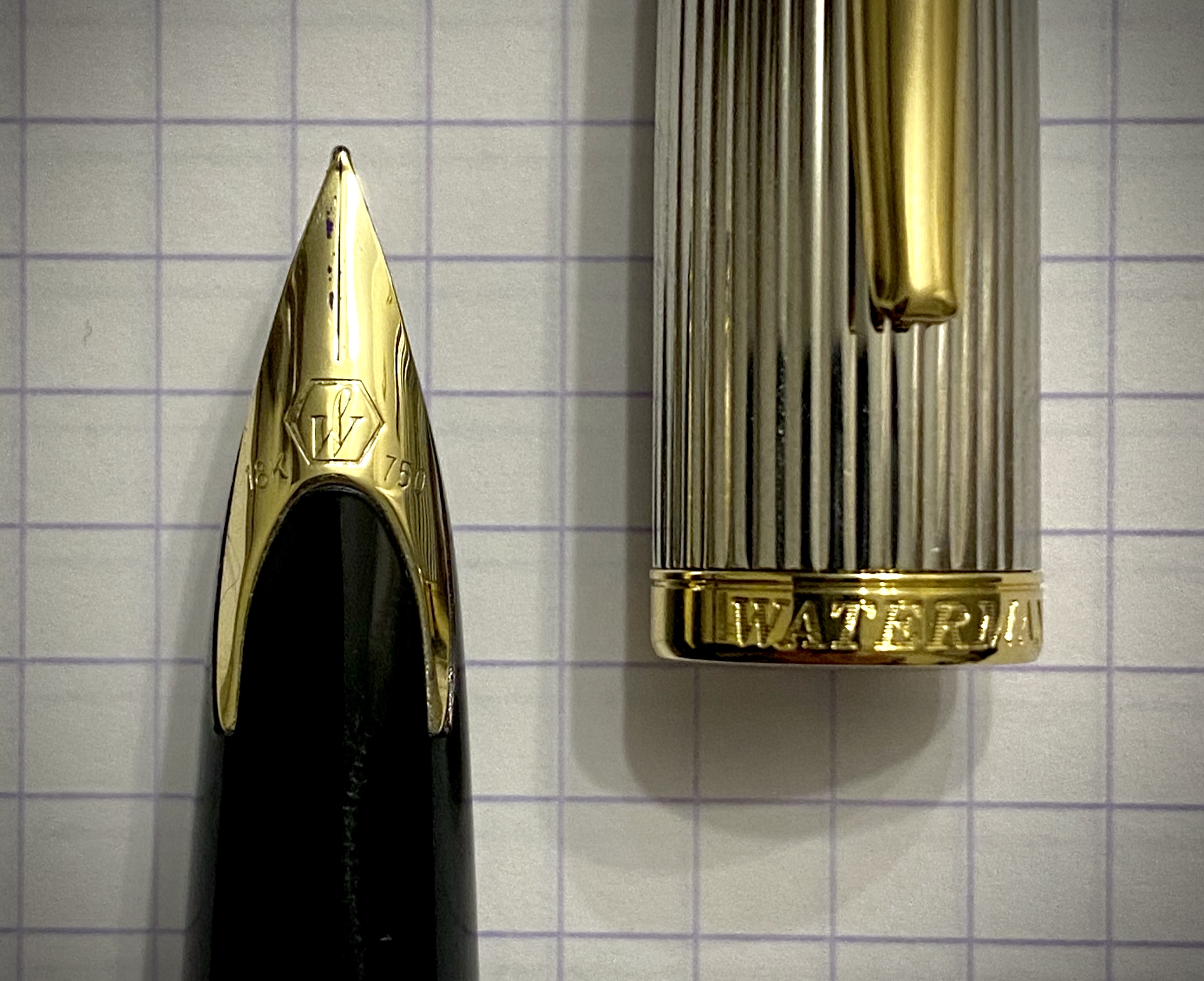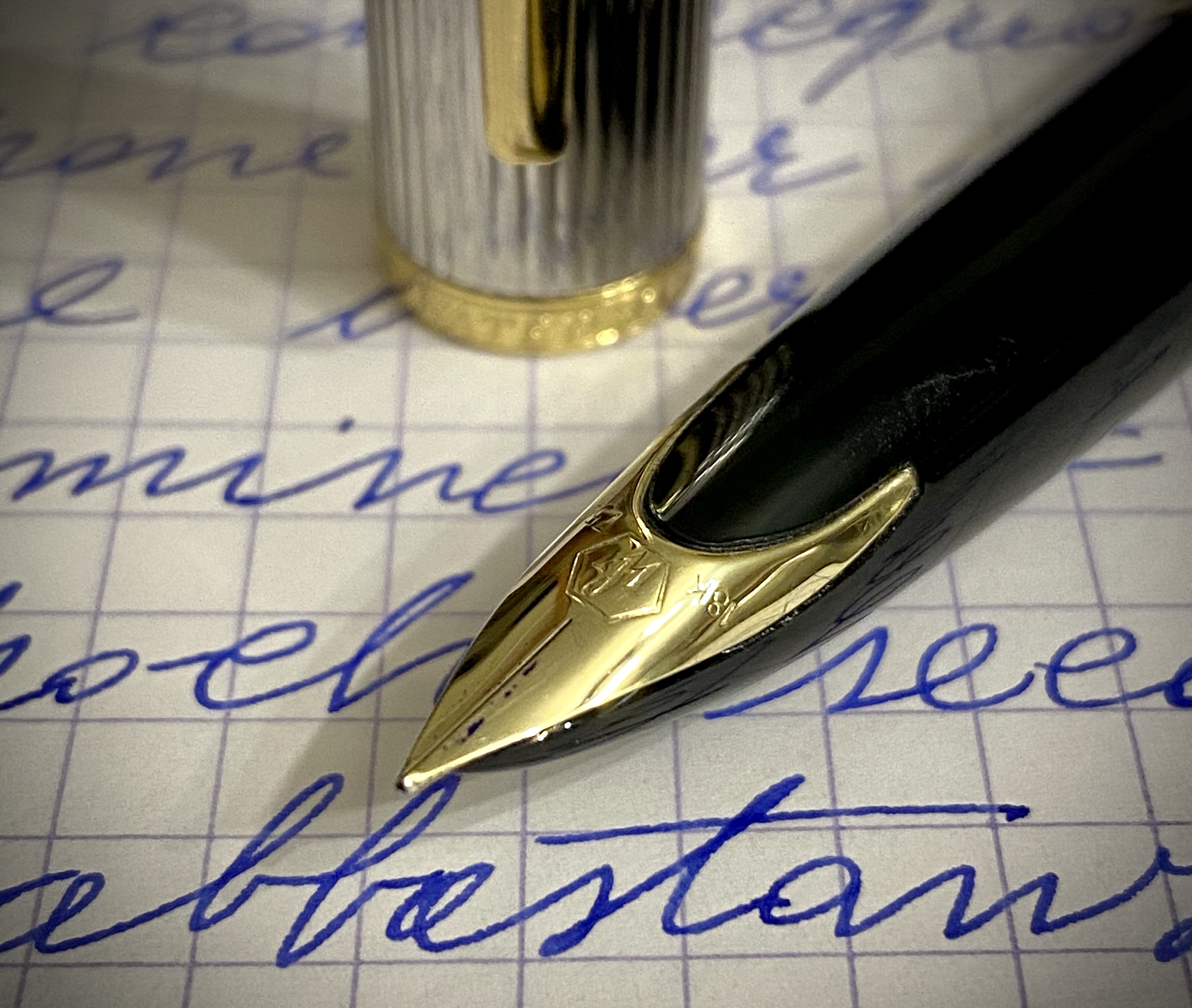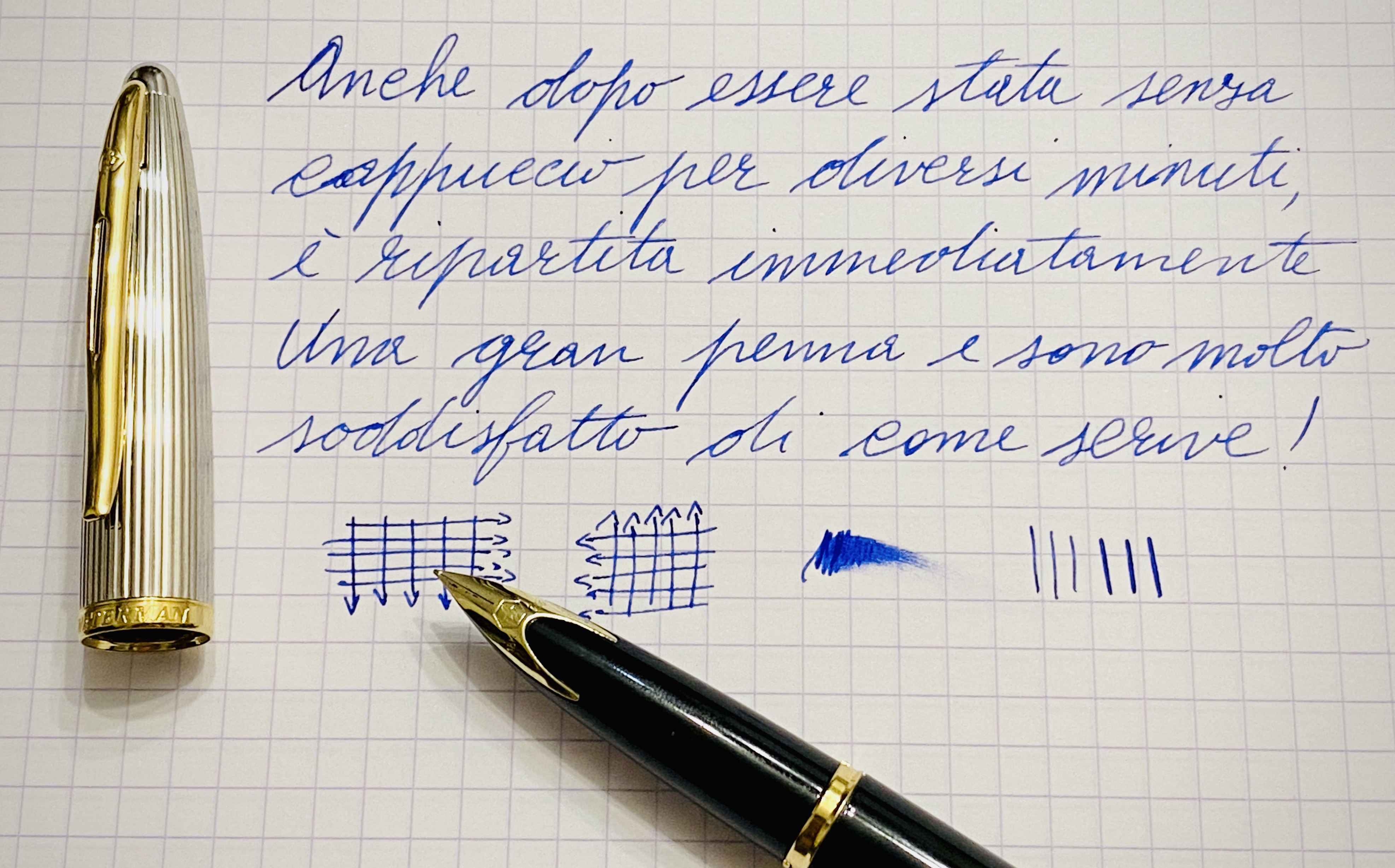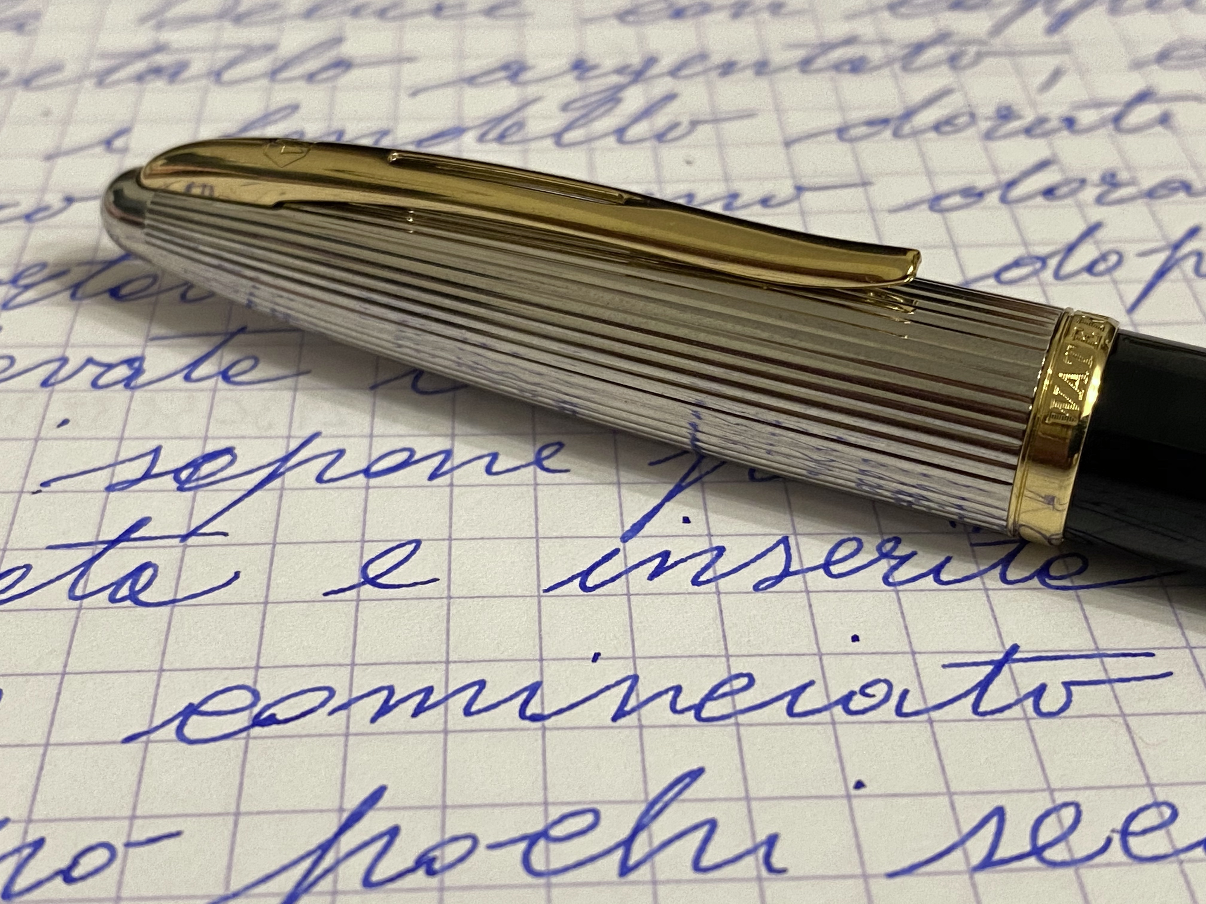 Questo tipo di pennino alla "Sheaffer" mi fa impazzire. E' un medio non abbondante, non è come il Pelikan per chi li conosce. La penna c'è l'ho da molti anni e non mai avuto problemi tipo perdite o incertezze nel tratto.Normalmente uso il suo convertitore per avere più libertà nella scelta dell'inchiostro.Il cappuccio di questa penna ha il rivestimento ottenuto con il trattamento PVD