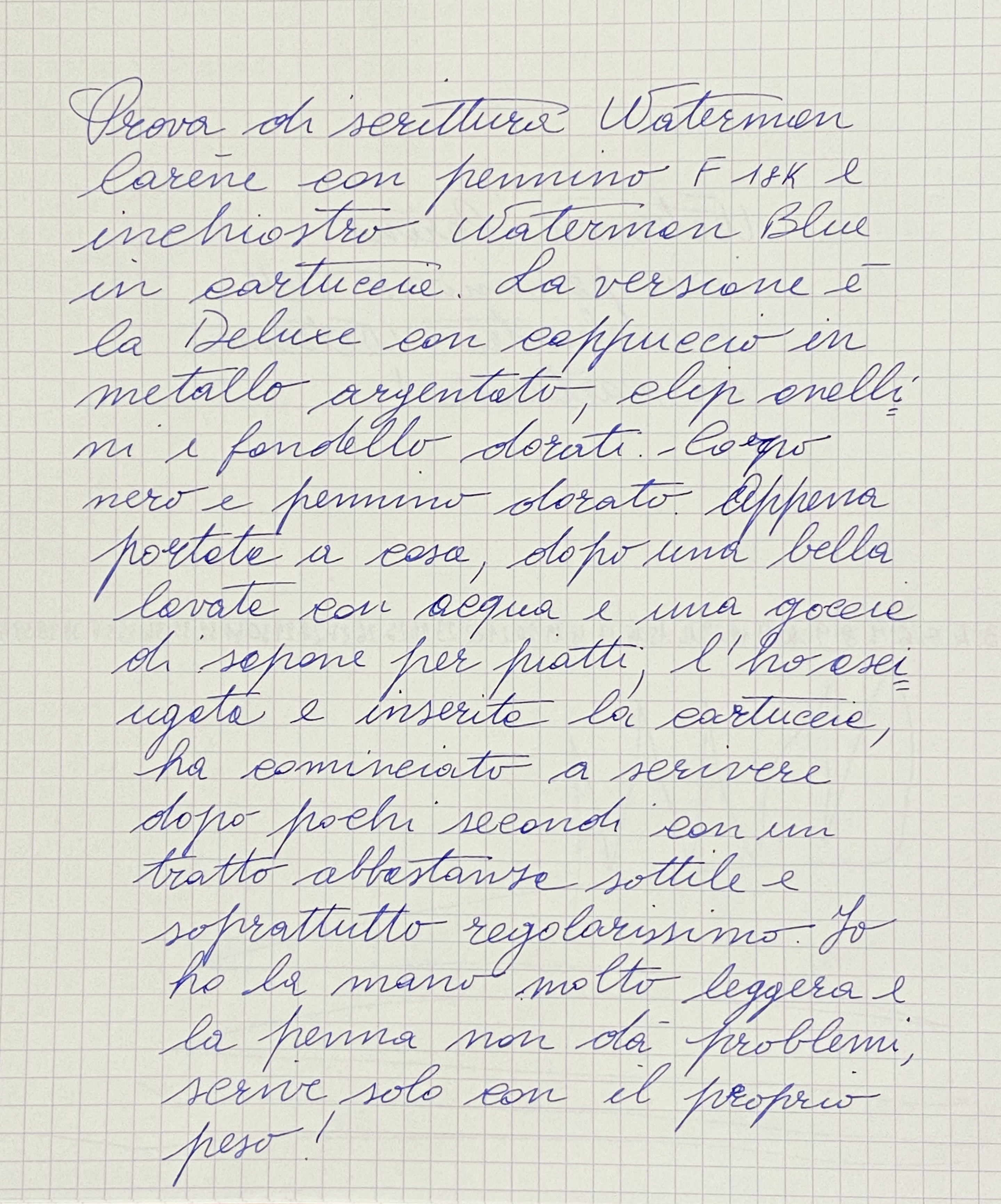 Ciao, la penna é arrivata. Che bella che è! Dal vivo è ancora meglio. Appena arrivata le ho fatto subito un bagno con acqua e una goccia di detergente per piatti. Sciacquata, asciugata di fretta, inserita cartuccia (c’era anche il converter incluso ma da l’impressione di poter ospitare veramente poco inchiostro) e dopo pochissimi secondi già scriveva in maniera impeccabile. Ho scritto di getto svariate pagine A4 e mai un tentennamento. Solo all’inizio l’inchiostro era più chiaro ma lo imputo al lavaggio appena effettuato.