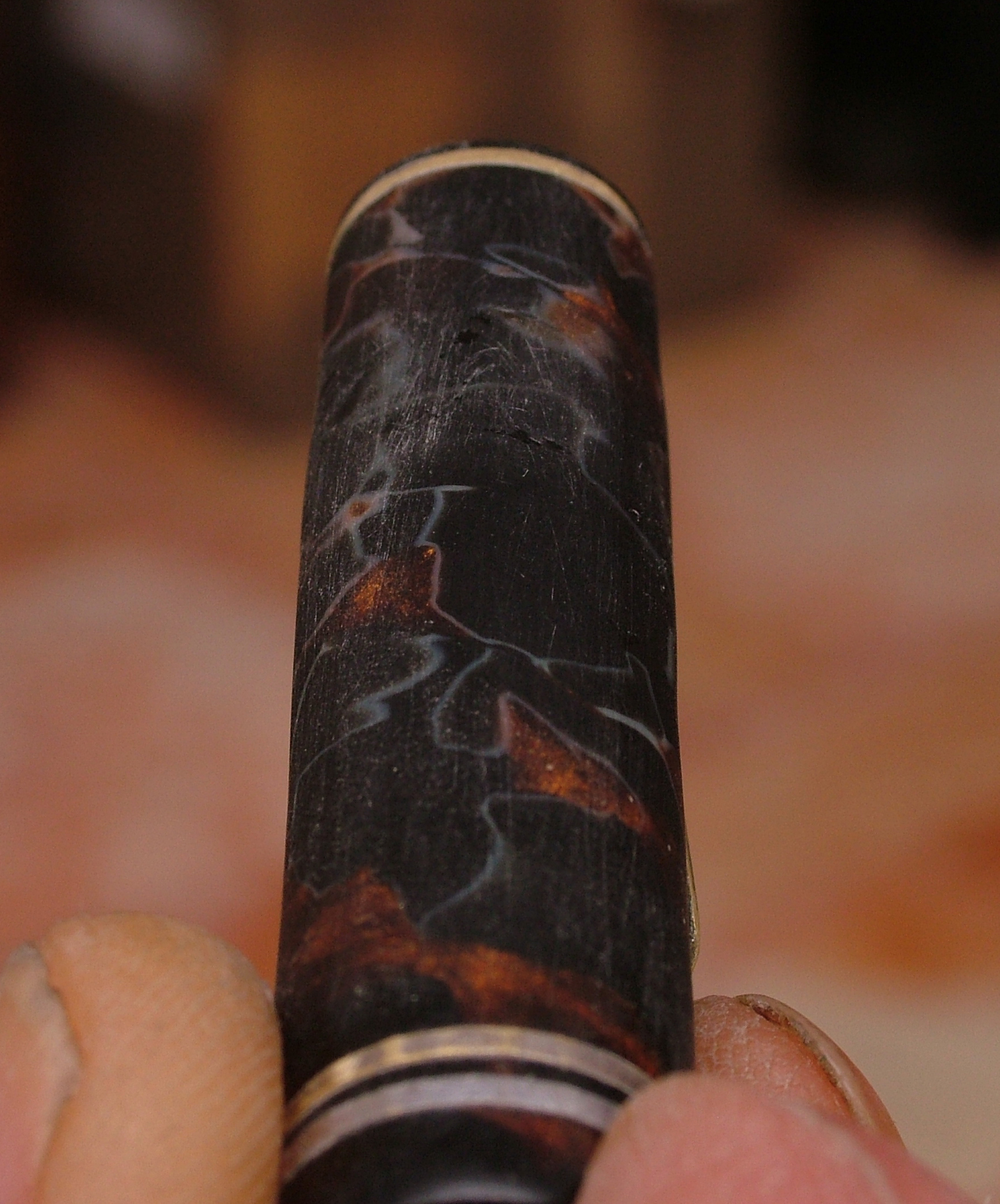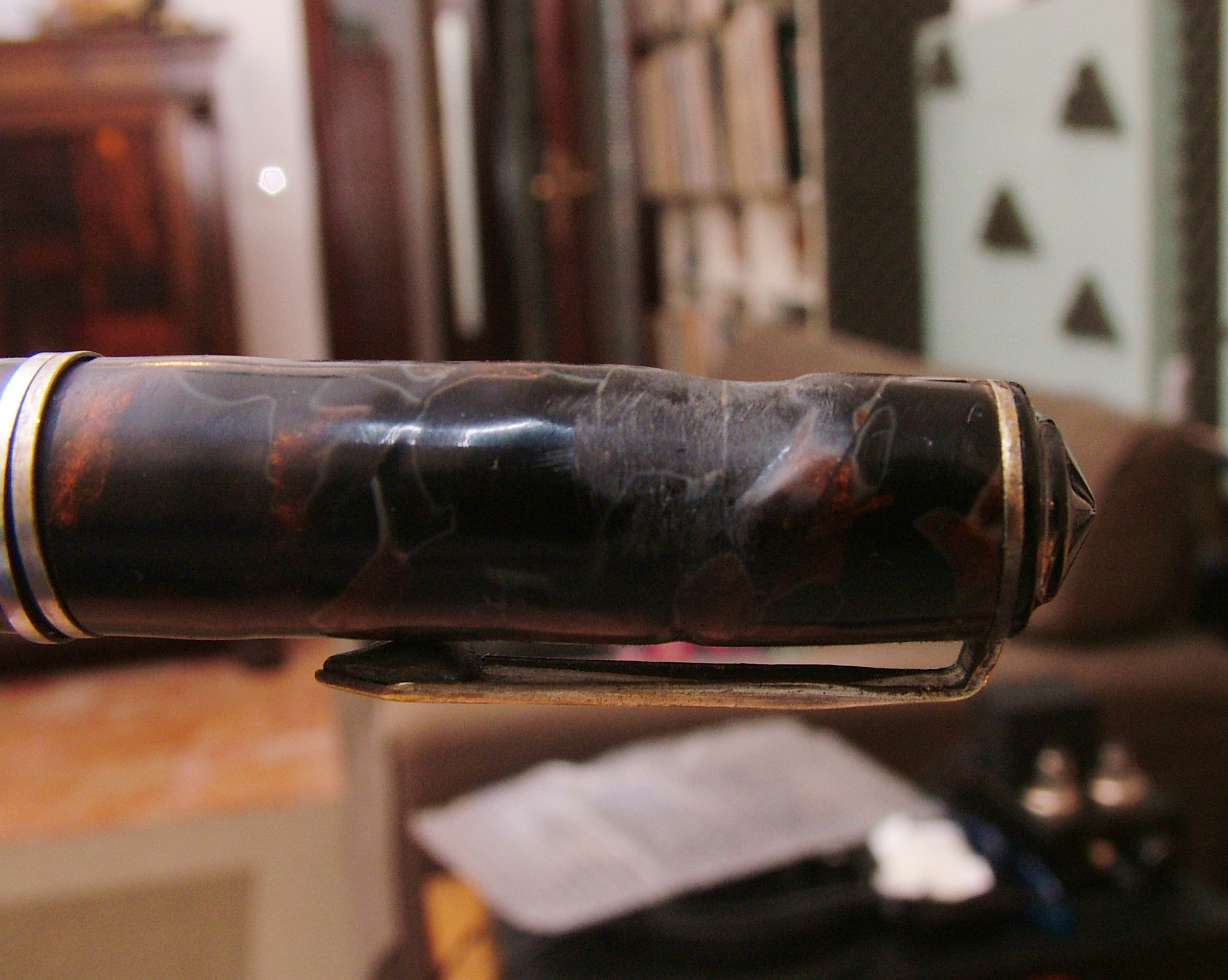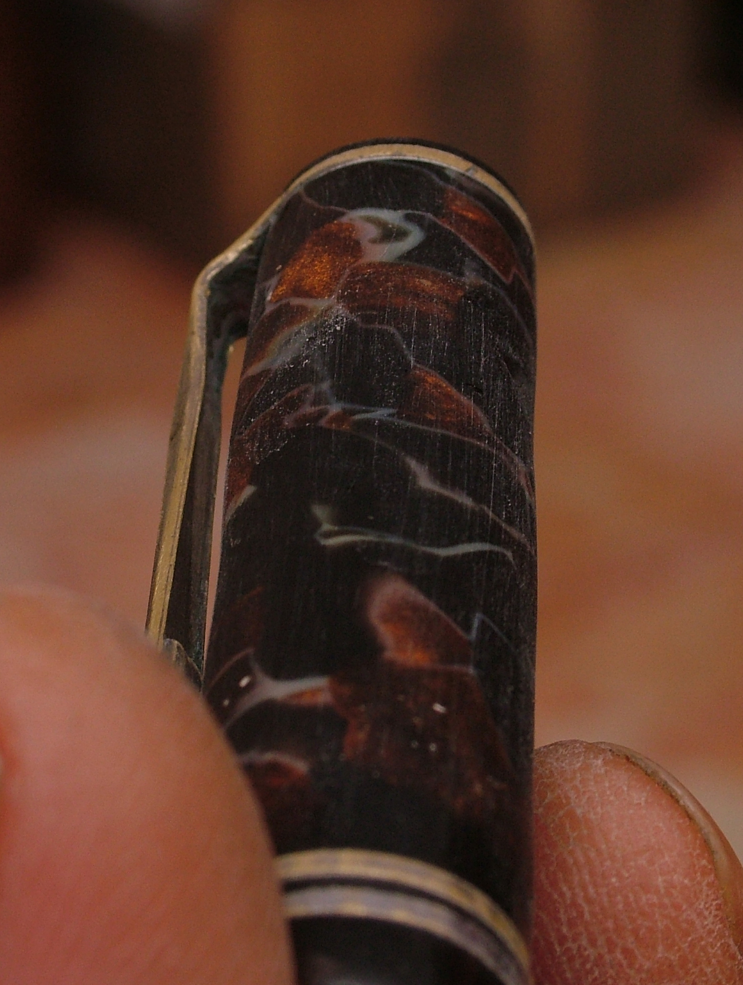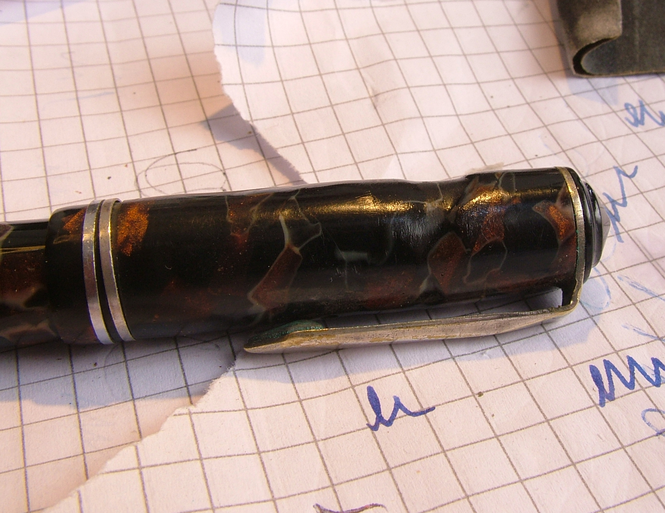 Convinto che la penna fosse in celluloide lucido e rodio la clip gli anellini e la levetta, poi risciacquo, neanche il tempo di lavarla che il materiale diventa spugnoso e caccia dei bozzoli.