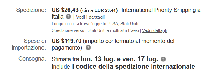 Se il venditore utilizza il Programma di spedizione internazionale di eBay, tutte le questioni logistiche della spedizione internazionale, incluso lo sdoganamento, saranno gestite per tuo conto. Poiché le spese di importazione ti vengono addebitate in anticipo, non dovrai pagare ulteriori importi al momento della ricezione dell'oggetto. Ti sarà anche fornito un codice della spedizione internazionale.