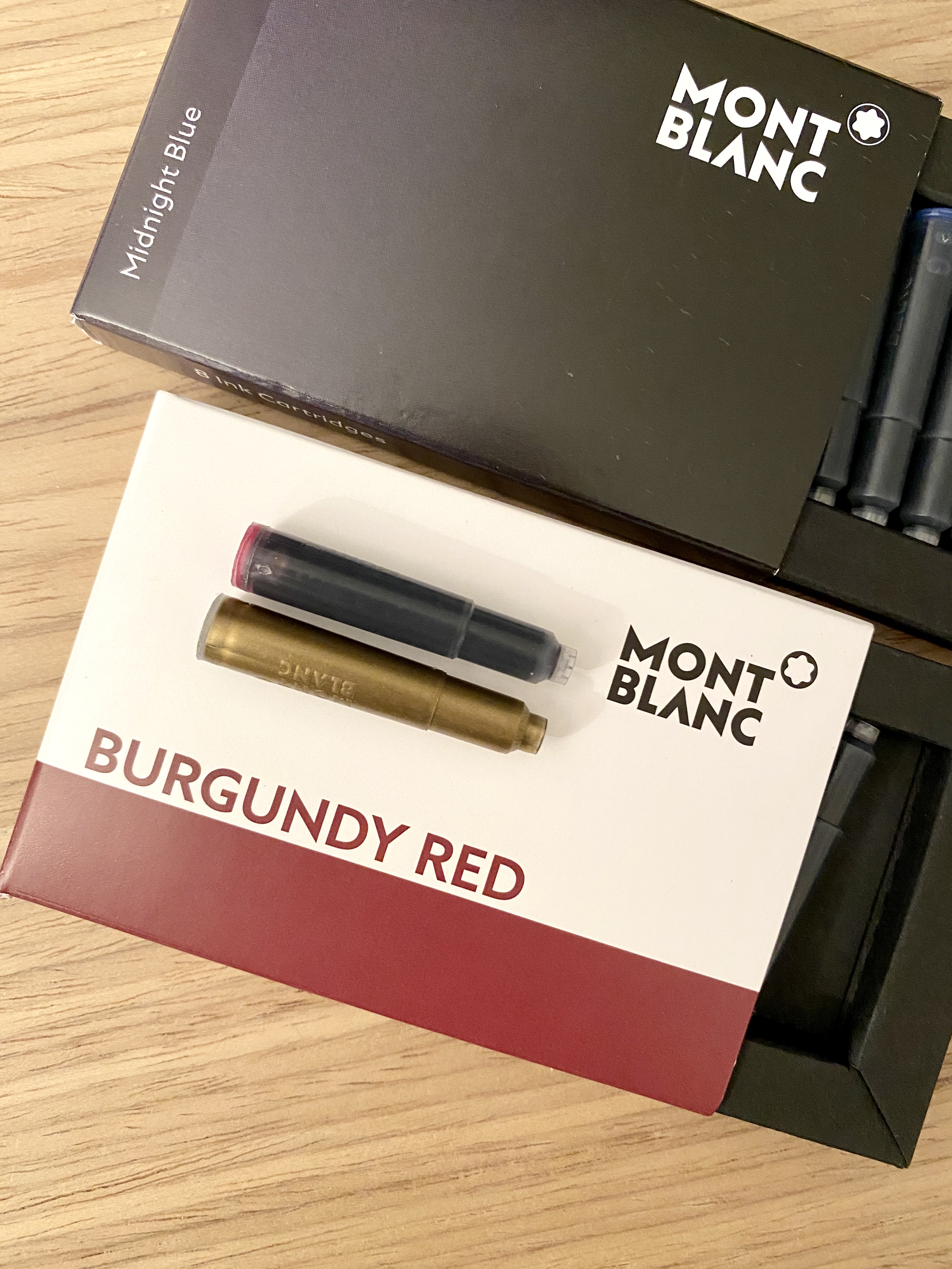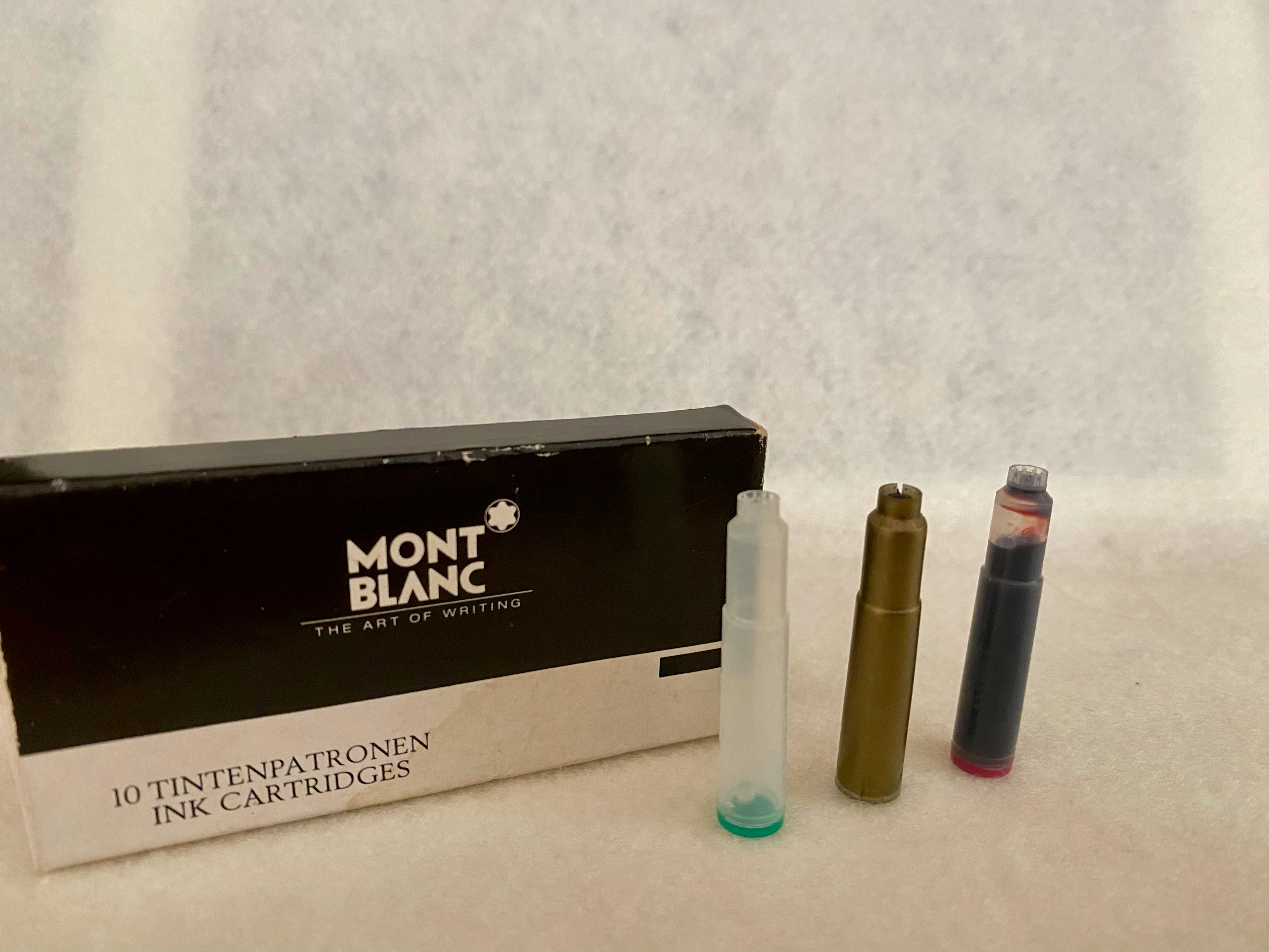 Cartuccie originali Montblanc anni ‘80 (plastica oro) e confezione confrontata con attuali vuota e piena.