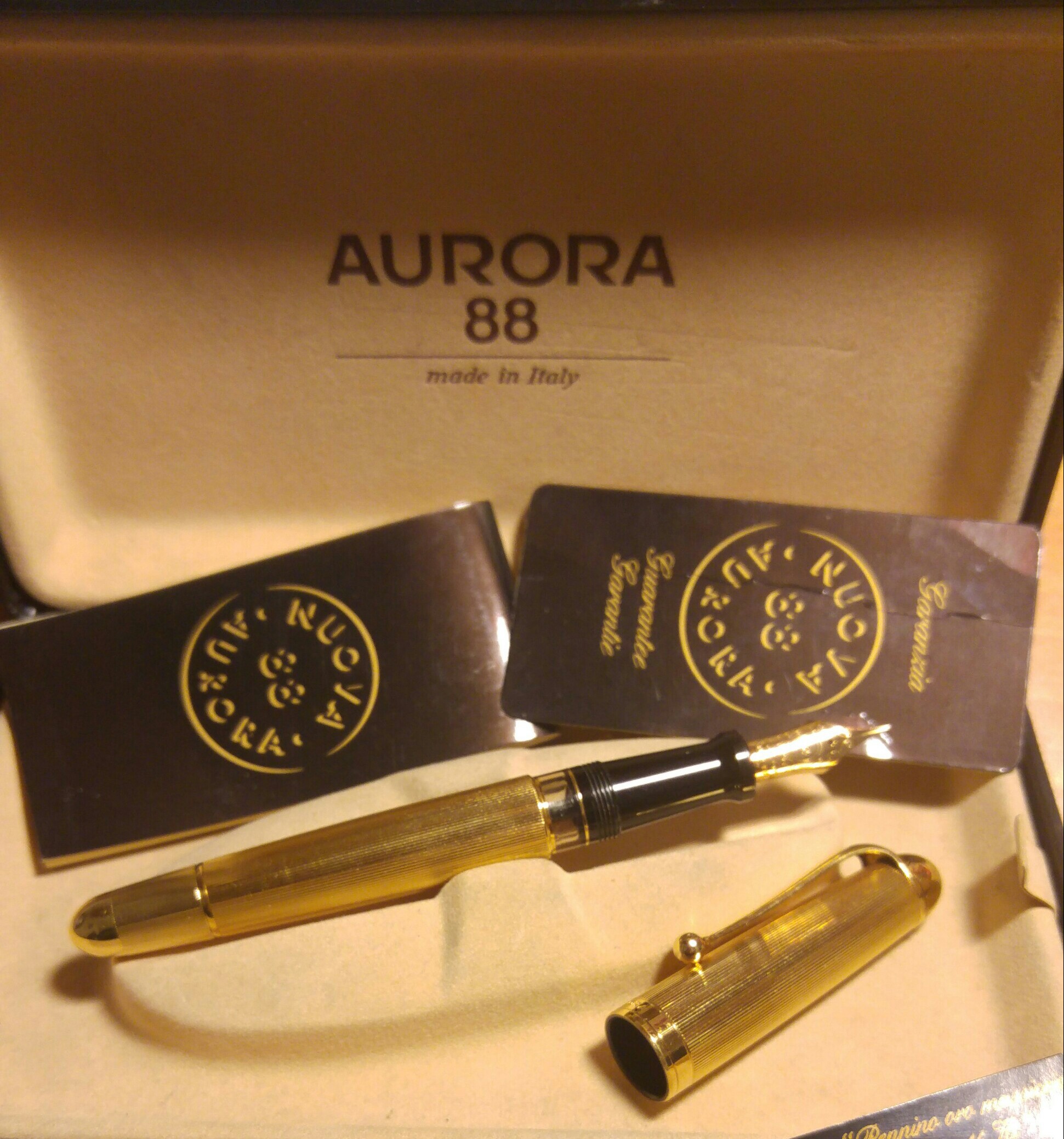 Il pennino con il marchio Aurora e rebbi corti appare sulle prime Optima e poi sulle Talentum e, naturalmente, sulle successive 88. Le Optima e le Talentum non esistono con i pennini a rebbi lunghi. Sui primi pennini con i rebbi lunghi,lato alimentatore, non veniva impressa neanche la gradazione. Ho anche io una 88 tutta dorata e mi piace molto (pennino M) anche se per molti appare un po demodé.