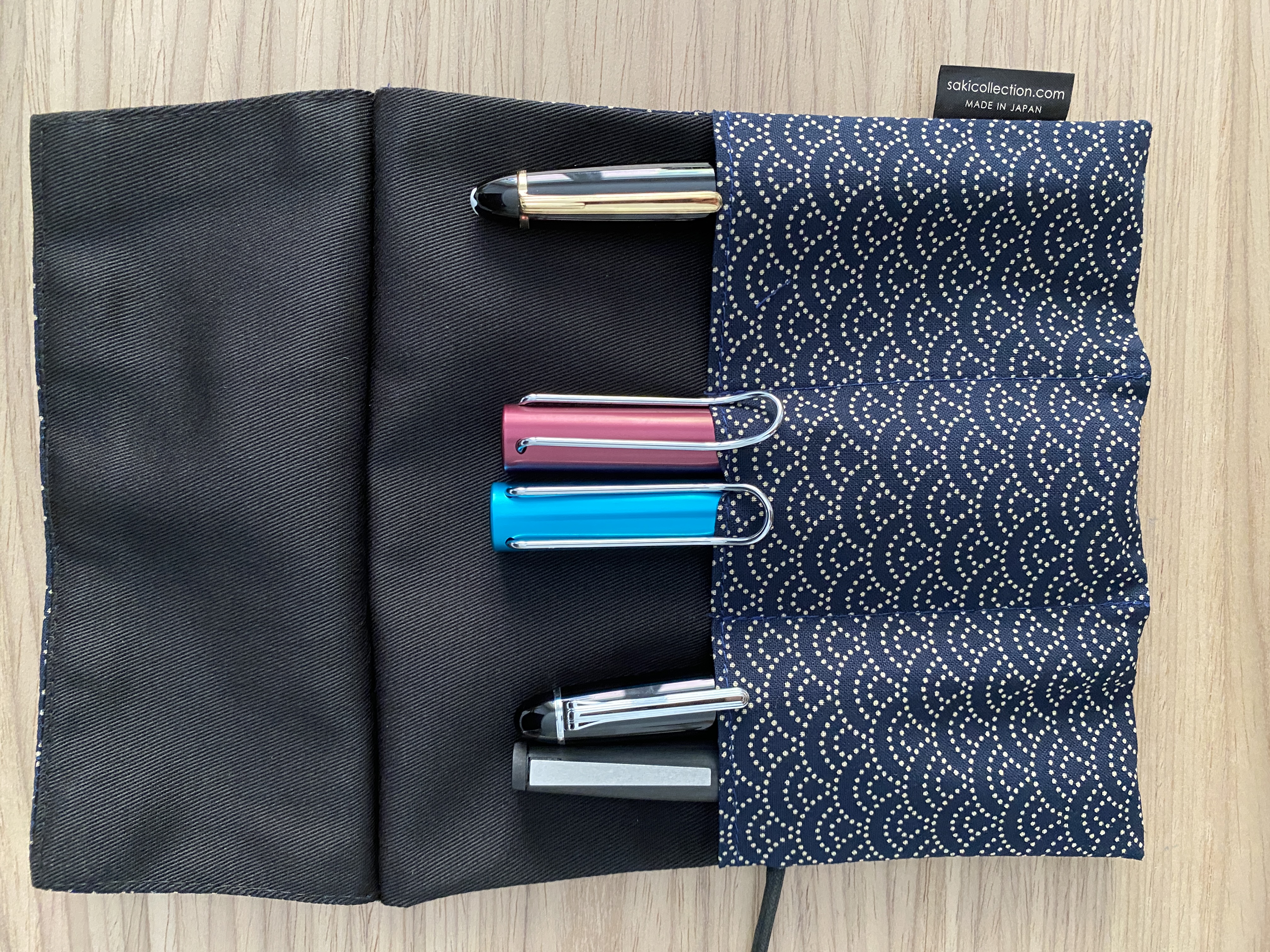 L'astuccio Saki è in cotone morbido sia internamente che esternamente. Lo spazio negli scomparti è decisamente più ampio tanto da poter contenere agevolmente tre penne di medie dimensioni. Io ho provato con una Sailor 1911 Large, una Lamy 2000 e una Montblanc 147.