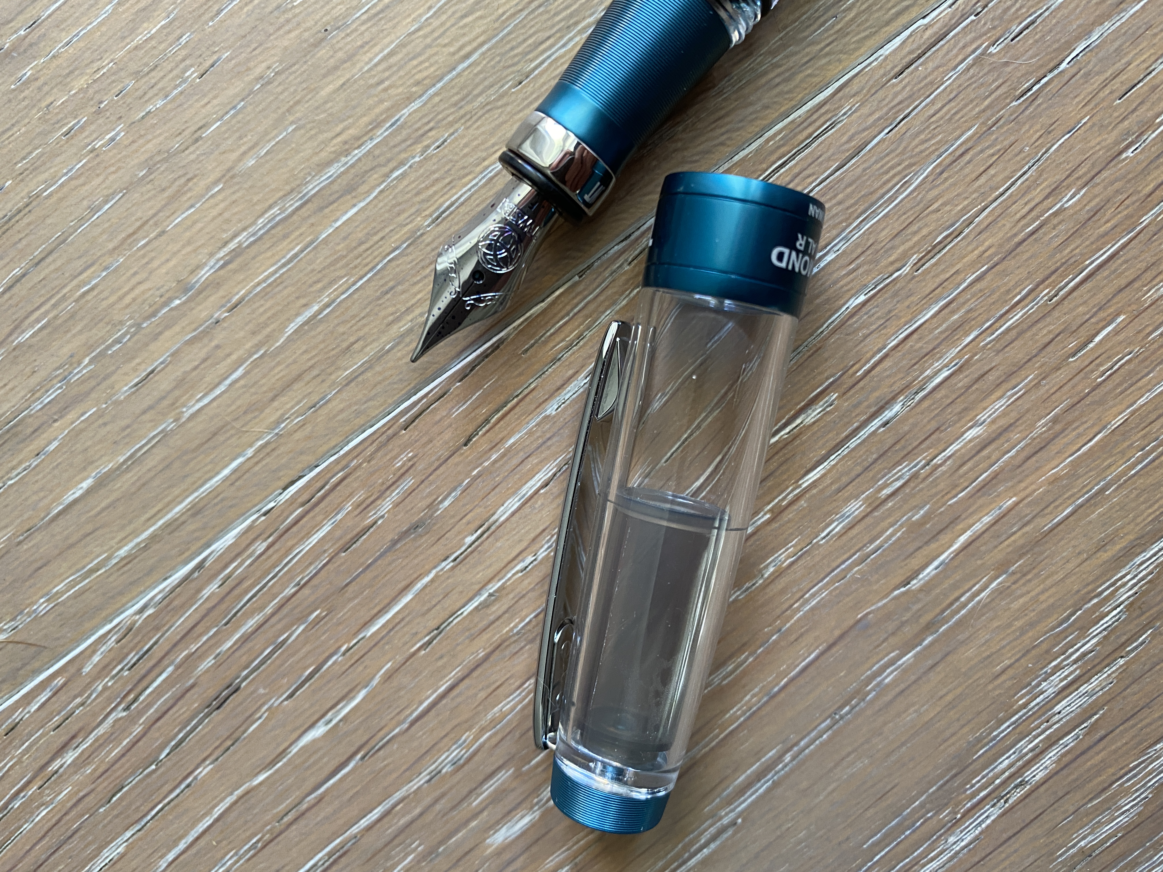 Pennino: rispetto alla ECO, che monta un pennino misura 4 mi pare, quello della Diamond è di una misura superiore quindi presumo un 5, è in acciaio rodiato e presenta le medesime lavorazioni.