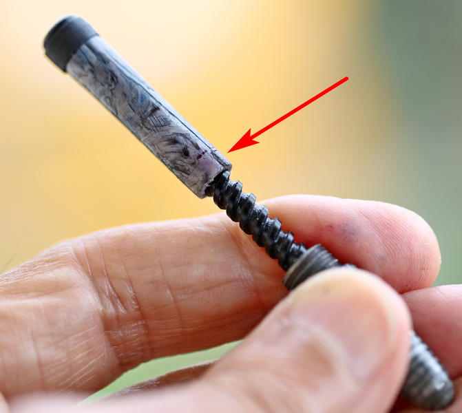 Poi i disastri sono continuati perchè lavando la penna nel lavandino ho usato inavvertitamente acqua calda e quando ho preso in mano il pistone ho sentito che si stava letteralmente spellando e sfaldando, allora ho immediatamente aperto l'acqua fredda e il pistone ha smesso di sfaldarsi ed è tornato rigido ma, purtroppo si era ristretto e la vite entrava solo con grandissimo sforzo.